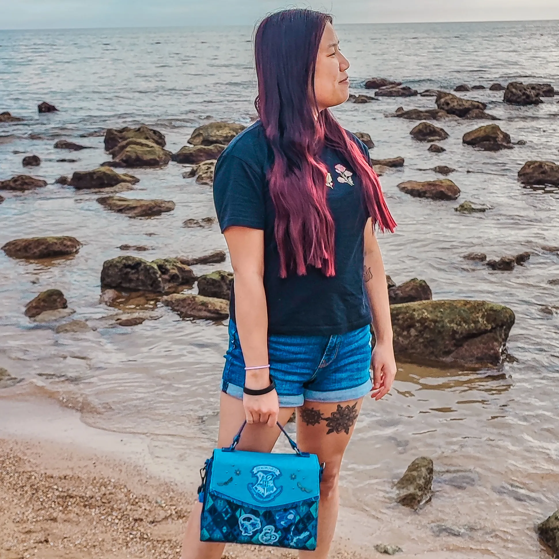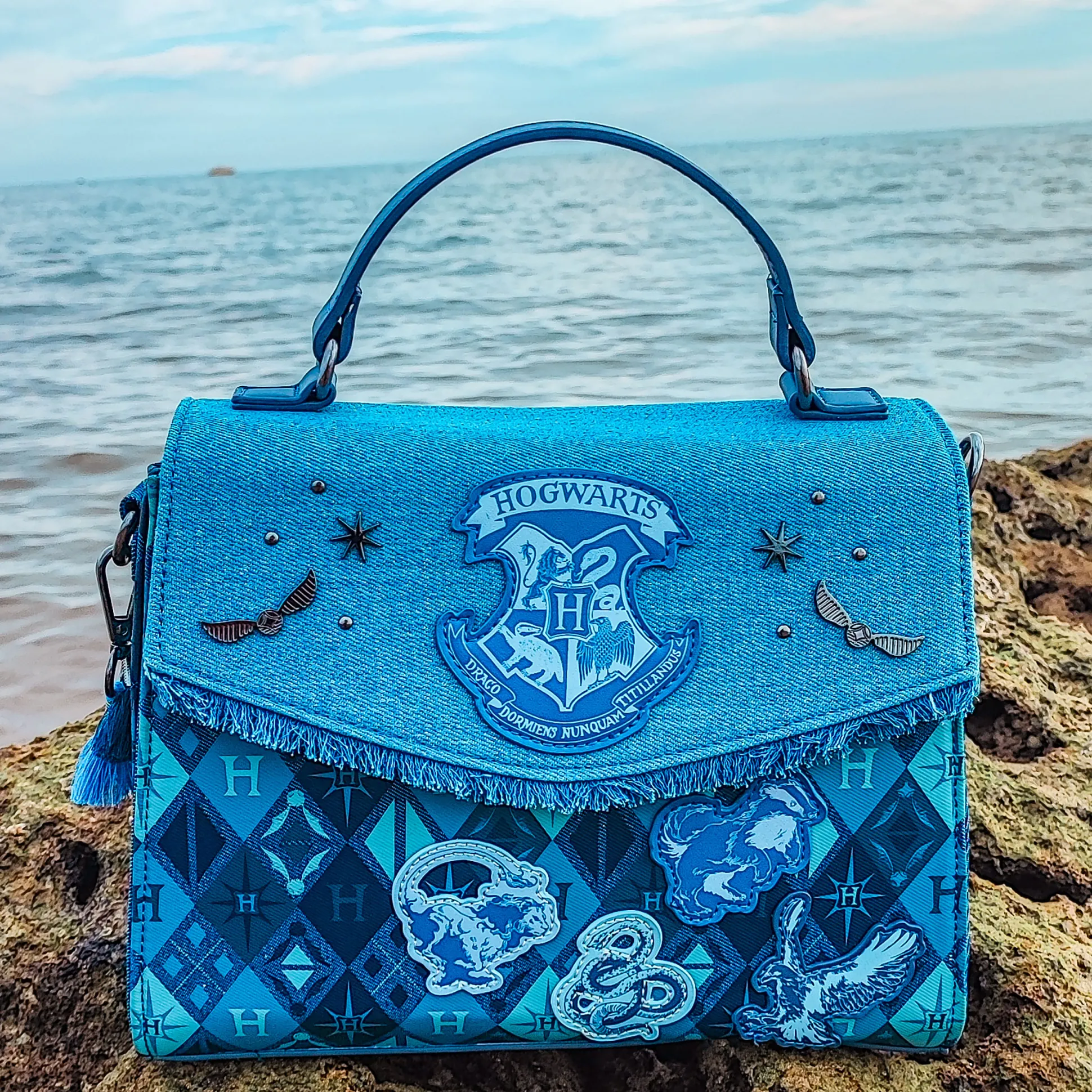 - schoudertas met Hogwarts-design in reliëf, borduursels en metalen symbolen