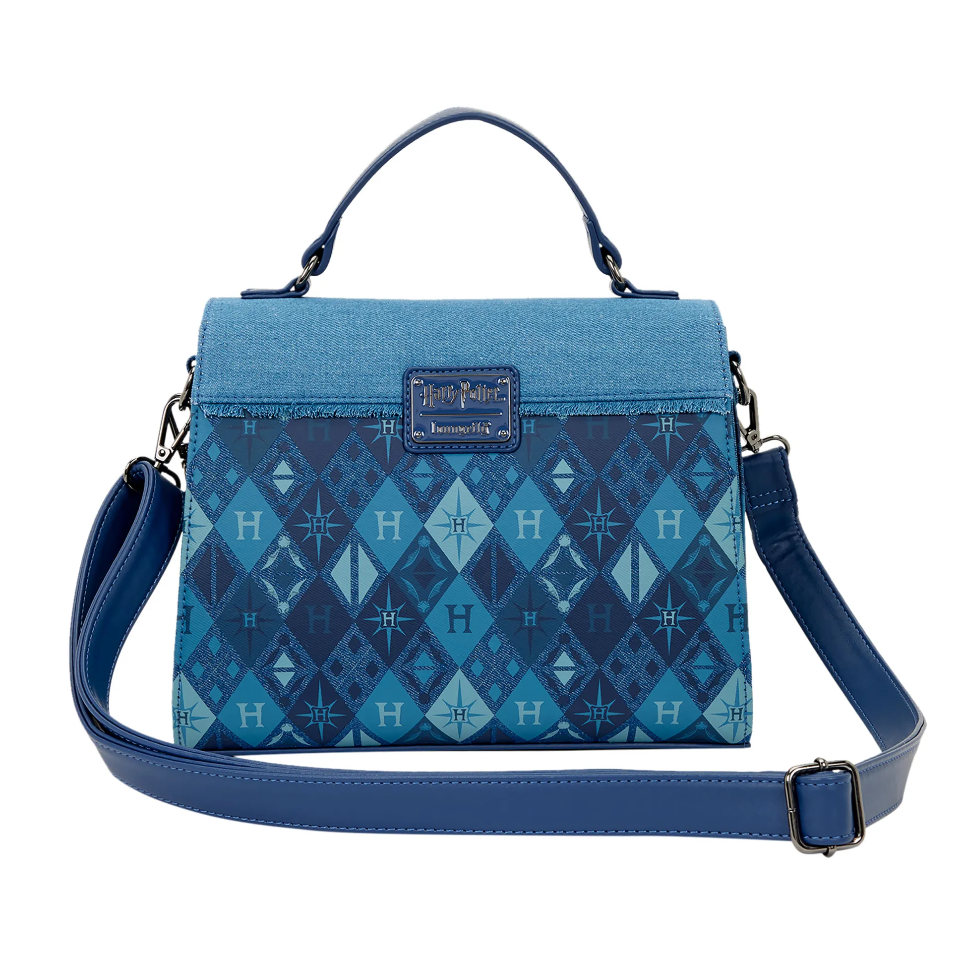 Toverstok, portemonnee, Chocokikkers – deze Hogwarts denim crossbody is klaar voor elk avontuur, van de Wegisweg tot je Dreuzel-woon-werkrit. Officieel gelicentieerde Harry Potter gear met een verhoogd Hogwarts-ontwerp, borduursels en metalen emblemen: afdelingstrots gegarandeerd. Binnenin vind je een hoofdvak met een klein steekvak en een bedrukte voering voor die extra wow. Sluiting met drukknop, handvat en een verstelbare, afneembare schouderriem. Achterop zit een metalen Loungefly-label. Afmetingen: 26 x 9 x 20,5 cm. Handen vrij, afdelingstrots in beeld – Accio tas!