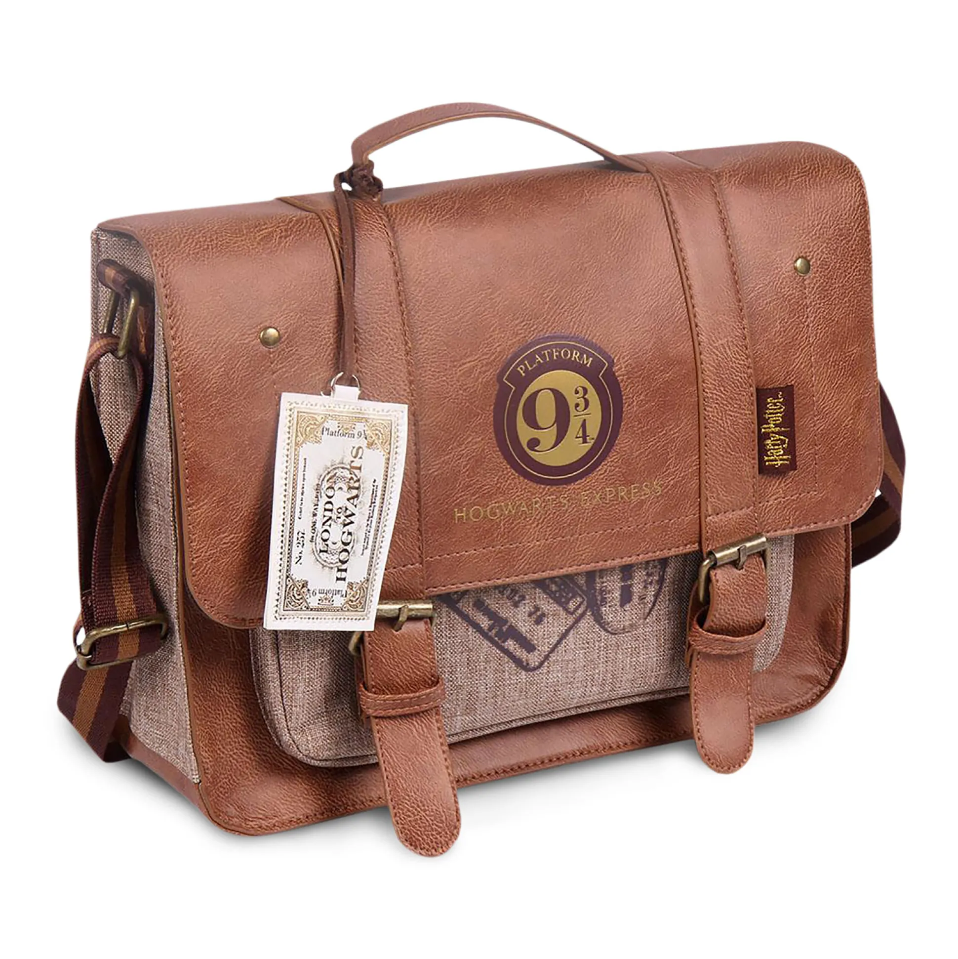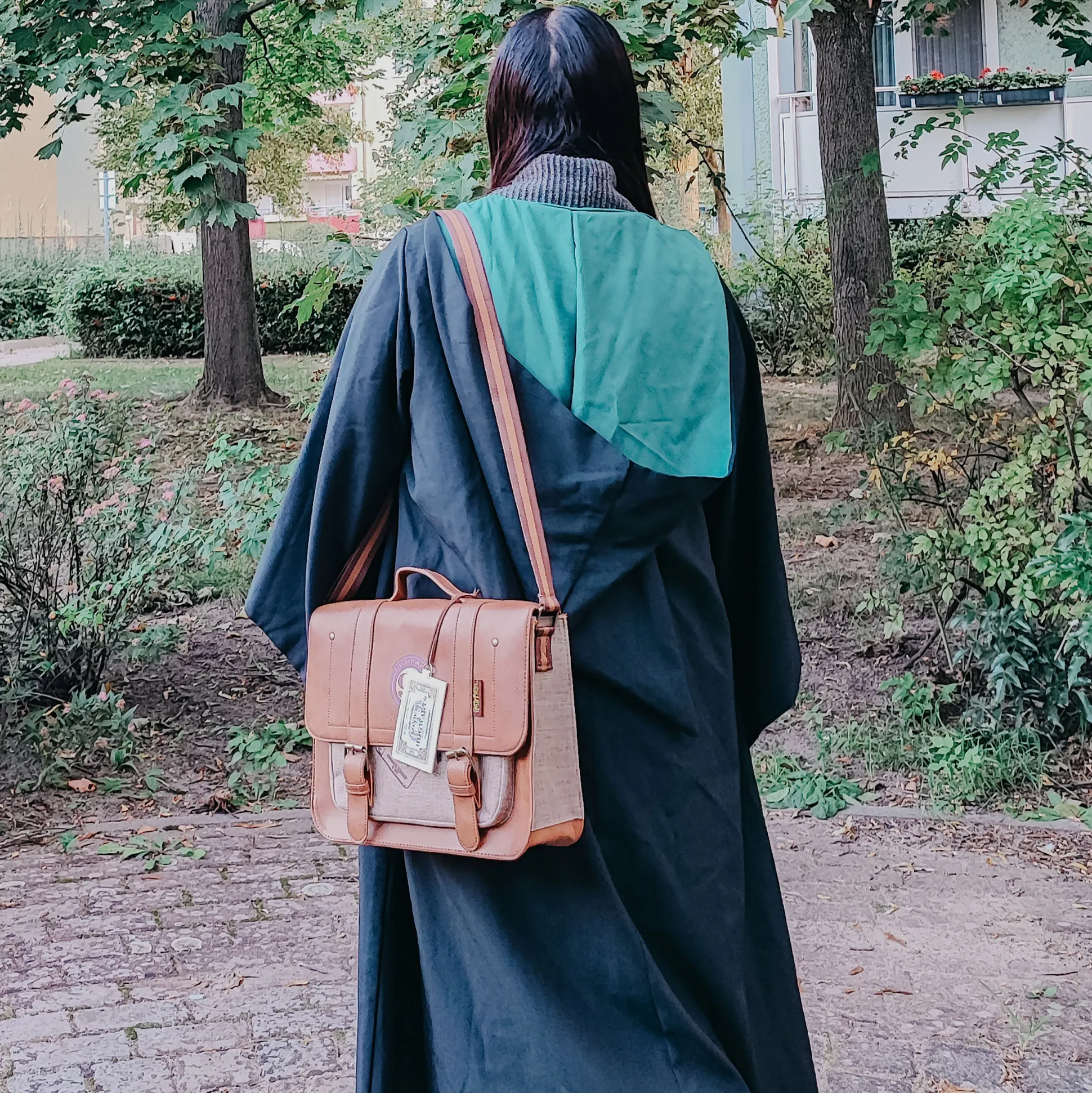Een ruim hoofdvak voor toverstokken, notitieboeken en dreuzelspul, een insteekvak voorop en een magnetische drukknoop in gesp-look houden alles op z’n plek. Draag ’m met de verstelbare schouderriem of grijp het handvat wanneer de Zweinsteinexpres binnenkomt. Het bagagelabel met naamkaartje laat uilen en conducteurs zien van wie dit pareltje is.
