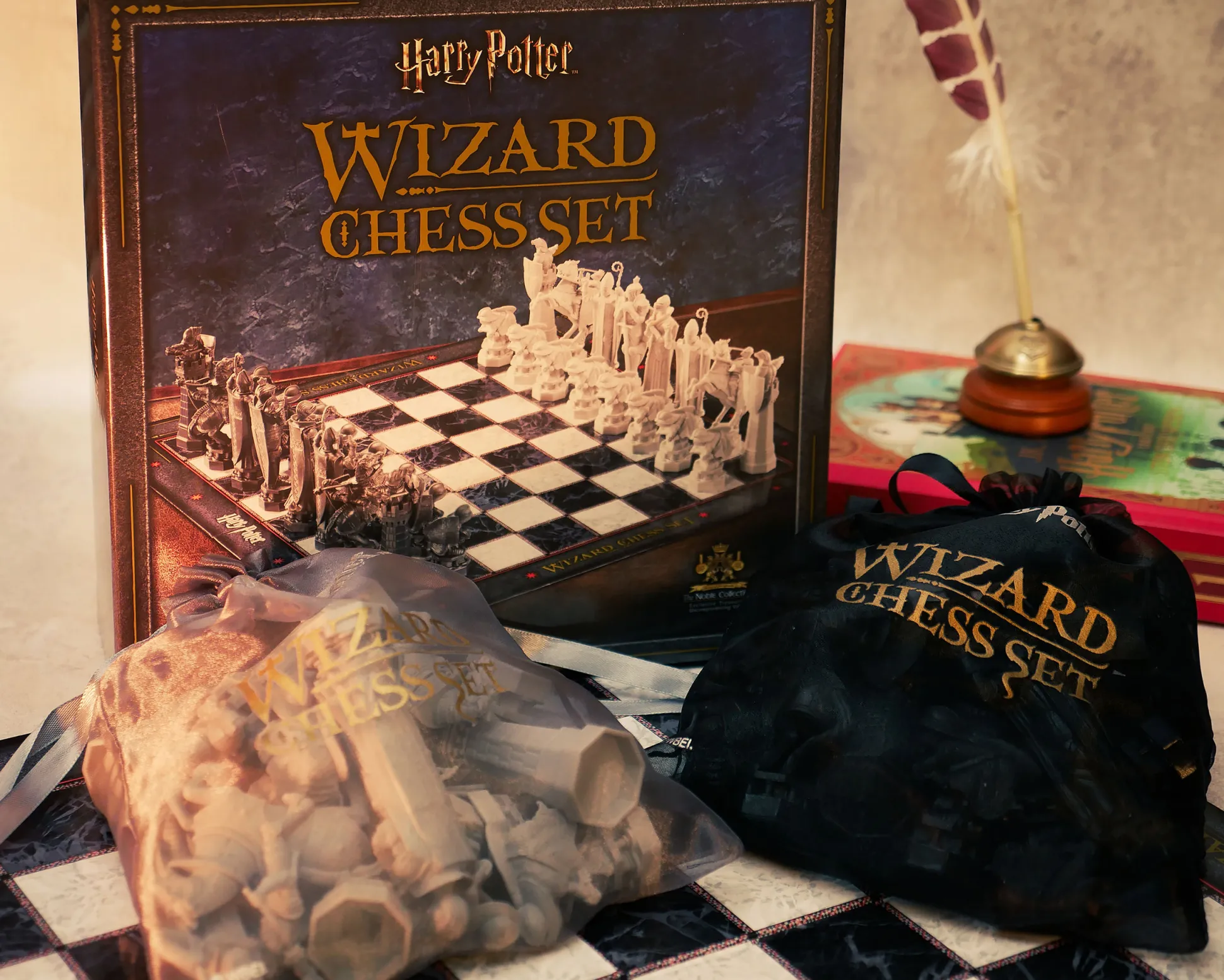 Opdat jij in je eerste partijen niet roemloos ten onder gaat zoals Harry, heeft Elbenwald dit toverschaakspel voor je, zodat je je perfect kunt voorbereiden op duels in de leerlingenkamer: pak gewoon het hoogglanzende schaakbord in marmerlook uit, met Harry Potter-logo’s aan de zijkanten, en zet de 32 schaakstukken neer, die dankzij het lichte kunststof bijna vanzelf over het bord lijken te zweven. De stukken, 5 tot 11,5 cm hoog, zitten in twee organzazakken bedrukt met het Harry Potter-logo en zijn gebaseerd op het legendarische schaakspel dat professor Anderling heeft gecreëerd om de Steen der Wijzen te beschermen – hetzelfde spel waarin Ron zichzelf opoffert zodat Harry naar de volgende kamer kan gaan en Heer Voldemort voorlopig kan verslaan.