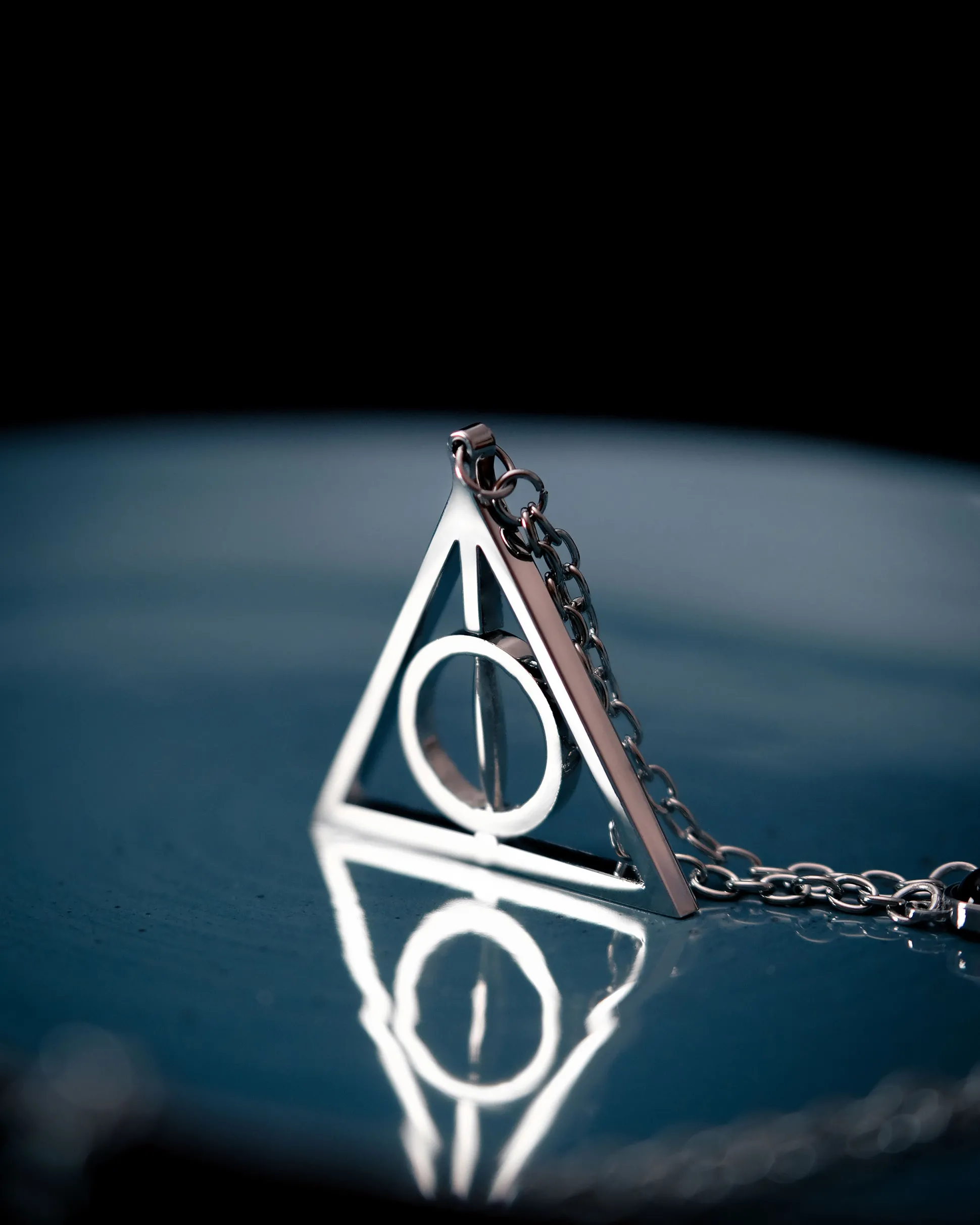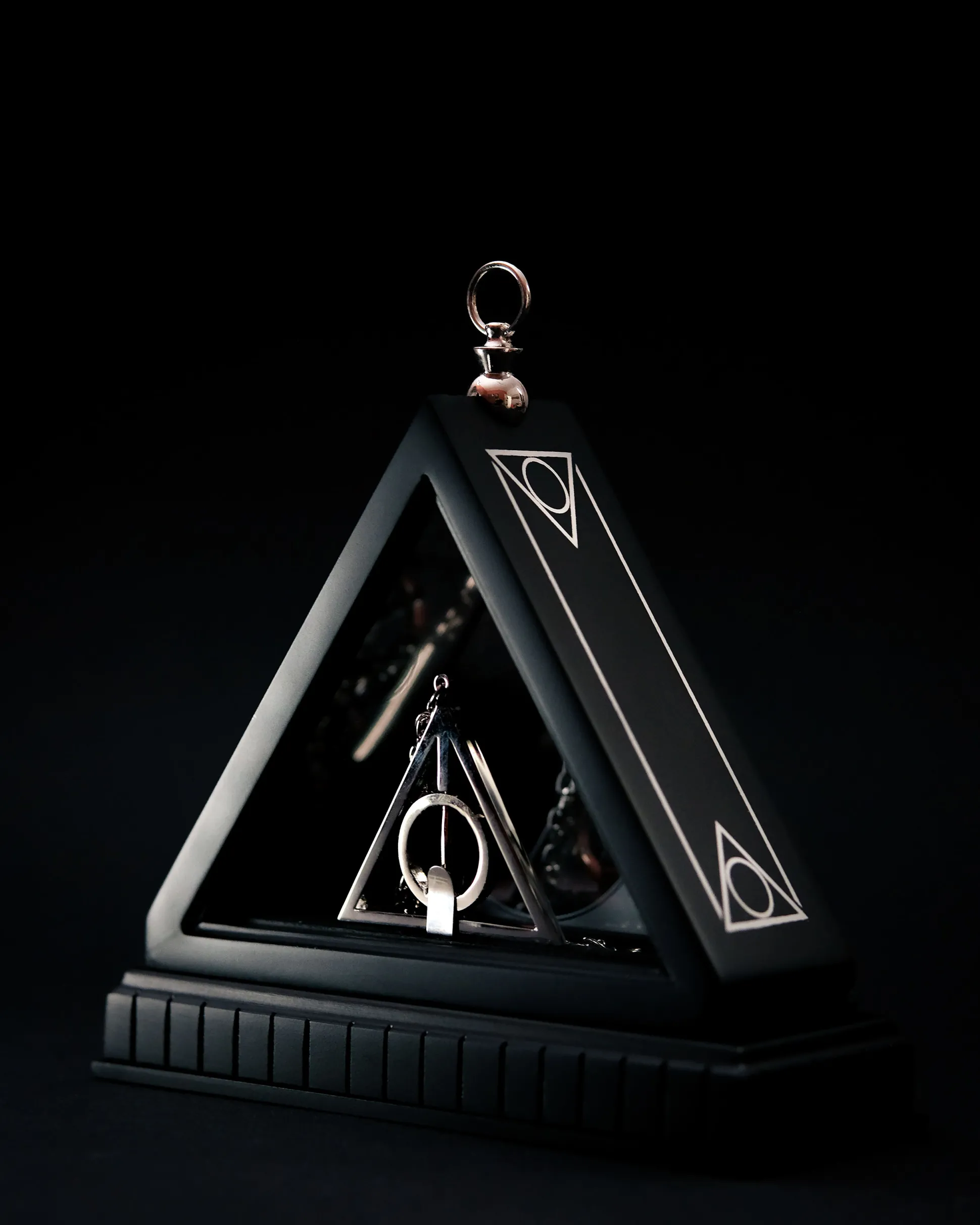 zijn de drie symbolen van de Relieken van de Dood en grafisch weergegeven in een gelijkzijdige driehoek (onzichtbaarheidsmantel), die een cirkel (steen) en een verticale middenlijn (toverstok) omsluit.