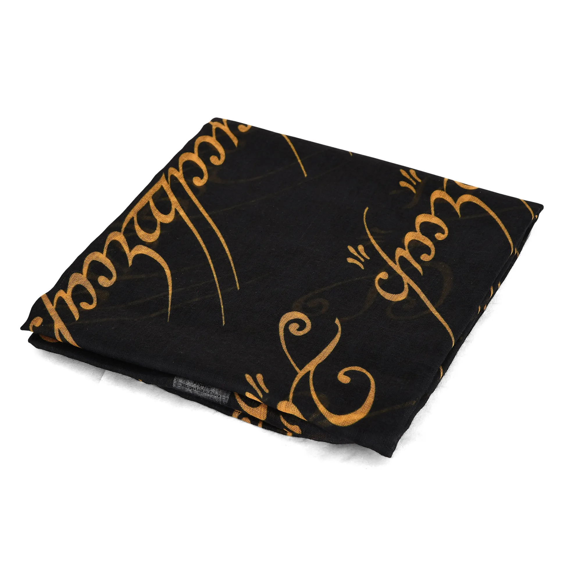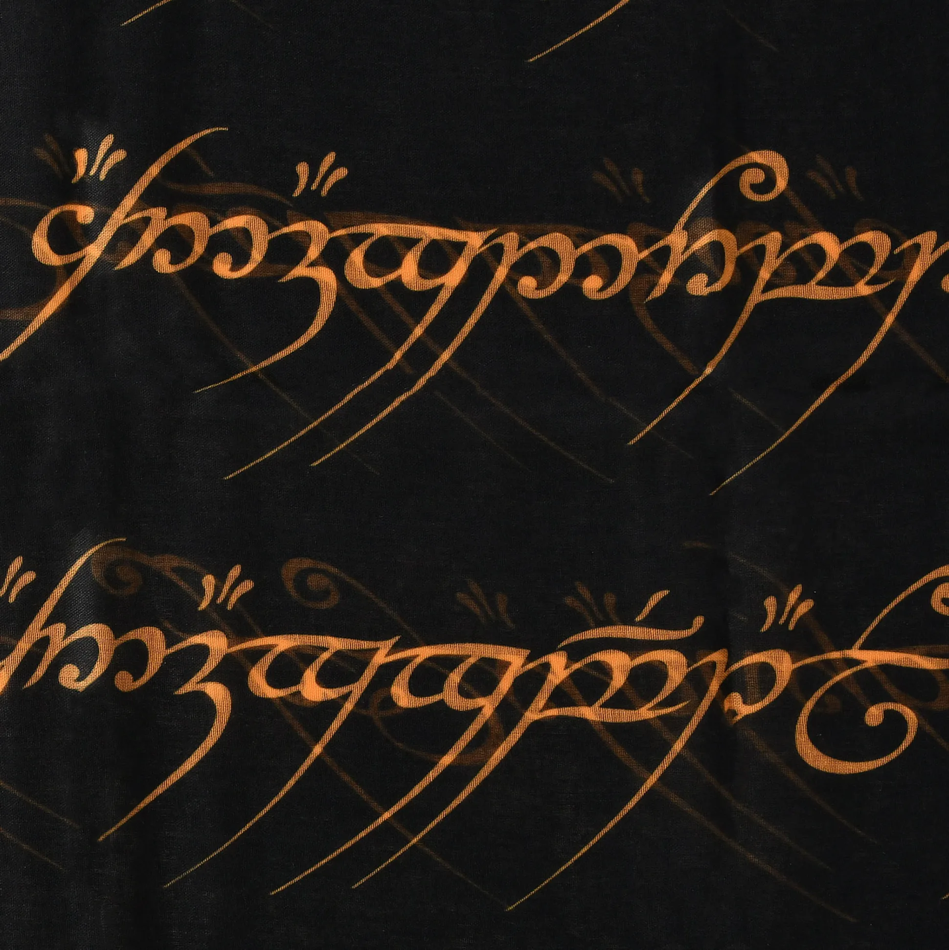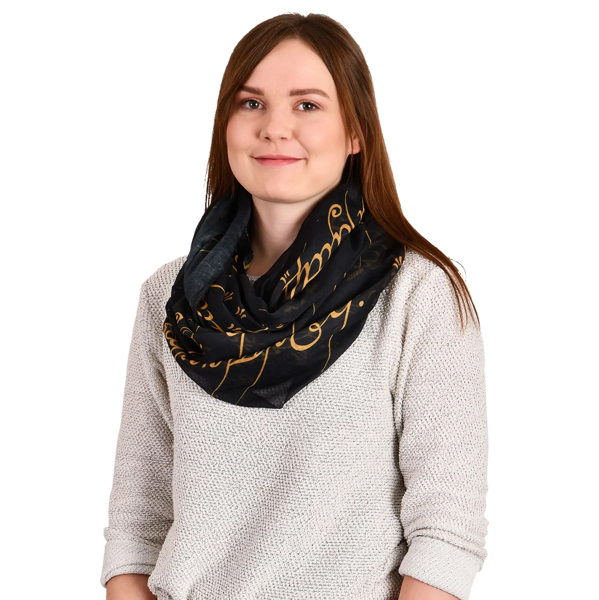Eén loopsjaal om ze allemaal te stylen. Officieel gelicentieerde In de ban van de Ring loopsjaal, bedrukt met de inscriptie van de Ene Ring. Zacht, licht materiaal in klassiek zwart. Afmetingen: breedte 90 cm, Ø 79 cm. Zit comfortabel en past bij elk avontuur – van alledag tot conventie. Trekt blikken, geen duistere krachten. Je nieuwe favoriet voor elke dag.