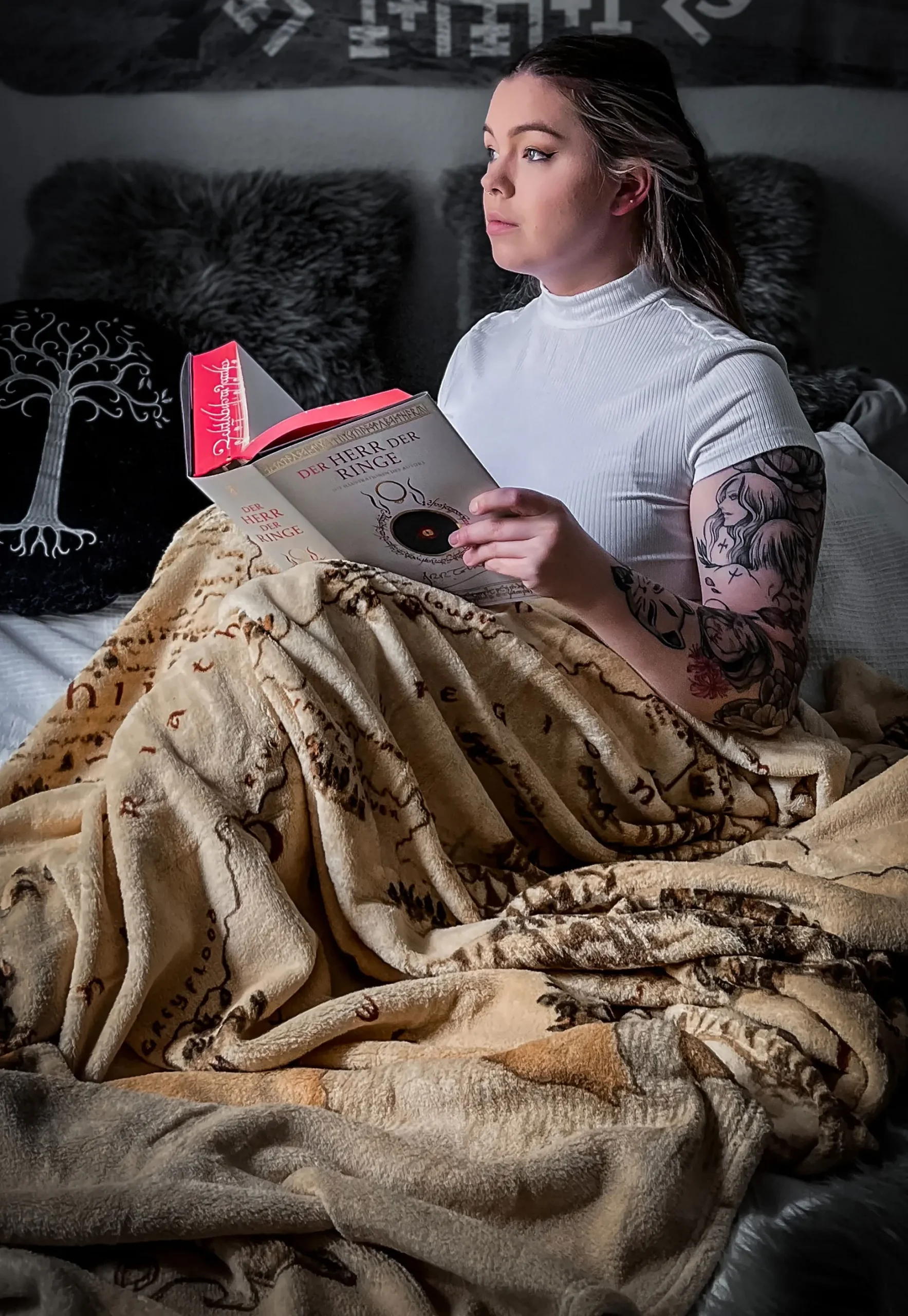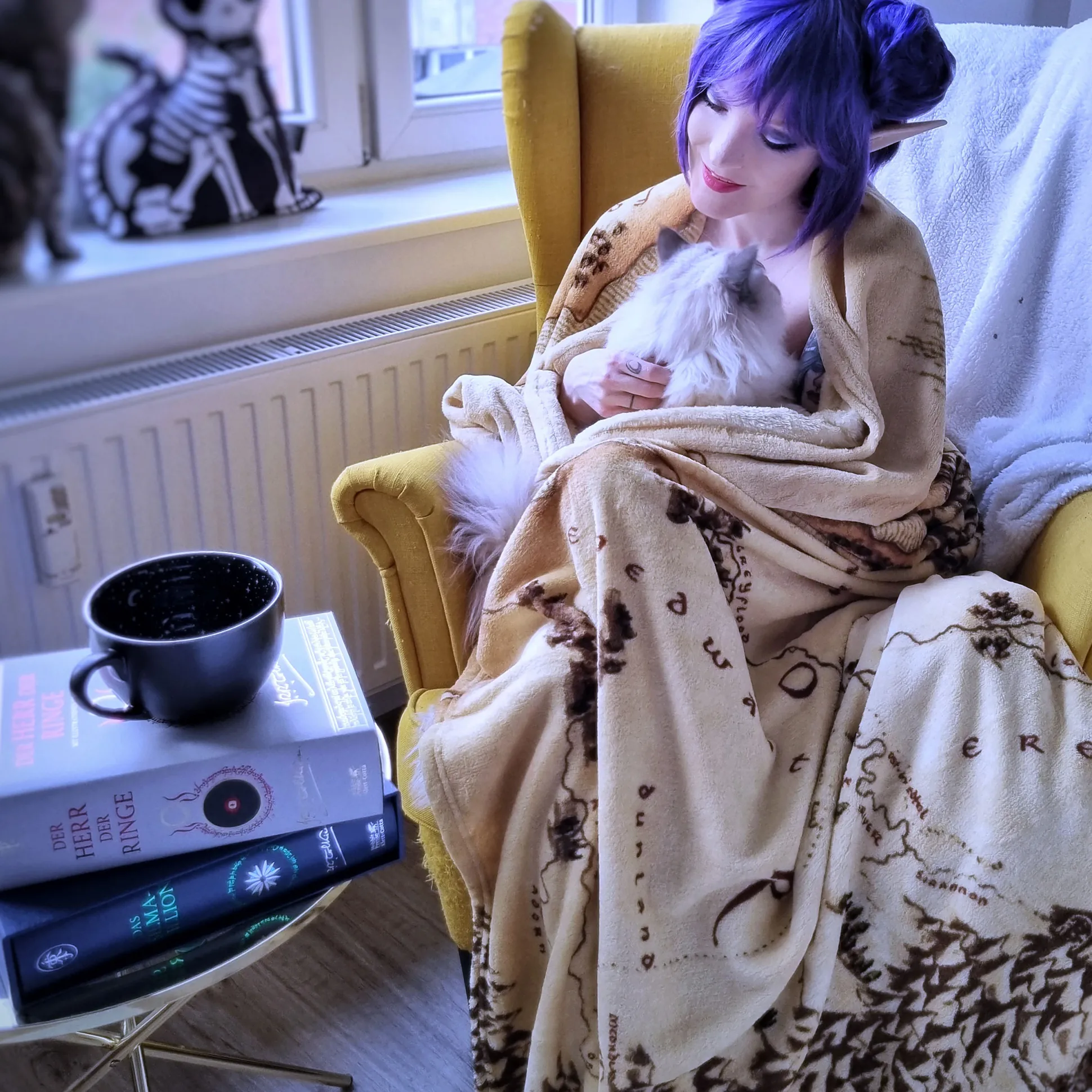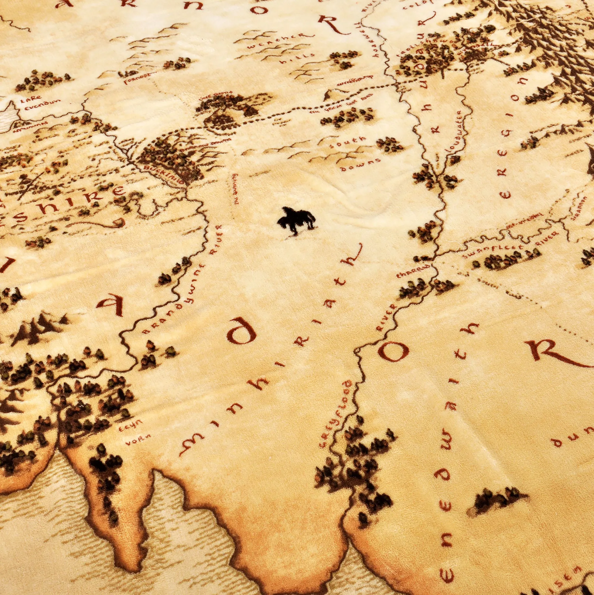 Als het gras nog niet zacht genoeg is, biedt onze zachte, 180 x 220 cm grote Midden-aarde fleece deken voldoende ruimte voor jou en je metgezellen! Onze deken toont de gebieden van het Westen, tot aan Lothlórien en Rohan, langs de Misty Mountains.