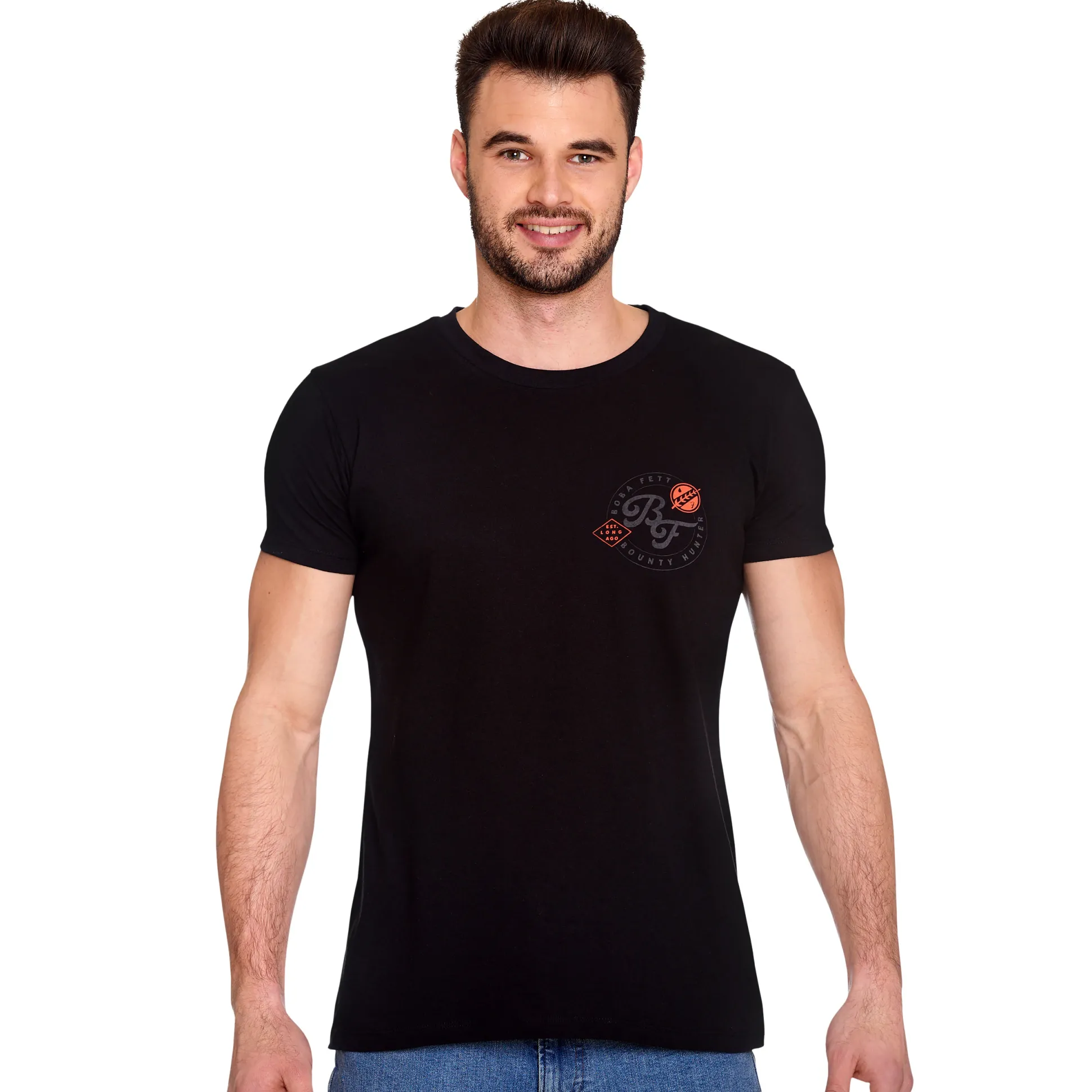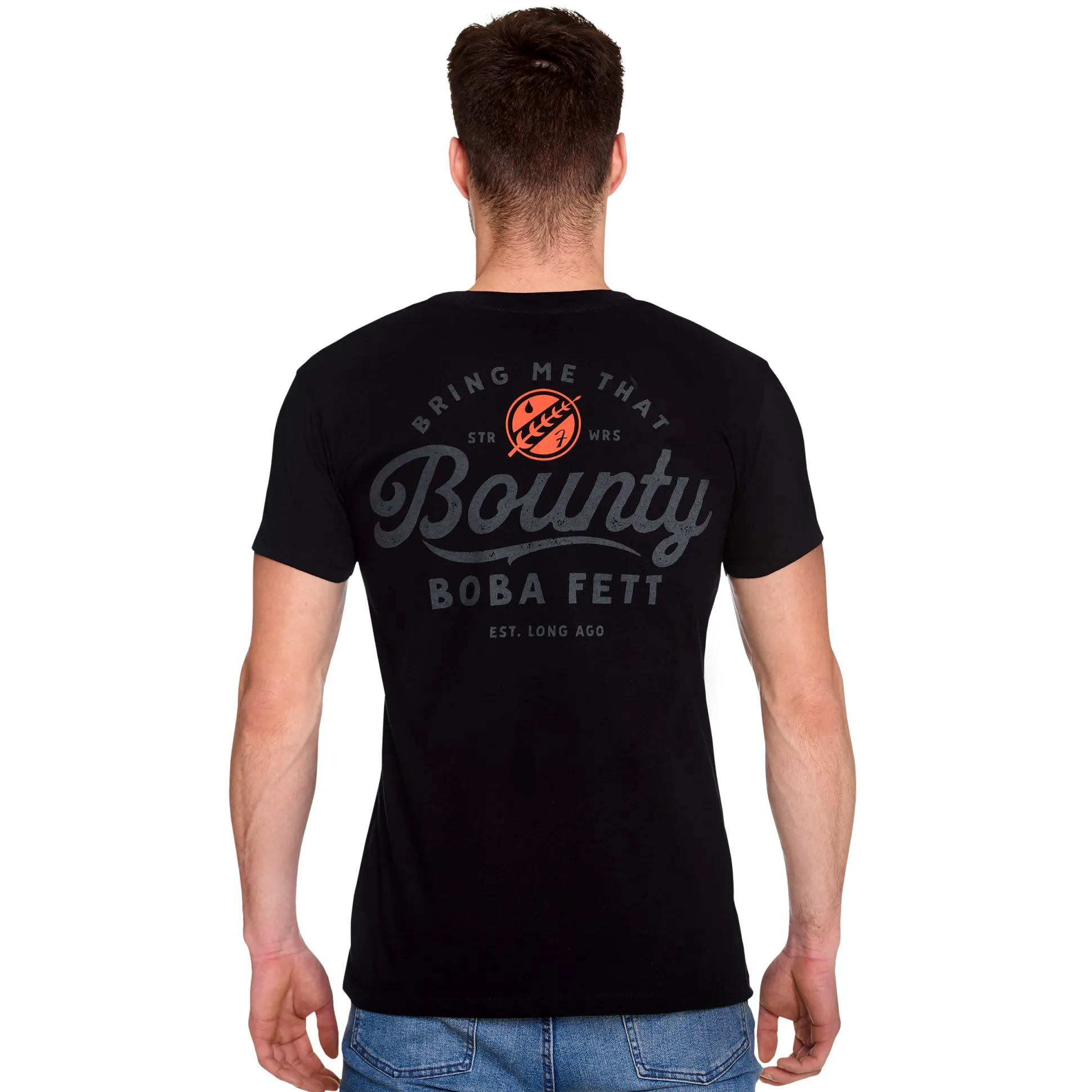 Zwart, ronde hals, rechte pasvorm – comfy voor de cantina en strak voor elke dag. Perfect voor sciencefiction- en Star Wars-fans die hun beskar-vibes graag op de borst … en op de rug dragen. Matcht met jeans en sneakers; jetpack optioneel.