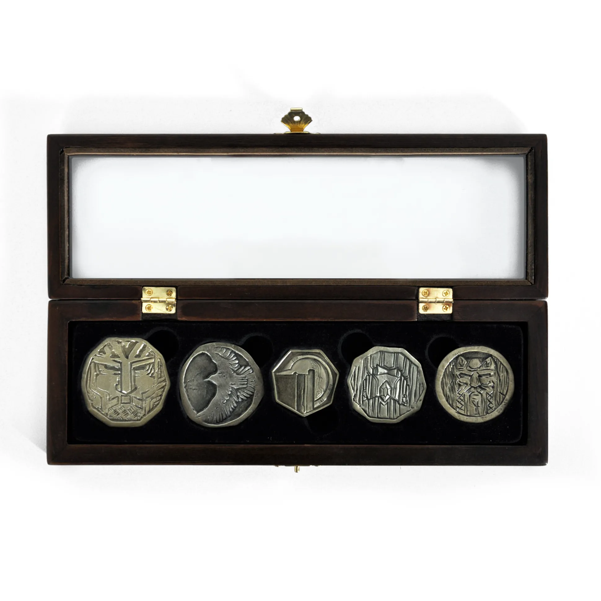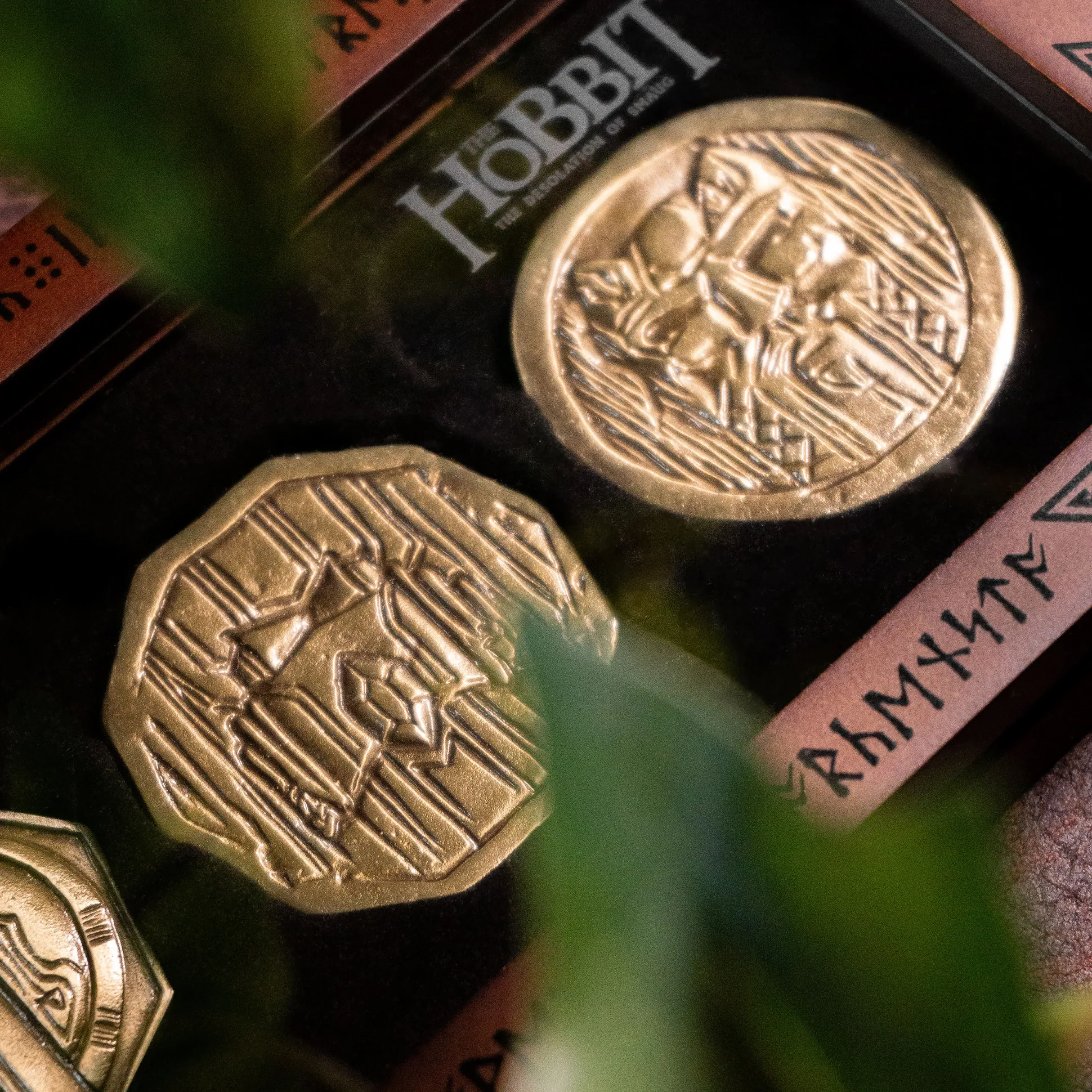 Hiermee bezit je een klein deel van de grote drakenschat uit de Hobbit-filmadaptatie. Vijf opvallende munten met verschillende reliëfs, allemaal versierd met typische dwergmotieven. Elegant gepresenteerd in een houten doos versierd met runen. Een filmsouvenir uit het tweede deel van de Hobbit ‘De Verwoesting van Smaug’. Als je deze kleine schatten in je hand houdt, voel je je misschien als Bilbo Baggins of Thorin Eikenschild en voel je je terug in lang vervlogen tijden.