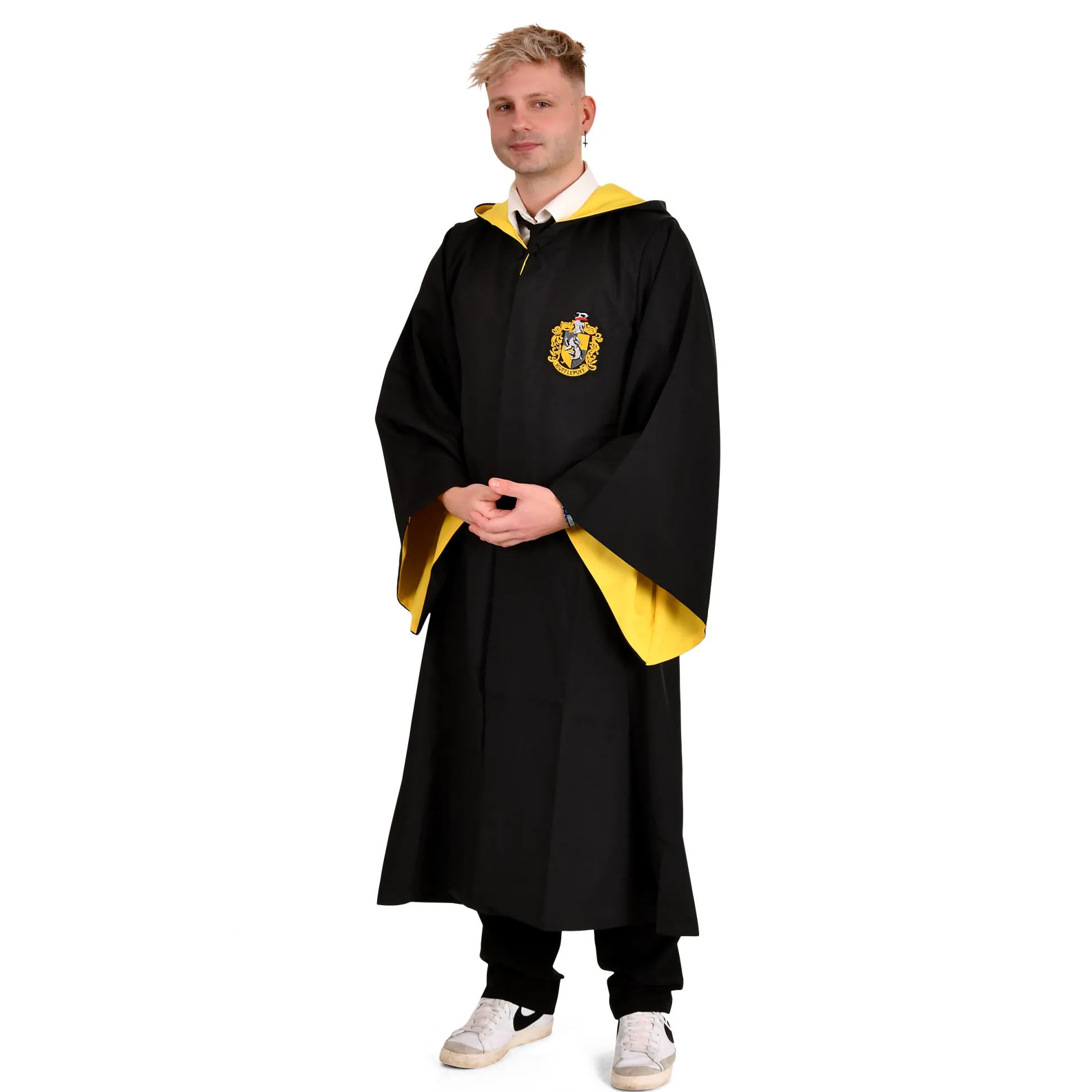 Ben je klaar om je loyaliteit te tonen aan een van de edelste huizen van Zweinstein? Met de officieel gelicentieerde Harry Potter Huffelpuff mantel, exclusief bij Elbenwald, word je een echt deel van het magische universum. Deze nauwkeurige replica van de Huffelpuf mantel, compleet met kabouterkap, is een must voor elke echte fan. Je zult je een echte tovenaar voelen als je je mantel sluit met de knoopsluiting en je toverstaf in de binnenzak steekt. De wijde mouwen en de kleuren zwart en geel maken de authentieke Zweinstein-ervaring compleet. Met deze mantel ben je niet alleen de blikvanger op elk verkleedfeest, maar kun je ook een vleugje magie in je dagelijks leven brengen.