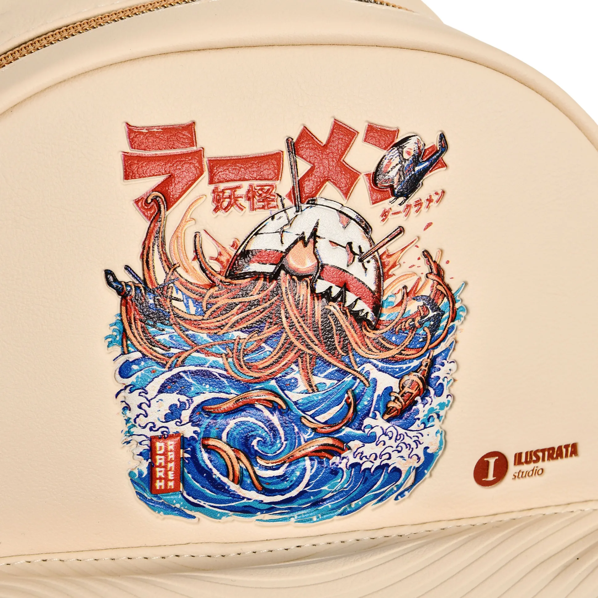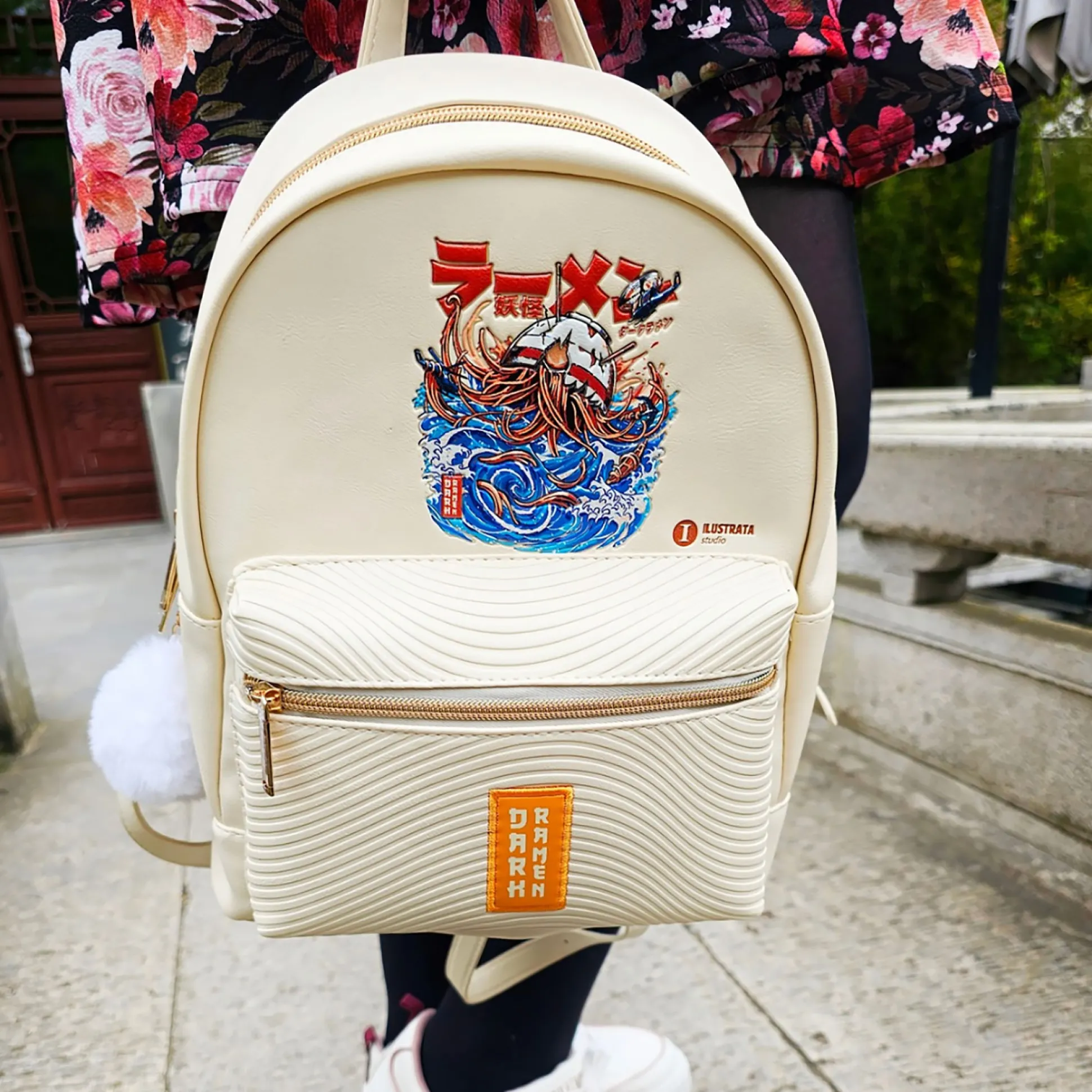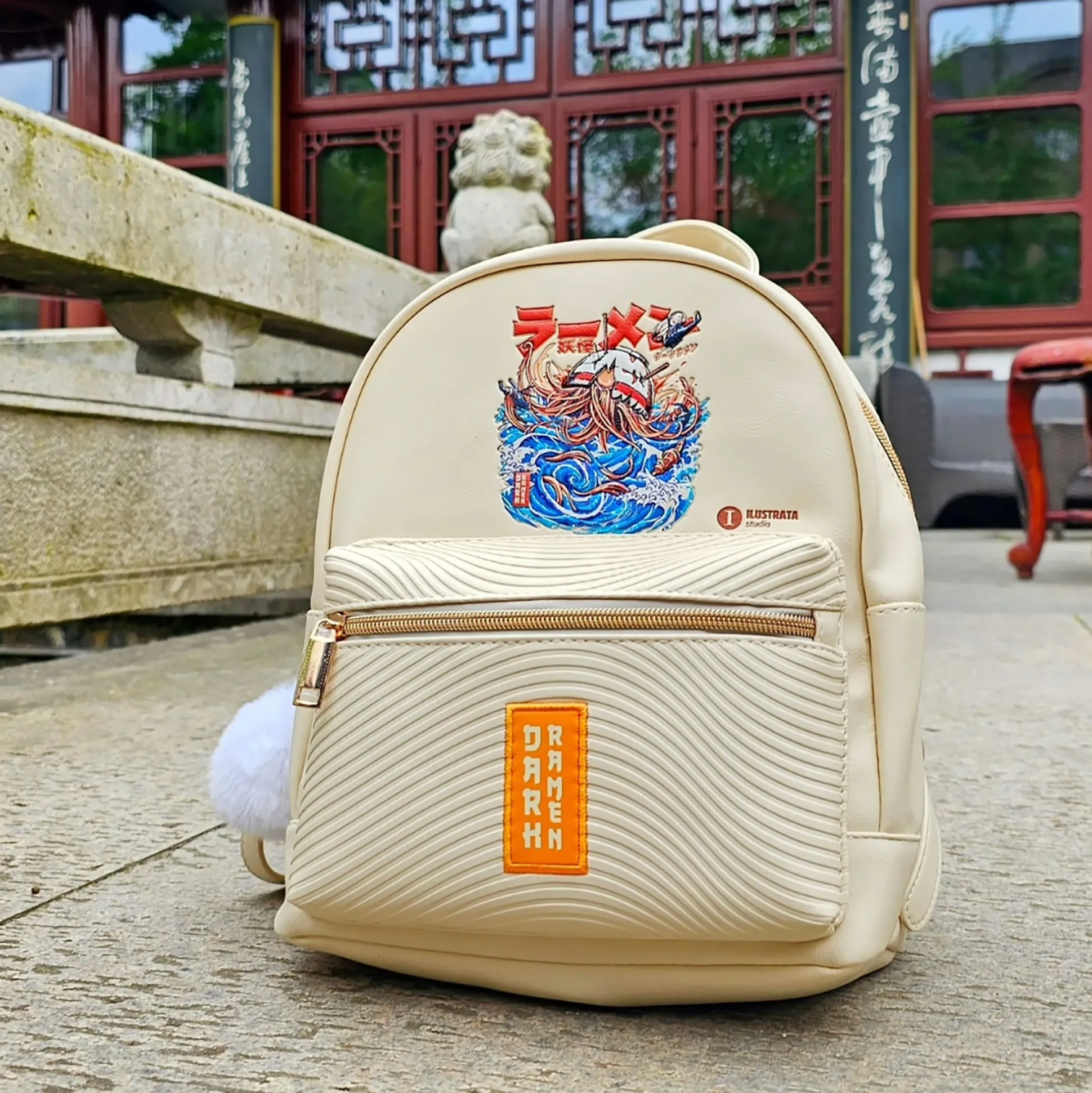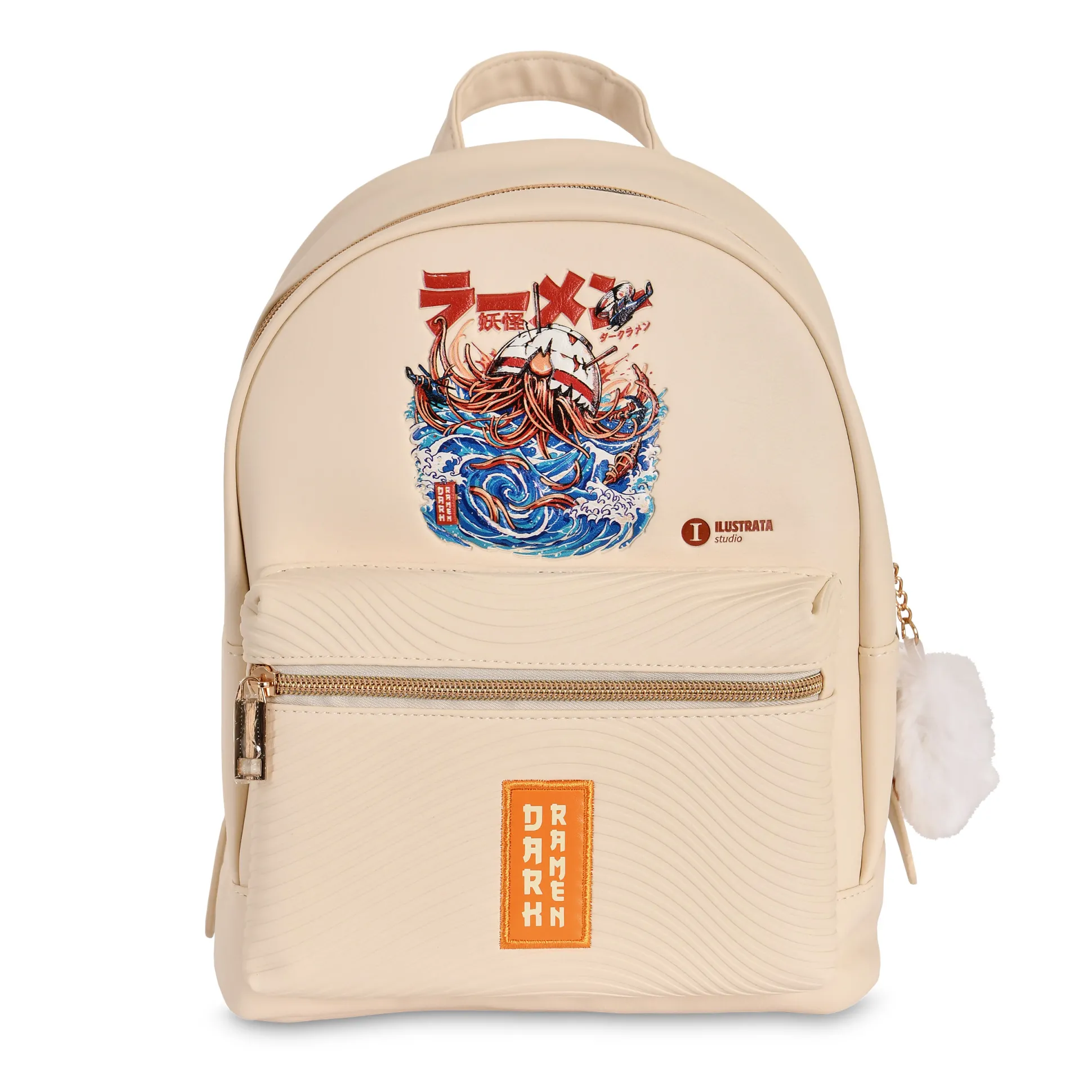 Ramen, maar dan dark. Officieel gelicentieerde Ilustrata-rugzak die het Dark Ramen-artwork serveert als reliëfmotief plus een patch op de voorkant – in zacht beige dat overal bij past. Binnen: hoofdvak met twee insteekvakken; buiten: een ritsvak voor én achter. De pompon aan de rits is de topping; verstelbare schouderbanden en een handvat zorgen voor draagcomfort onderweg. Compacte 22 x 28 x 15 cm – perfect voor conventions, stedentrips en alle anime- & mangafans die hun honger naar fanart overal mee naartoe willen nemen.