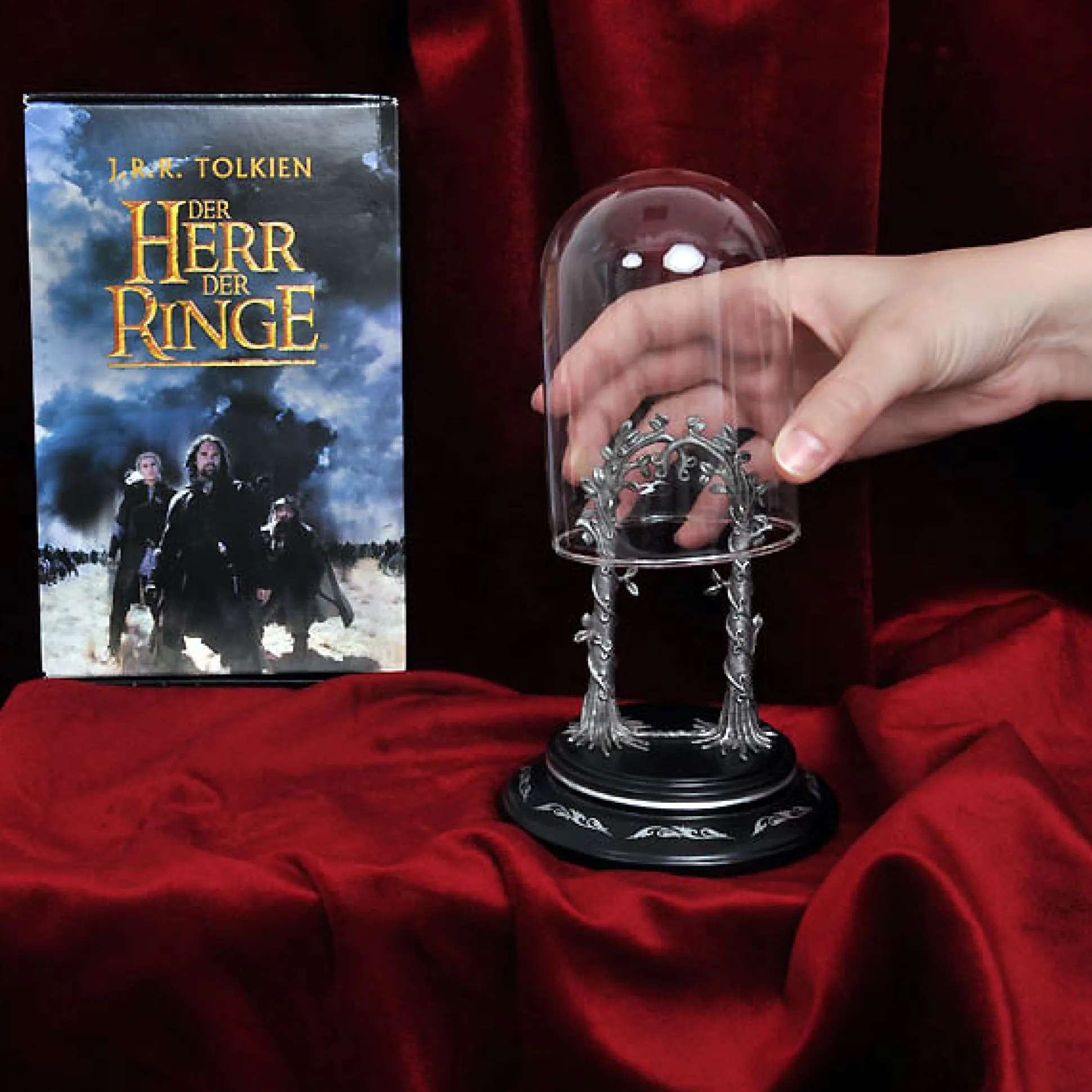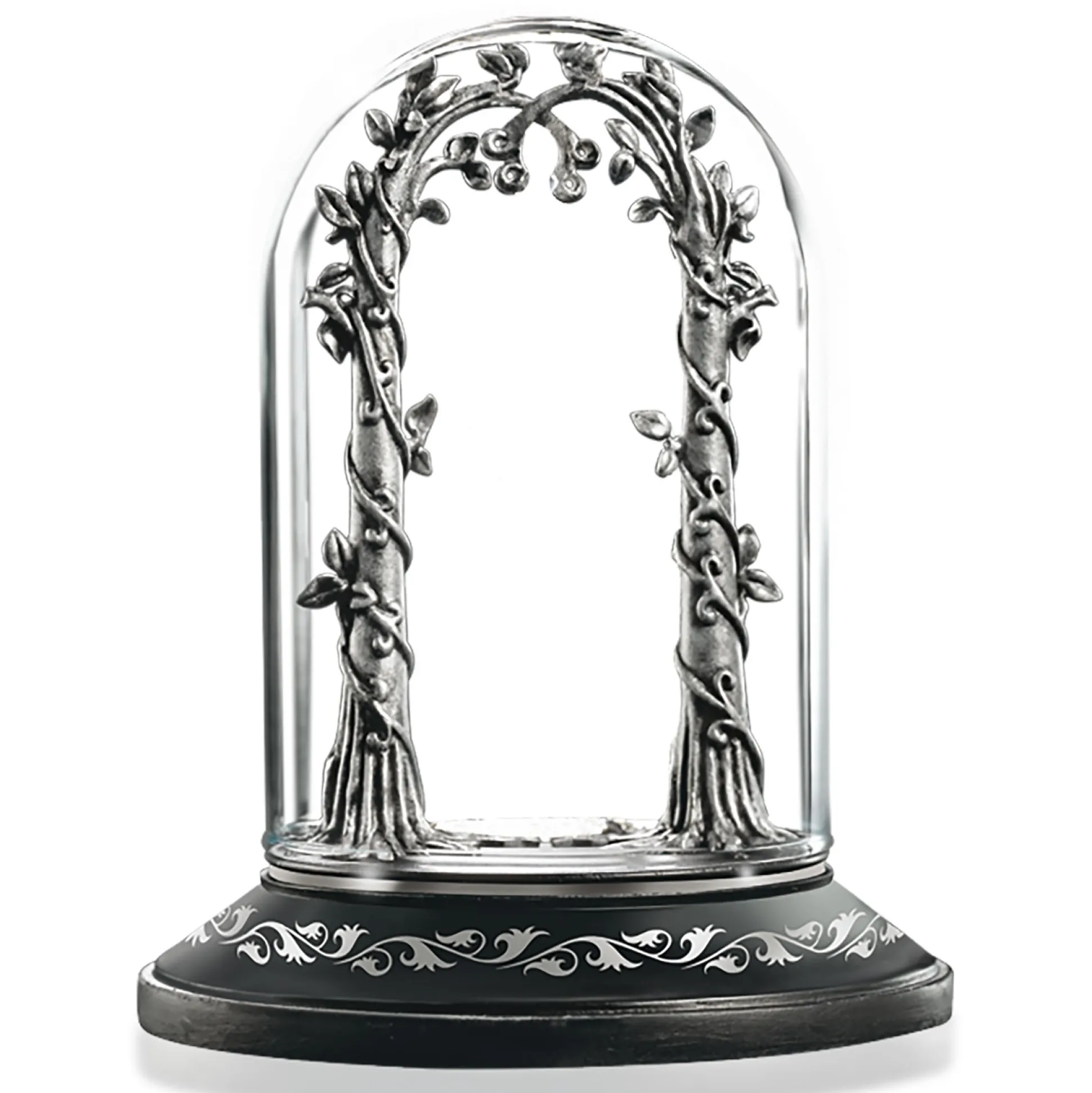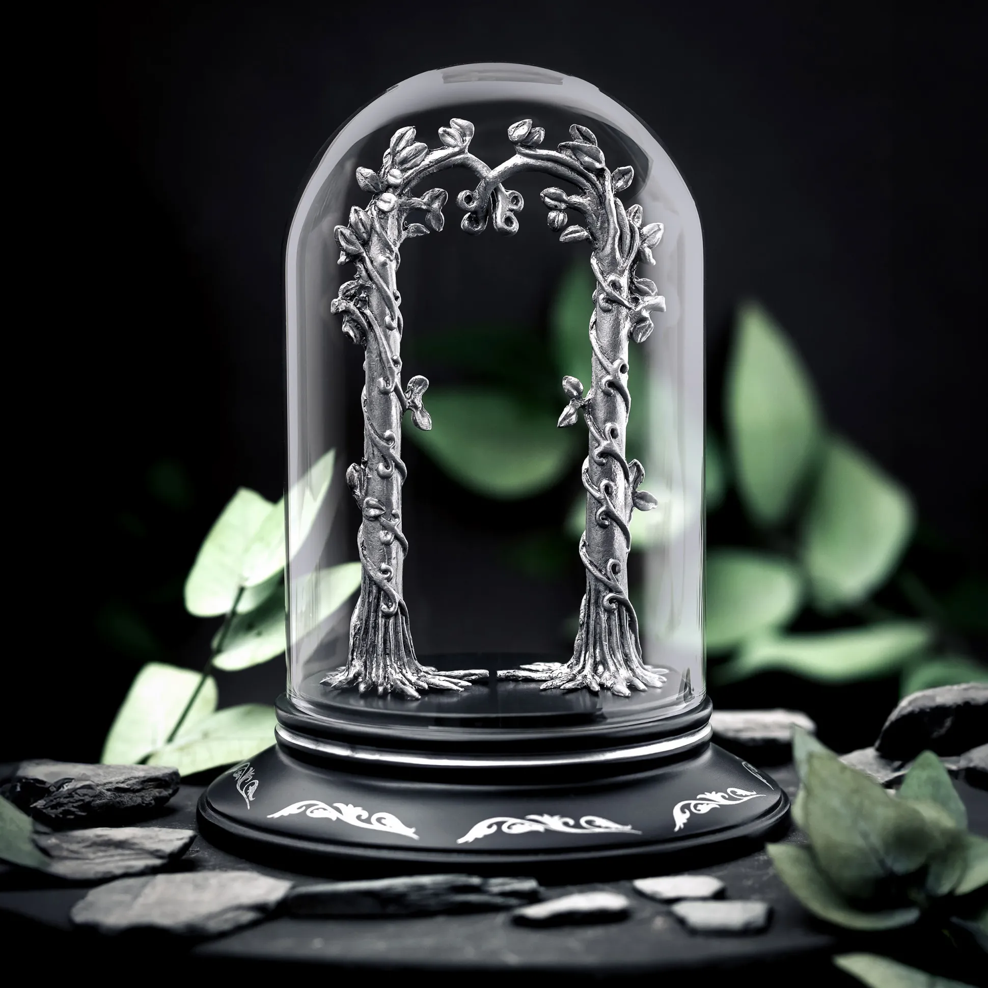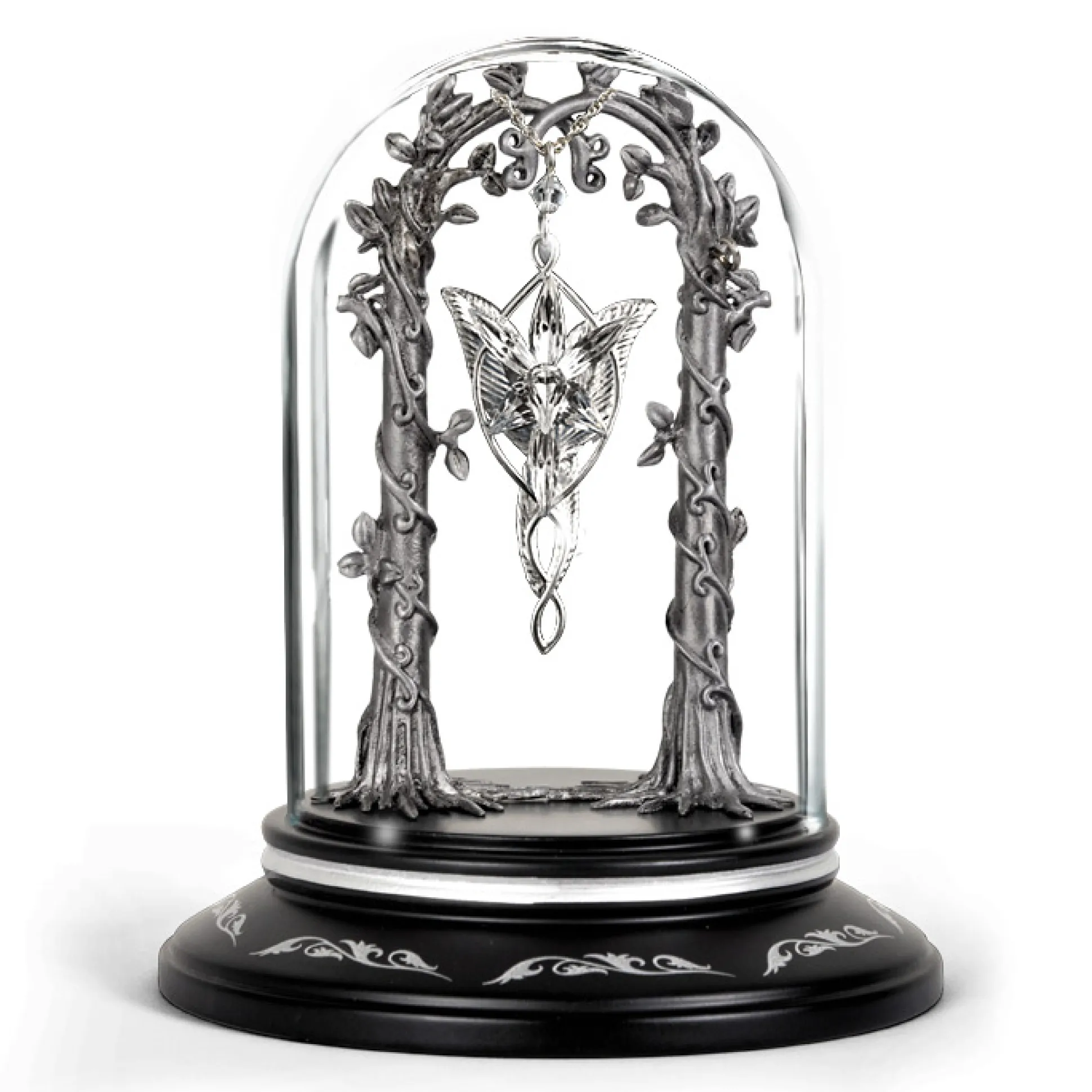 Bijzondere schatten verdienen een bijzondere omlijsting: presenteer jouw Avondster het beste in deze In de Ban van de Ring sieradenvitrine. Kunstzinnig elfenrankwerk draagt jouw sieradenschat, en met behulp van twee onopvallende haakjes aan de achterkant van de ranken kun je het veilig vastzetten.