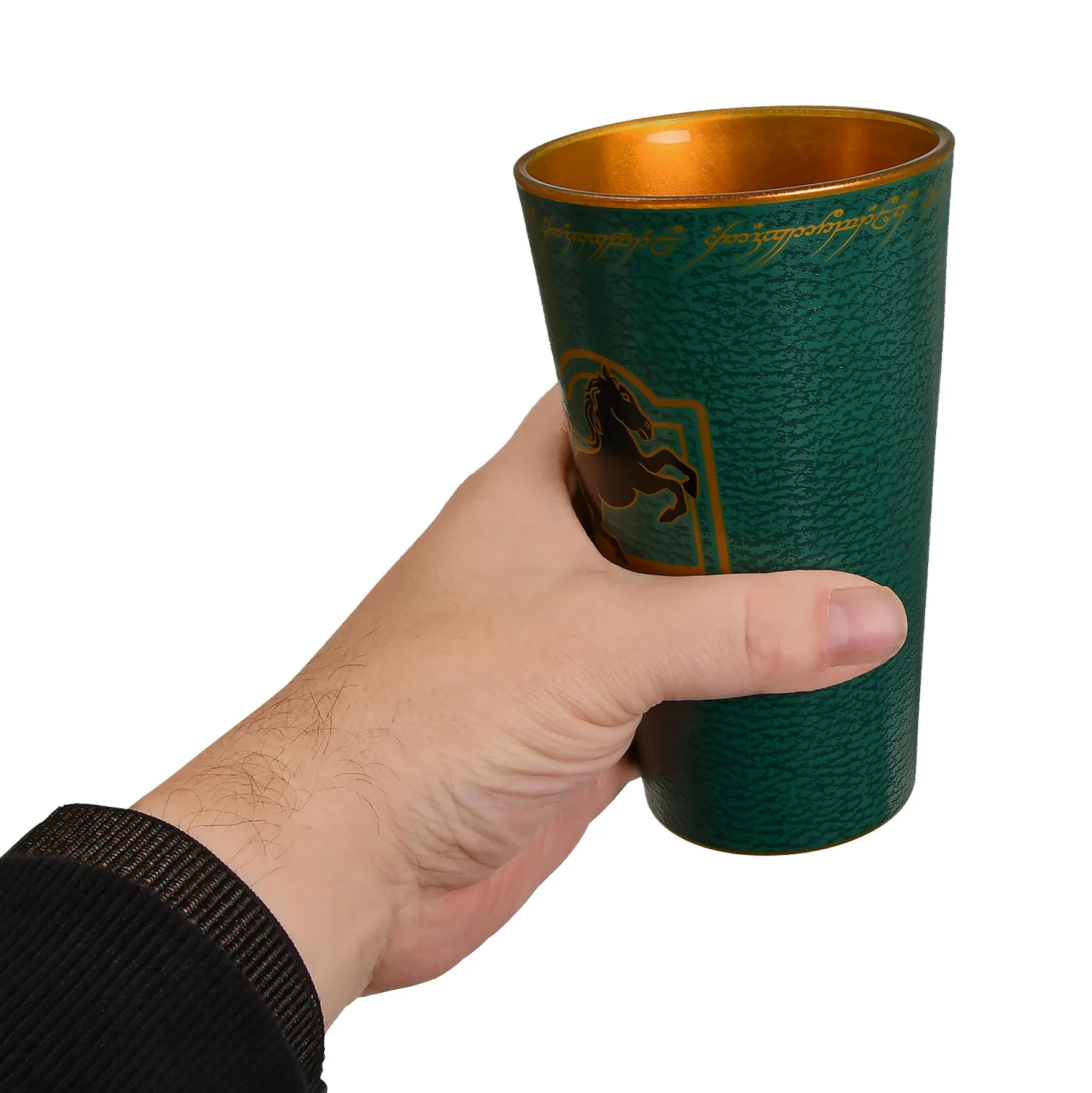 Buitenkant diepgroen met fijne structuur; binnenkant goudkleurig als een pas opgepoetste dwergenschat. Perfect om je bier, cider of ijsthee een heldhaftige glans te geven.