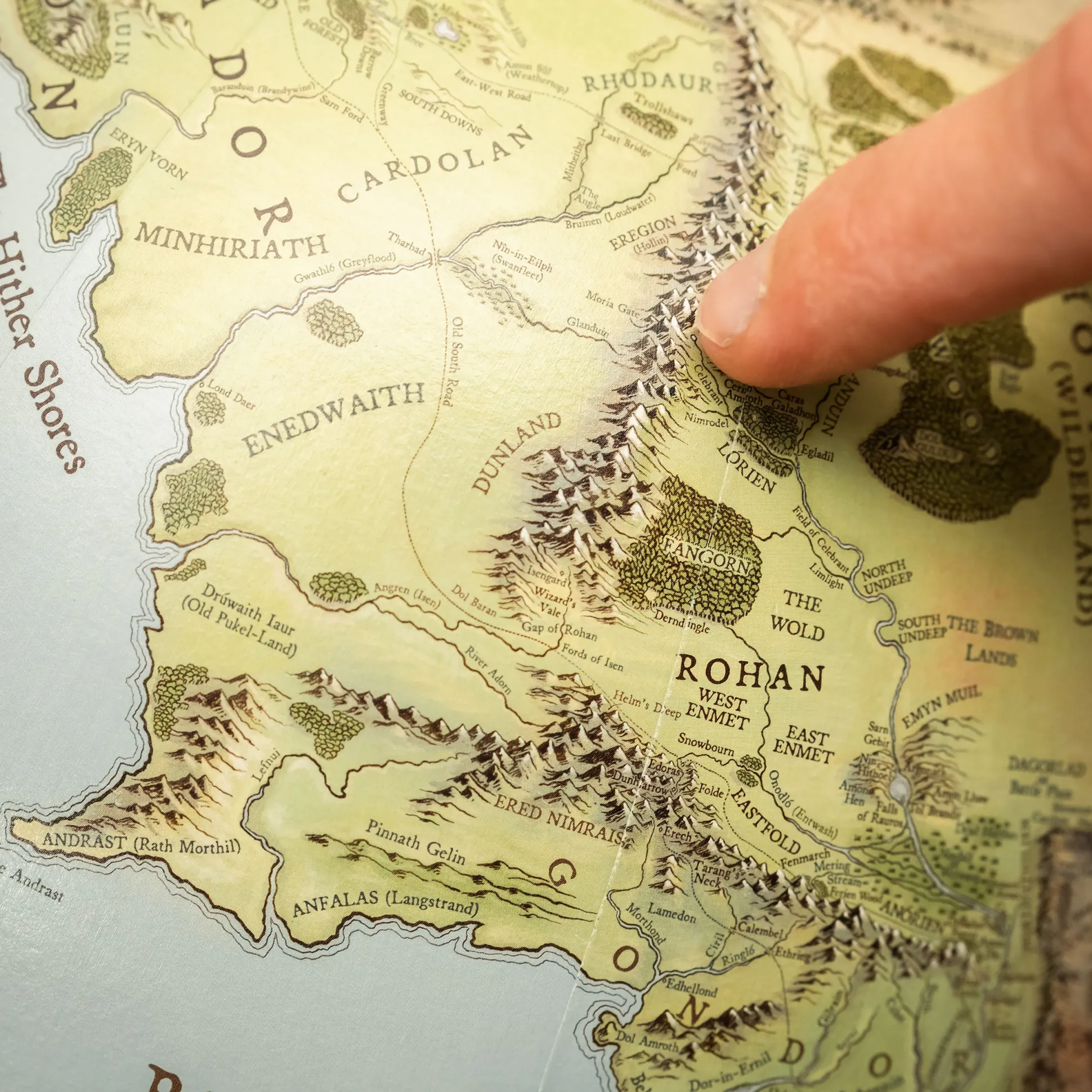 - toont de volledige topografie van Tolkiens Midden-aarde wereld