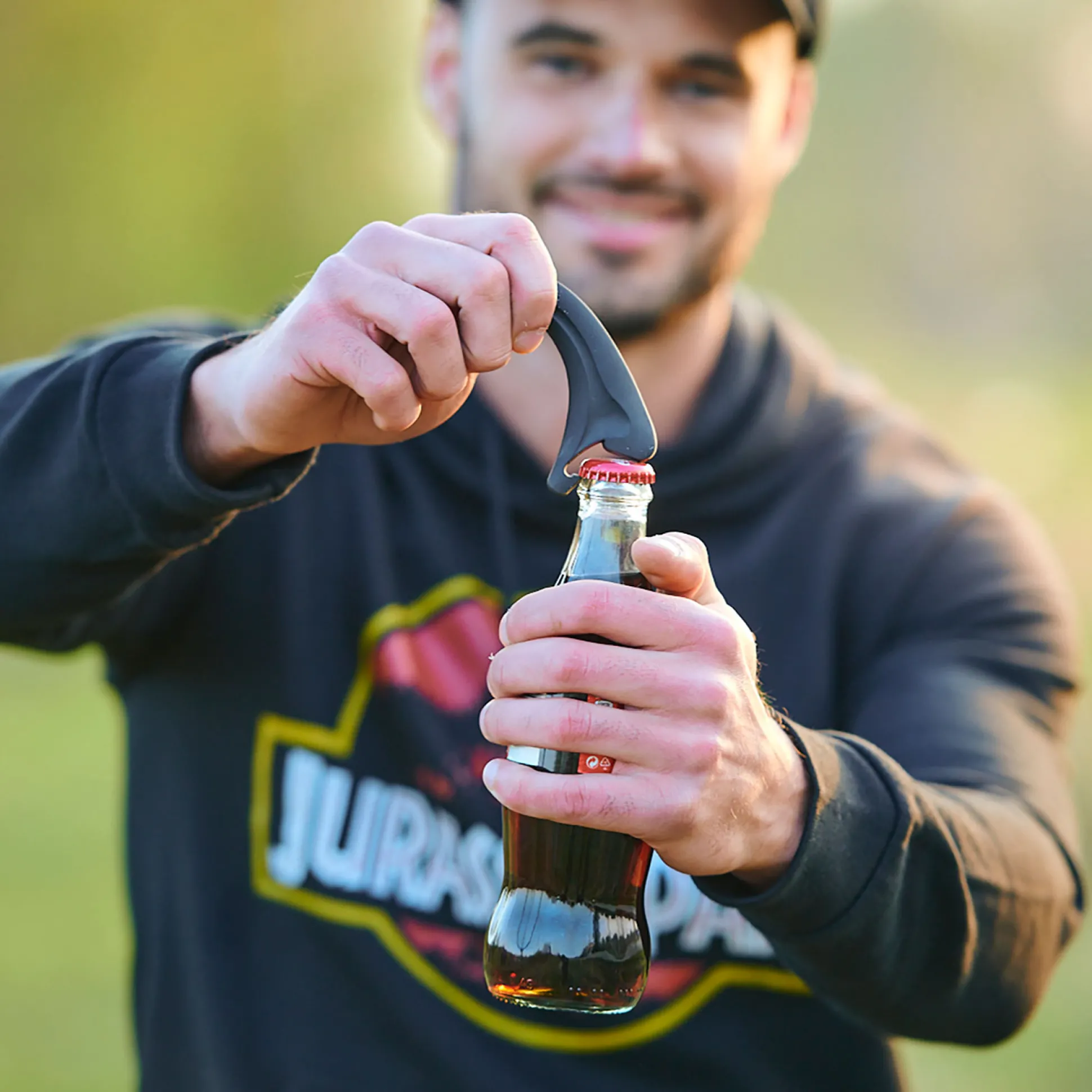 Deze officieel gelicentieerde Jurassic Park flesopener in de vorm van een velociraptor-klauw rukt kroonkurken los alsof de jacht begonnen is. Dankzij de magneten aan de achterkant parkeert de klauw op je koelkast – altijd klaar wanneer de dorst in het verblijf brult. Zwart, compact en prettig in de hand: 6,7 x 9,1 x 0,7 cm. Niet vaatwasser- of magnetronbestendig (zet de dino alsjeblieft niet in de magnetron). Het perfecte cadeau voor iedereen die van Jurassic Park houdt – en van ijskoude drankjes.