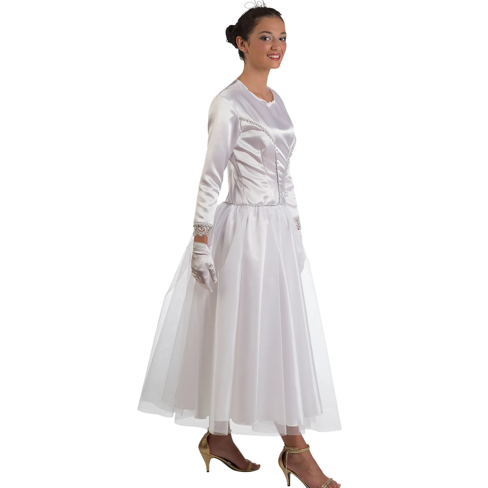 - ritssluiting aan de achterkant, wijd uitlopende tule rok