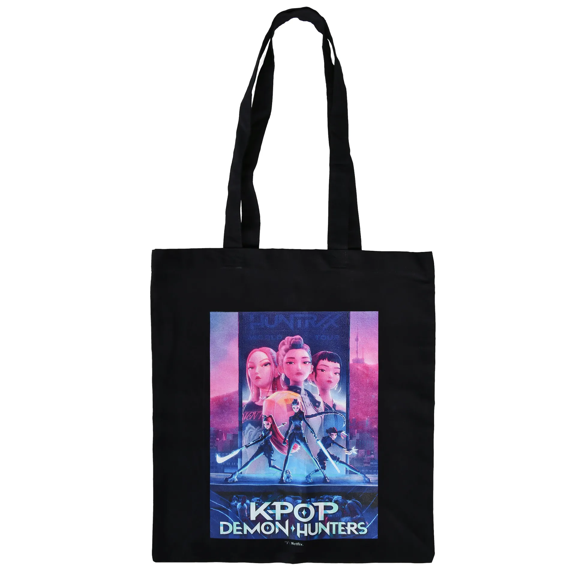 Beats, blades en badass girls — check. De officieel gelicentieerde KPop Demon Hunters Huntrix tote bag is je nieuwe sidekick voor elke dag, de campus en cons. Op de voorkant staat het groot formaat Huntrix postermotief met Rumi, Zoey en Mira — zo ziet iedereen bij welke squad je hoort. Zwart, 35 x 41 cm, met lange hengsels om relaxed over je schouder te dragen — klaar voor je volgende loot‑haul of een snelle boodschap. Inpakken, omhangen en jagen… eh, to‑do’s.