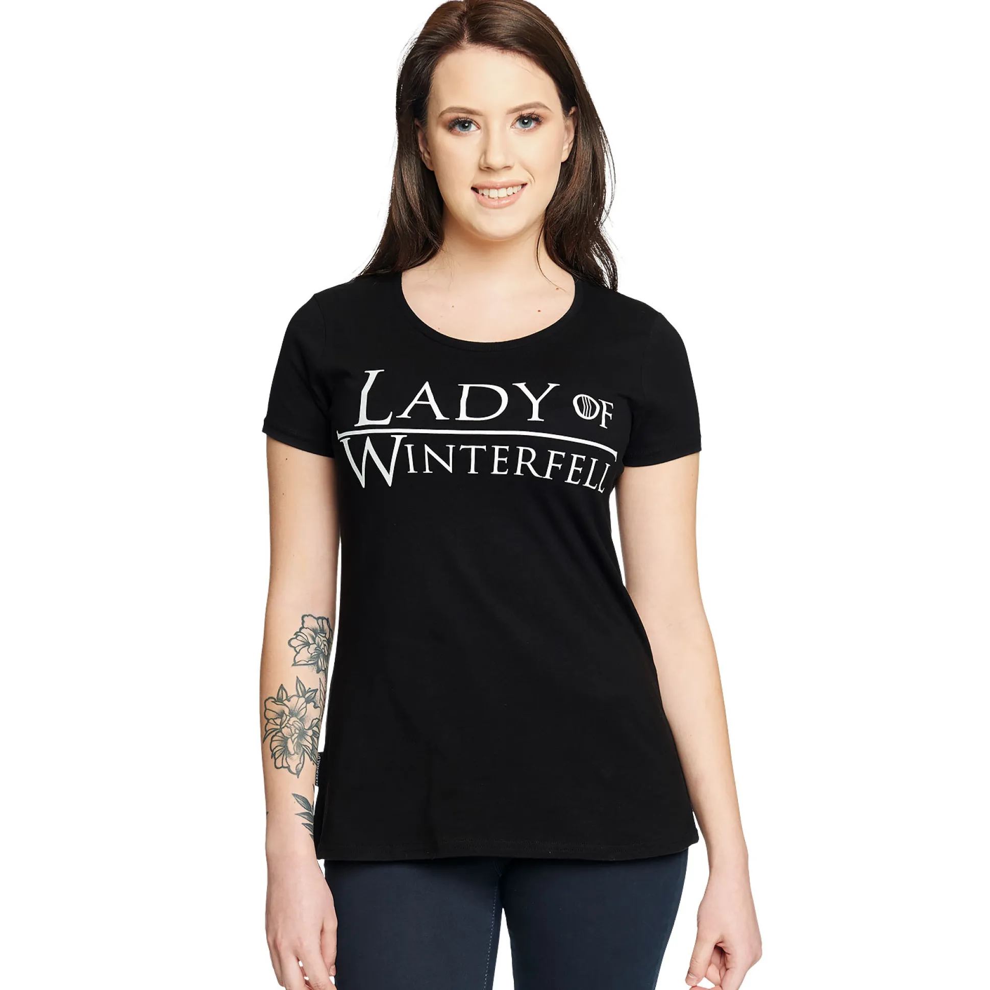 Maak plaats, Arya! Met dit Lady of Winterfell T-shirt laat jij iedereen zien dat het Noorden onder jouw leiding staat. De relaxte pasvorm en de stoere House Stark print brengen die echte Winterfell-vibe naar jouw kledingkast—zonder dat je Jon Snow hoeft te vragen wat je aan moet trekken. Perfect voor Game of Thrones-fans die meer van wolven houden dan van draken. Zwart, comfy en zo cool dat zelfs Sansa jaloers zou worden. Haal de look in huis waar zelfs de winter welkom is!