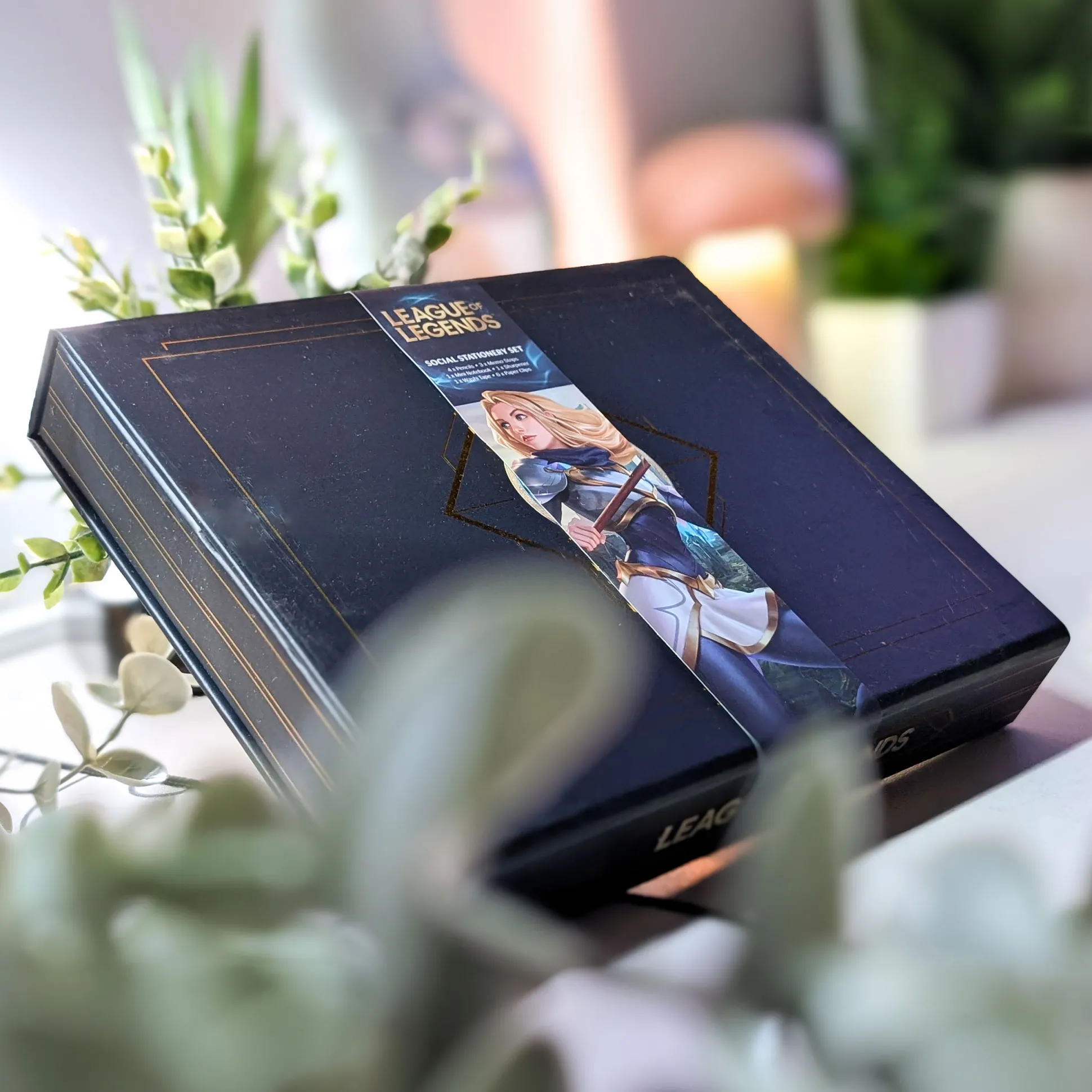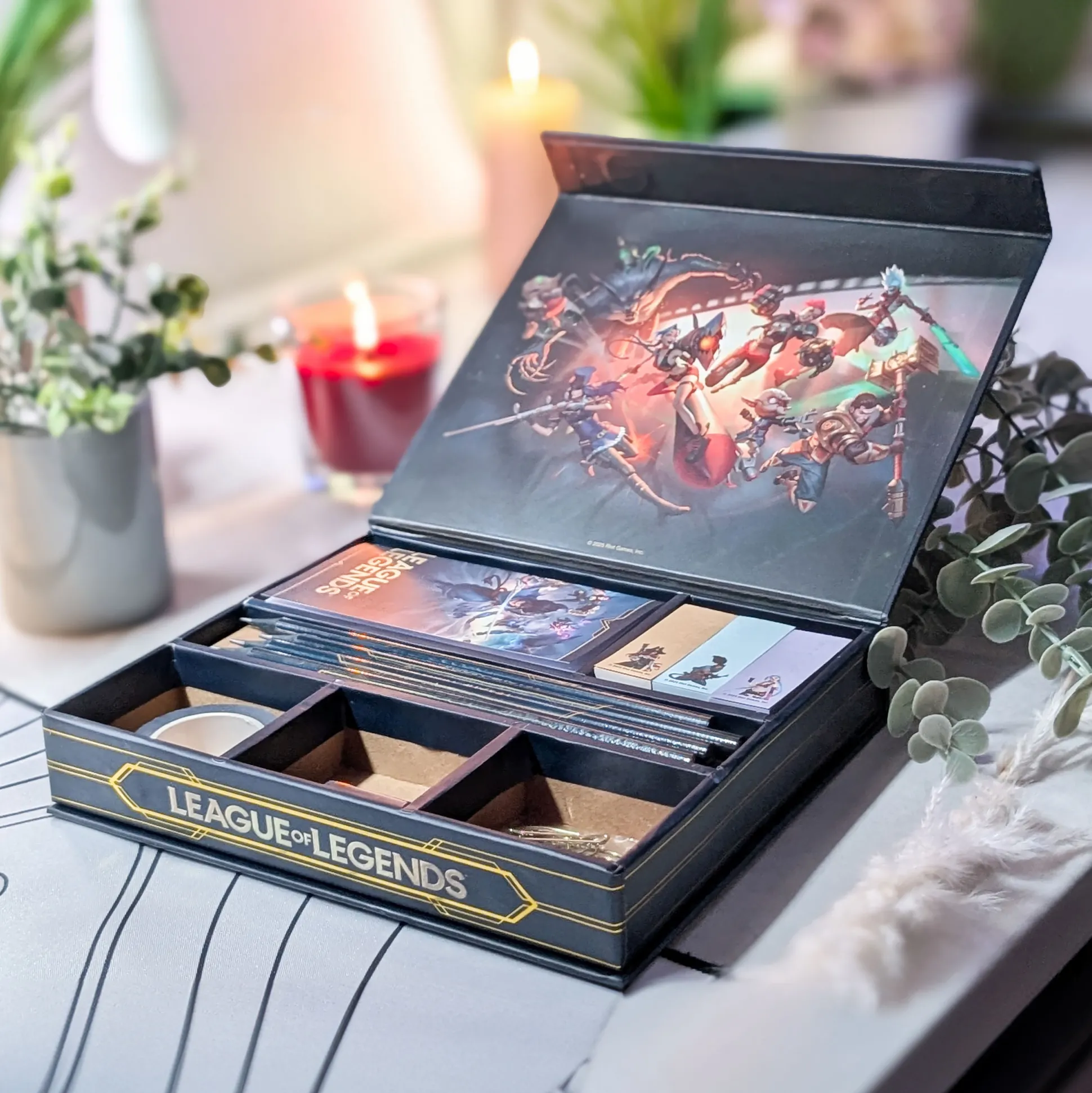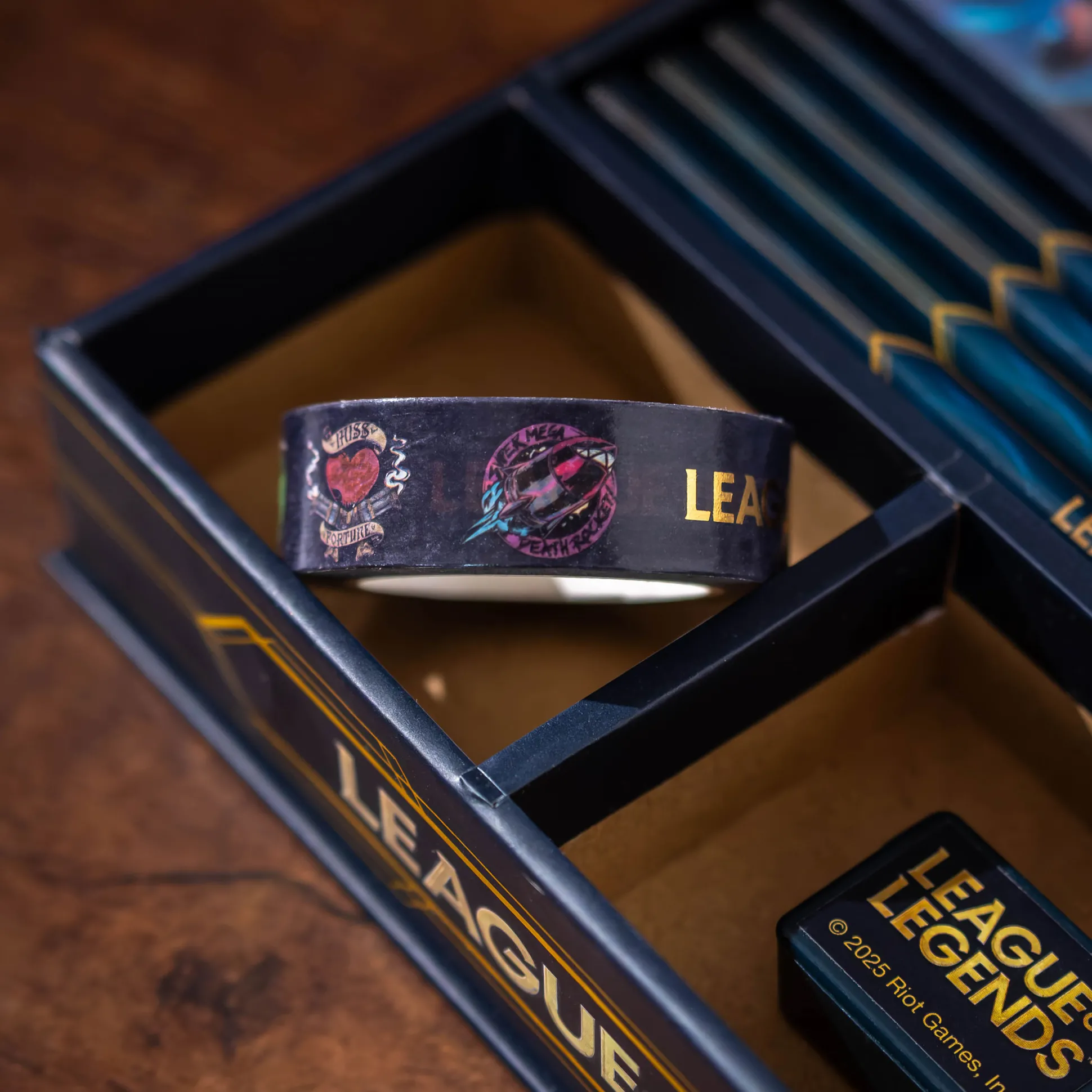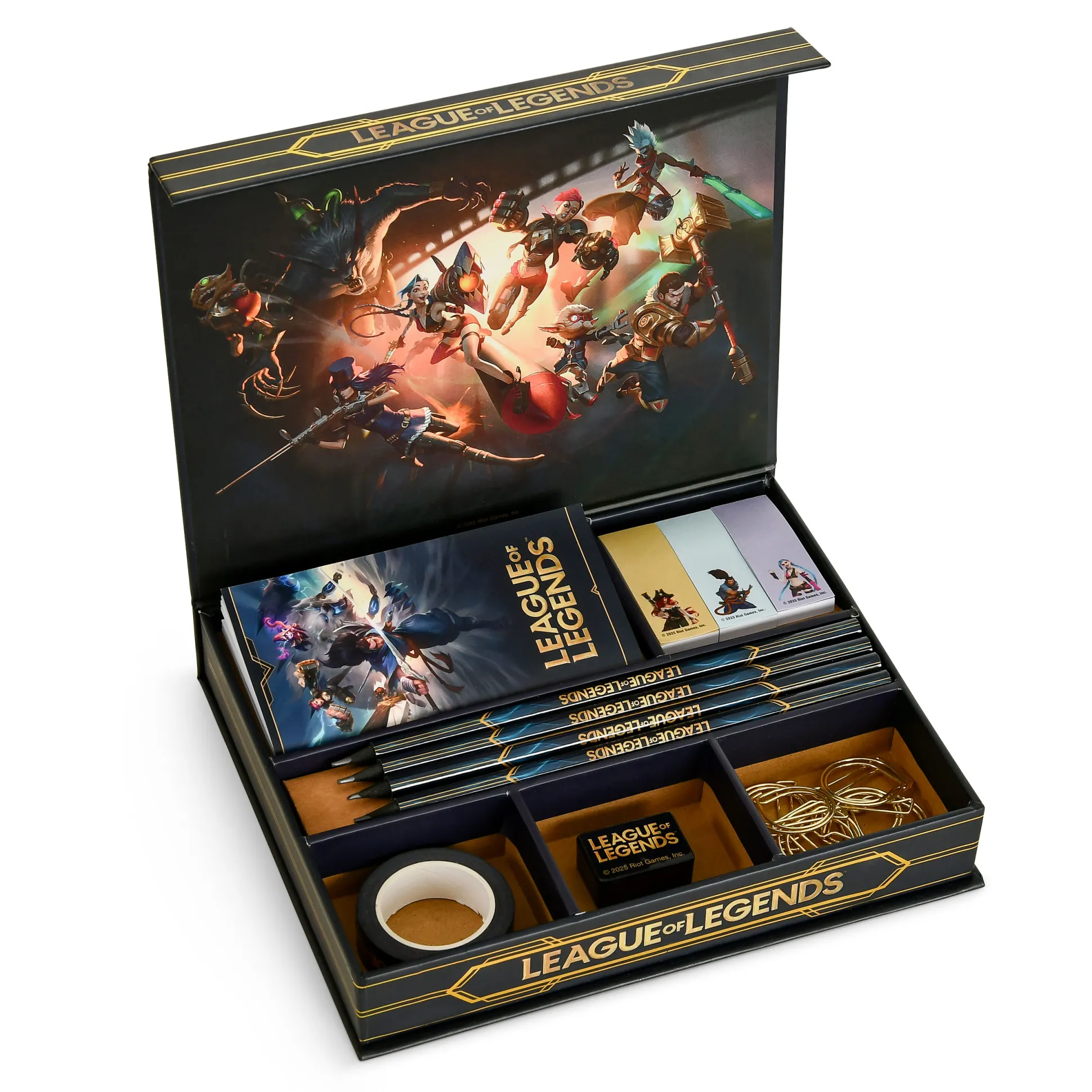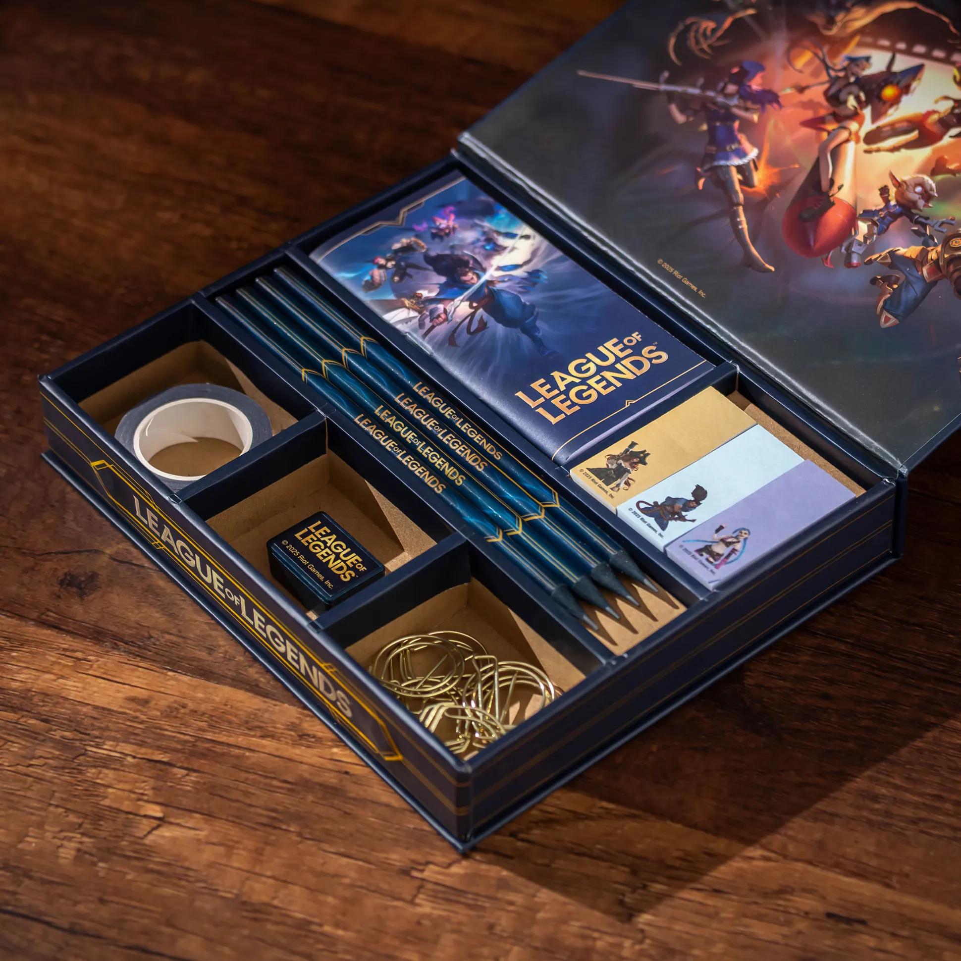Klaar om je to-dolijst te ganken? Deze officieel gelicenseerde League of Legends schrijfset boost je bureau. Erin: 3 plakmarkeerders en een mini-notitieboekje met champion-motieven voor snelle builds en ingevingen; 4 potloden plus een puntenslijper voor eindeloze schetsen; een rol plakband voor noodfixes; en 6 paperclips in logovorm om alles bij elkaar te houden. Geleverd in een geschenkdoos met magneetsluiting — perfect om cadeau te doen of als loot op je bureau te houden. School, uni, kantoor of ranked grind: wanneer de inspiratie spawnt, ben je er klaar voor.
