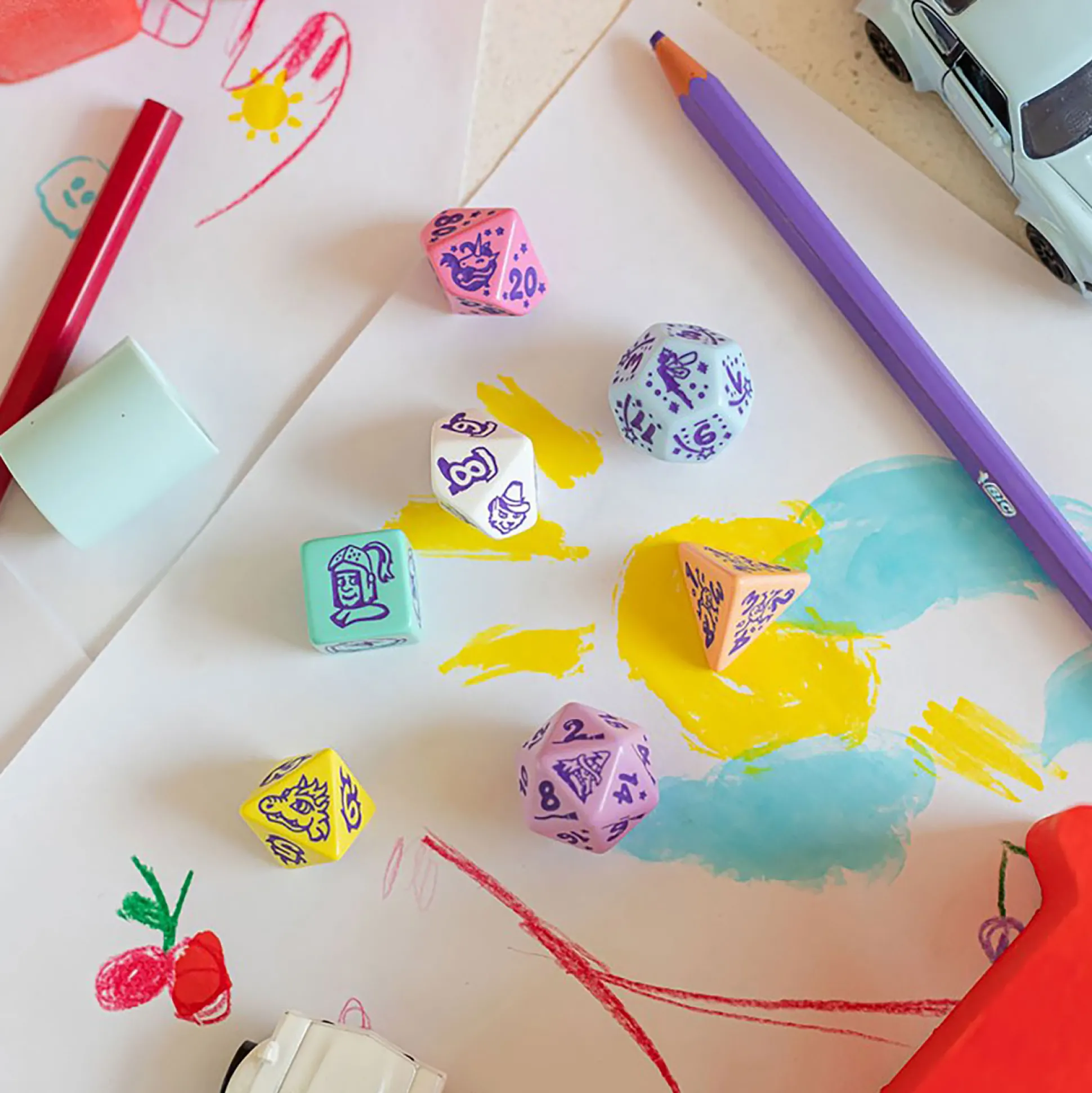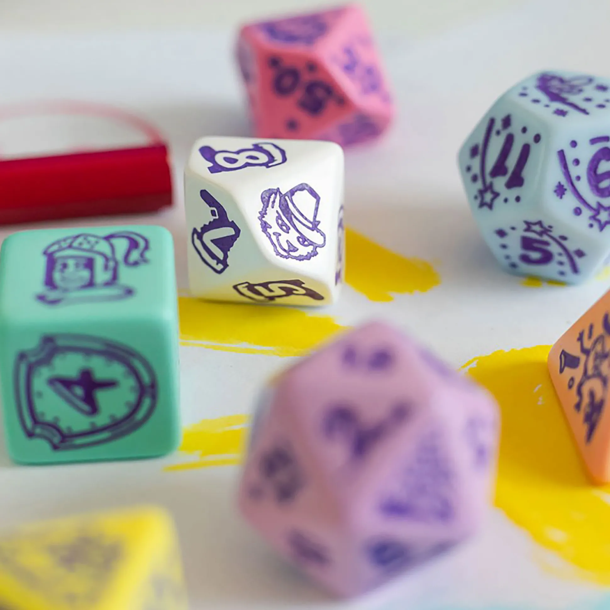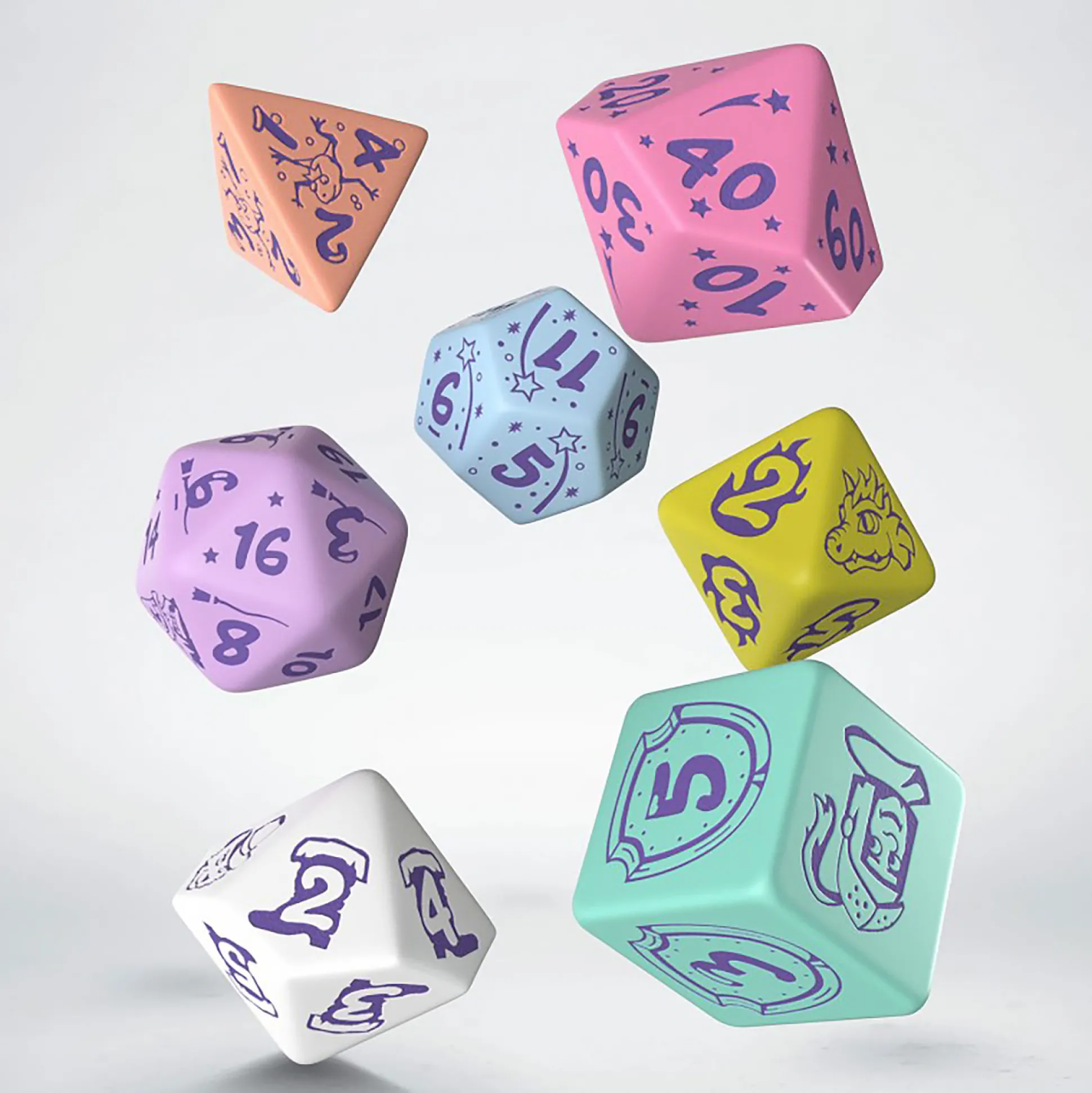 - Zijden met gegraveerde motieven, dobbelstenen met verschillende aantallen zijden