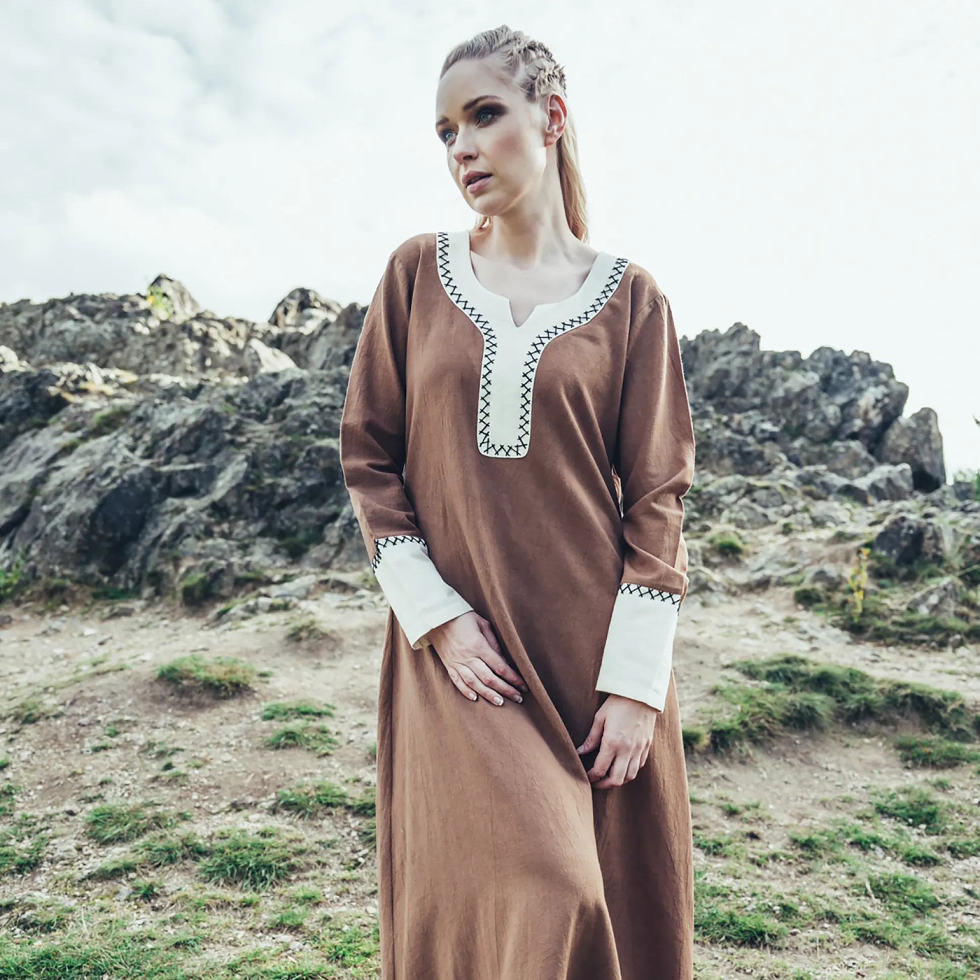 Met de Middeleeuwse Jurk Freya in zandkleur wordt u de heldin van uw eigen verhaal en verovert u de harten van mensen met uw charme en verfijning. Draag het op middeleeuwse festivals of LARP-evenementen en u zult bewonderende blikken trekken.
