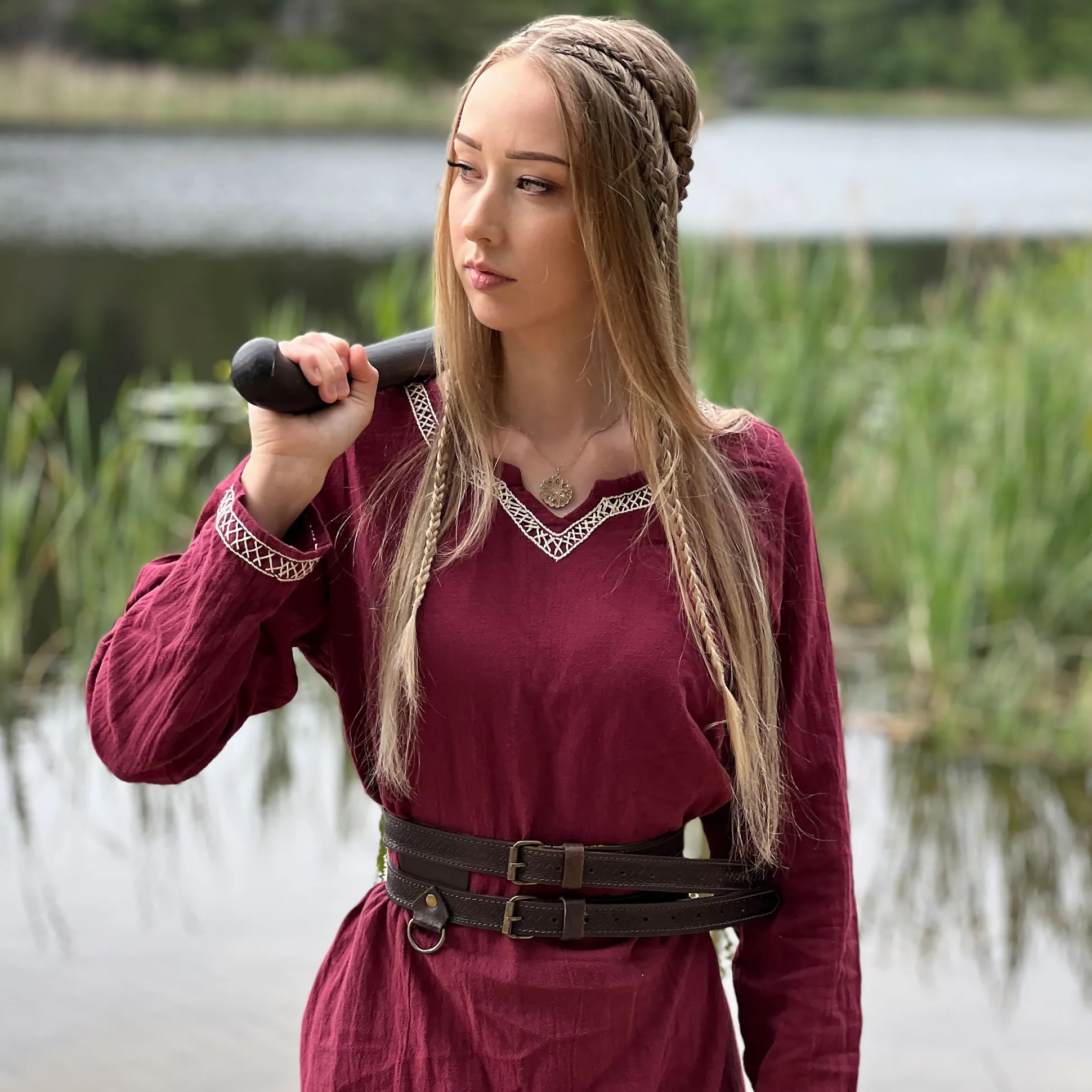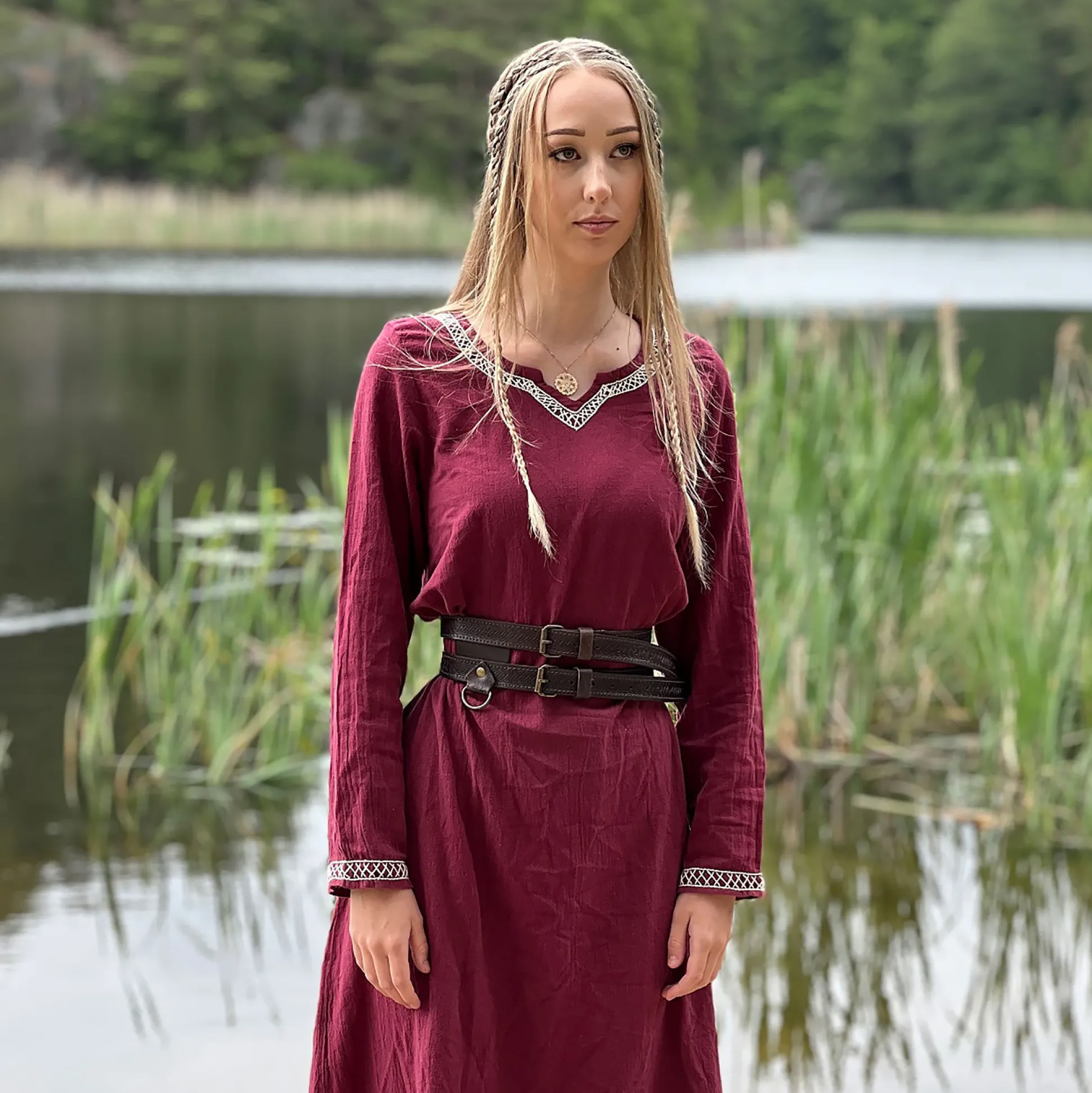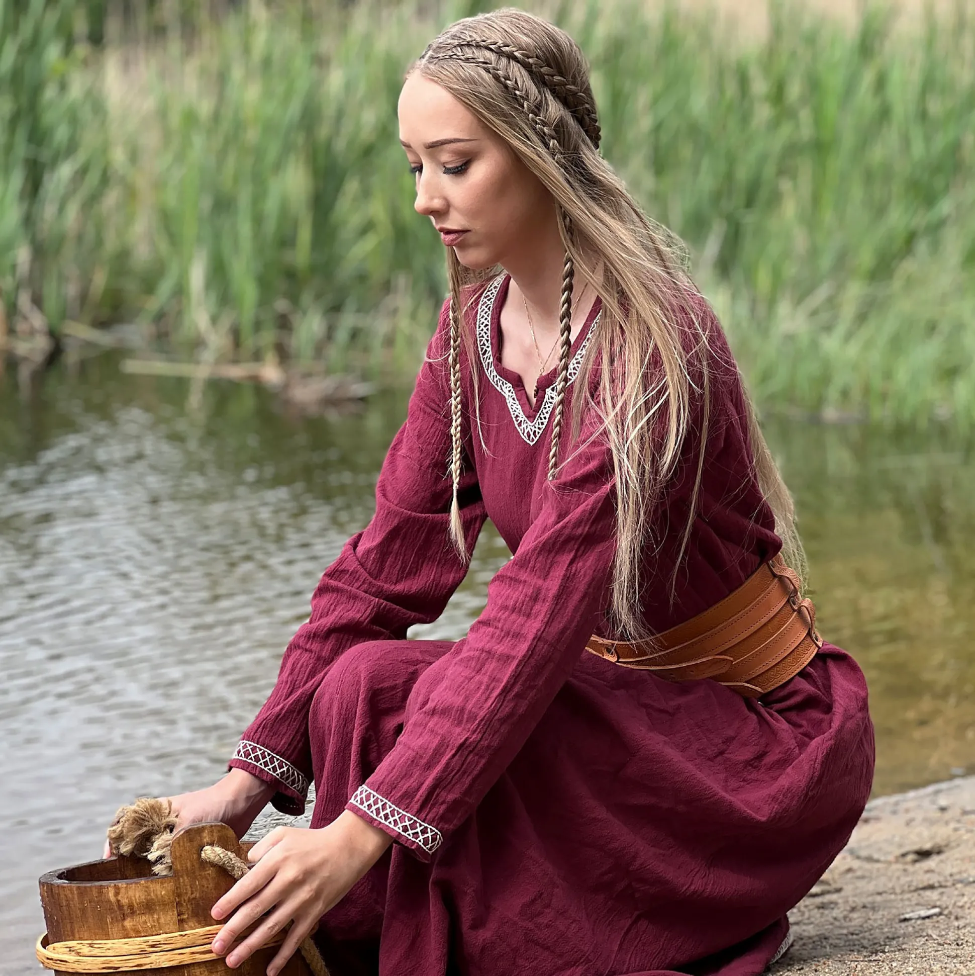 Maak een tijdreis naar de Middeleeuwen met onze jurk Brigida! Met dit rode, enkellange juweel word jij de koningin van elk kasteel, heksenverbranding of middeleeuwse markt. Het uitgebreide handborduurwerk op de contouren laat je schitteren in kaarslicht en de aangenaam zachte stof voelt als een zachte omhelzing van jouw ridder in glanzend harnas. Geen vervelend gedoe meer met aankleden, met Brigida ben je sneller gekleed dan de minstreel zijn volgende vers kan zingen. Wie heeft er jeans en t-shirts nodig als je de Middeleeuwen kunt hebben?
