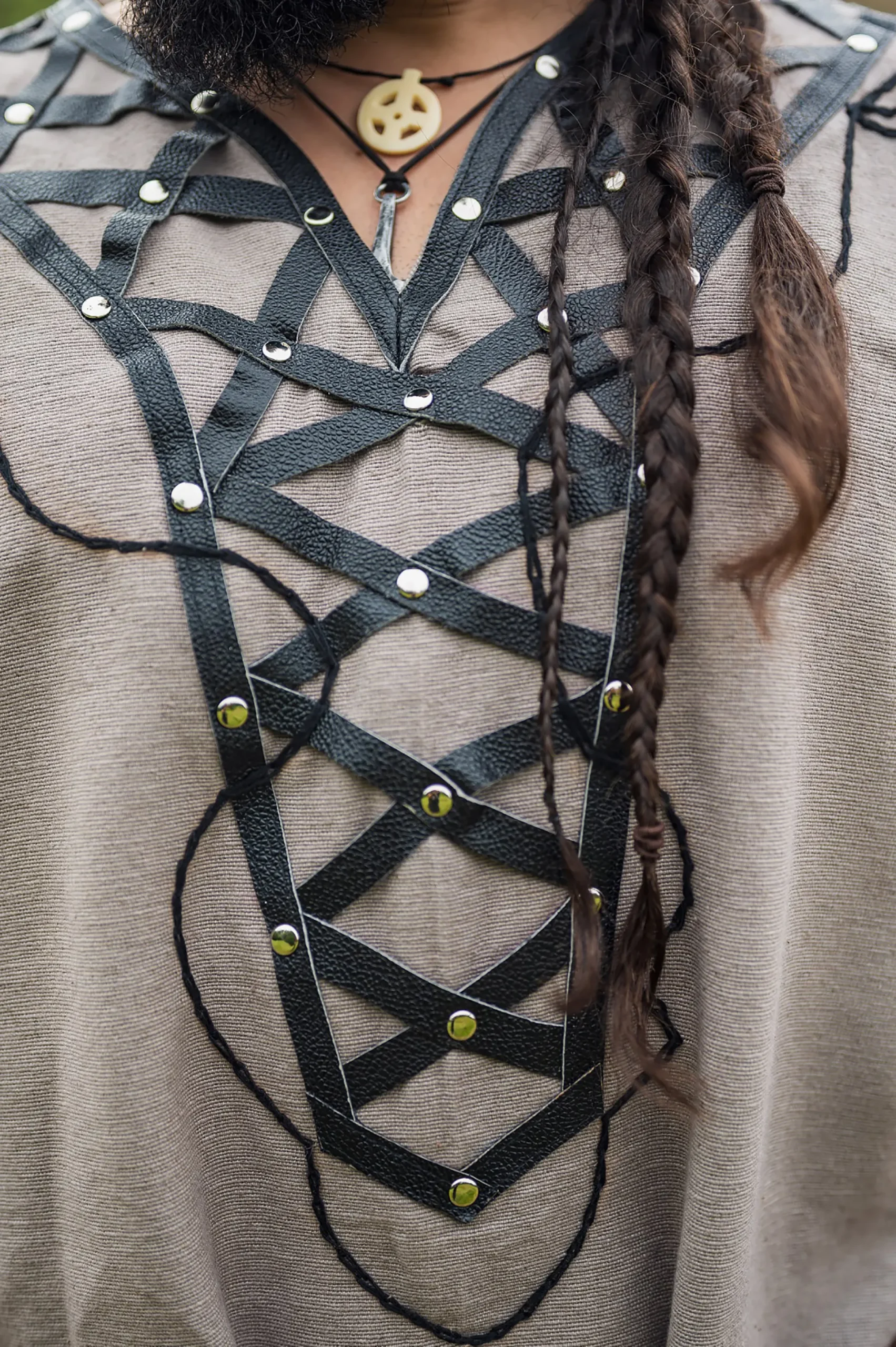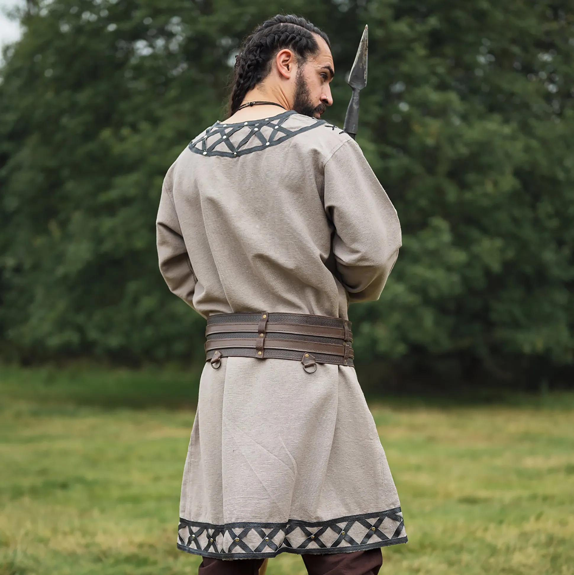 Met een rechte snit, lange mouwen en een ronde halslijn met puntige uitloop, is deze tuniek perfect voor mannen die hunkeren naar stijl en elegantie. De decoratieve lederen applicaties en studs geven het een onderscheidende noot en benadrukken je charismatische karakter. De lange split aan de voorkant garandeert je een optimale pasvorm en bewegingsvrijheid om je in elke situatie veilig te voelen. De applicaties zijn gemaakt van echt leer en geven de tuniek een bijzonder nobele noot. Het materiaal is gemaakt van 100% katoen en staat voor de hoogste kwaliteit en duurzaamheid.