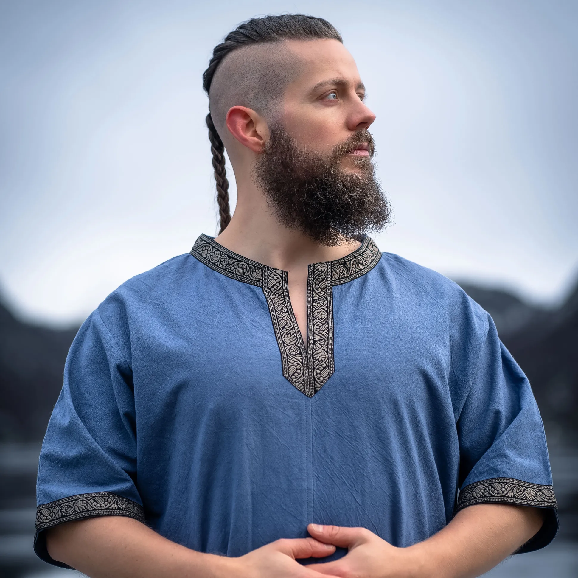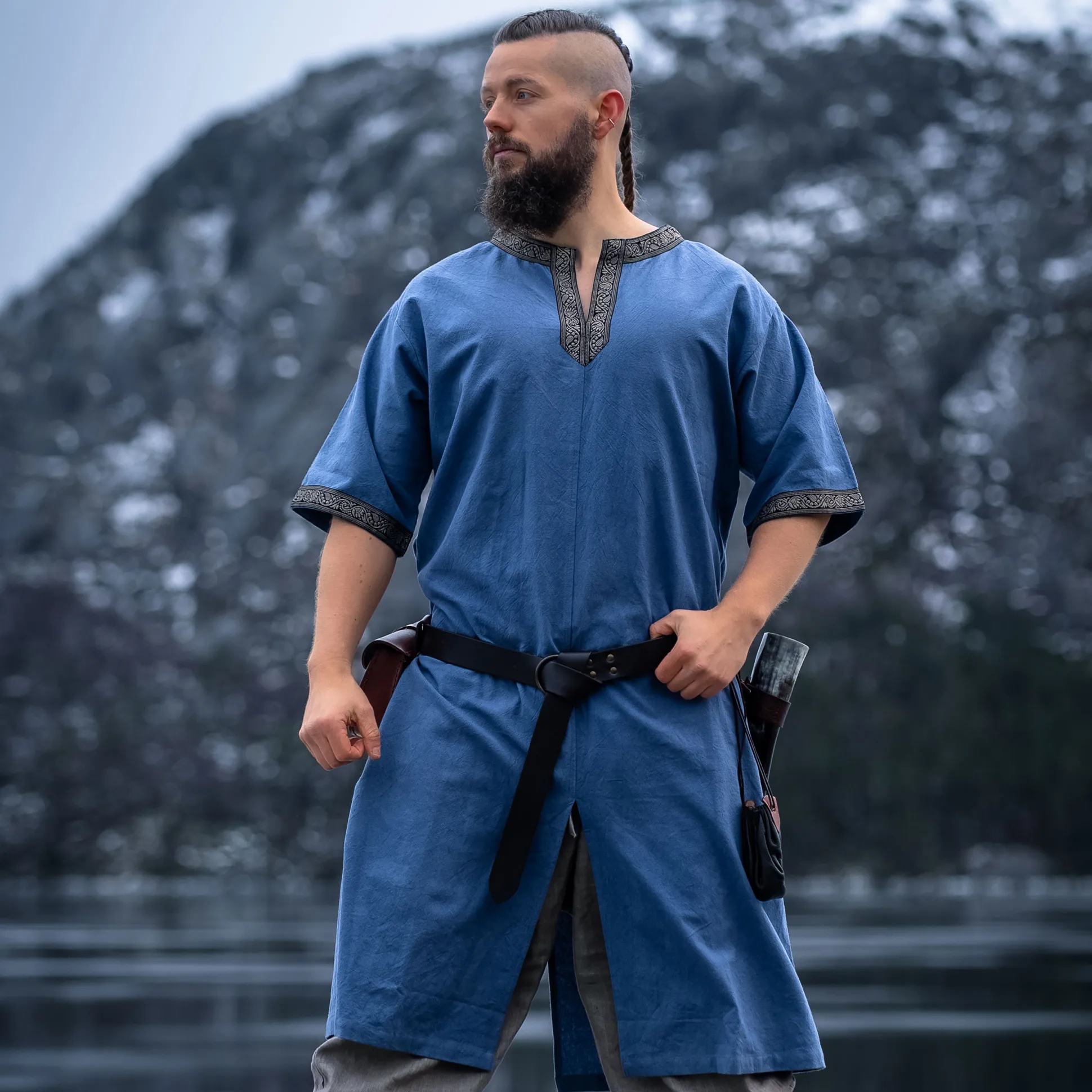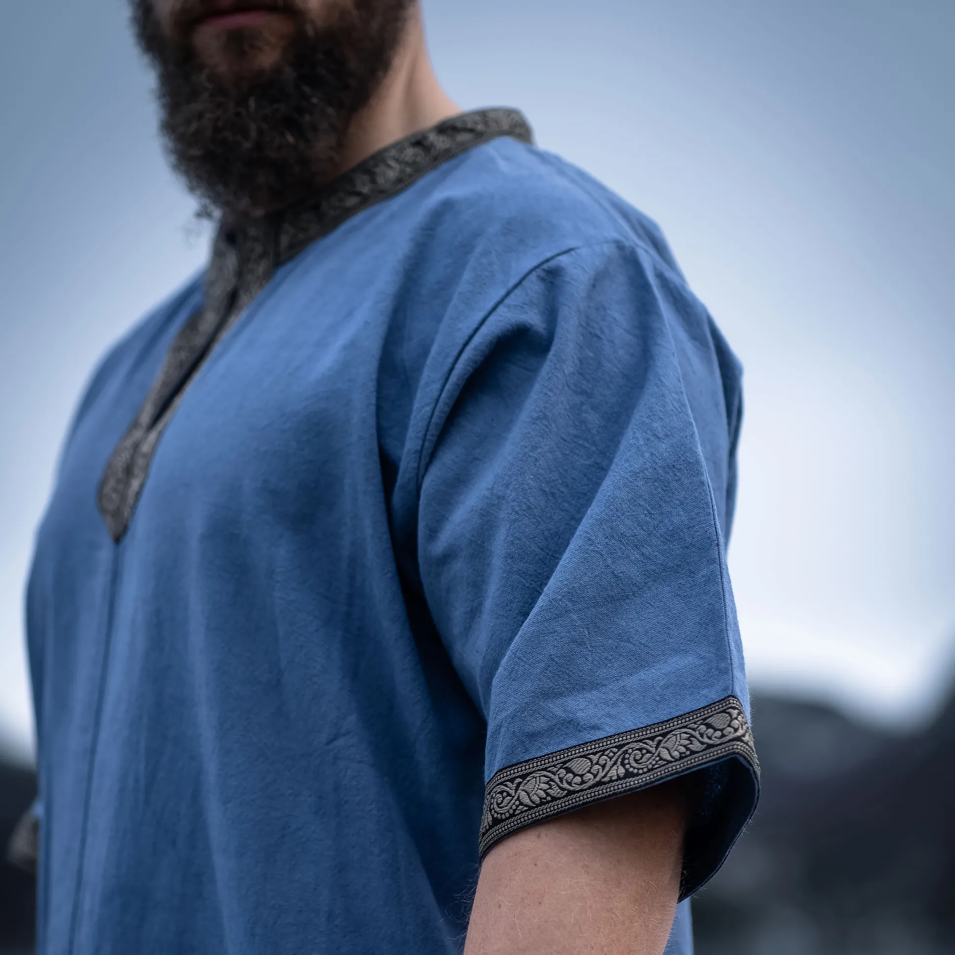 Ben je klaar om je onder te dompelen in de fascinerende wereld van de Middeleeuwen? Met onze hoogwaardige middeleeuwse korte mouwen tuniek Richard in koninklijk blauw ben je goed uitgerust! De rechte snit en korte mouwen zorgen voor optimale bewegingsvrijheid, terwijl je je stort in de drukte van de volgende middeleeuwse markt of LARP-evenement. De ronde halslijn met puntige uitloop en de decoratieve rand aan het decolleté en de mouwen geven je dat bepaalde iets en maken je een echte blikvanger. En het beste: Ondanks het hoge draagcomfort is de tuniek extreem duurzaam. Dus, waar wacht je nog op? Duik in de wereld van de Middeleeuwen en voel je als een echte ridder!