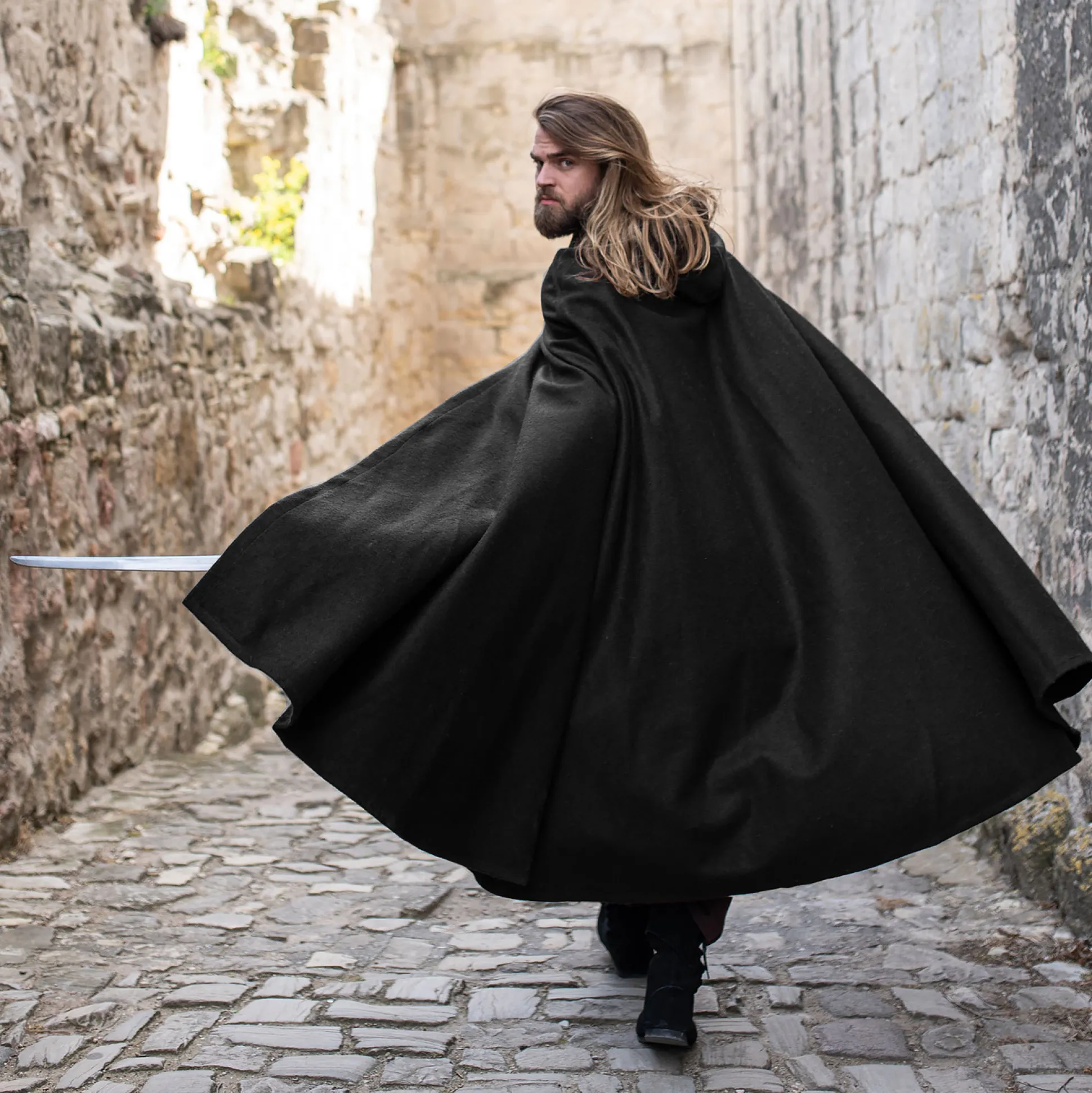 Hoor je de roep van de Middeleeuwen? Dan hebben we precies wat je nodig hebt! Met de middeleeuwse wollen mantel met wolvenklem in zwart van Elbenwald, ben je de ster van elk middeleeuws evenement. Deze mantel is niet alleen een blikvanger, maar ook praktisch: Dankzij de metalen klem bij de hals is hij gemakkelijk te sluiten en de korte kap biedt extra bescherming. Met een totale lengte van 131 cm en een stofbreedte van 231 cm biedt hij voldoende ruimte om je in te verstoppen of om in te knuffelen. En het beste: Bij lichte regen werkt de mantel zelfs waterafstotend! Gemaakt van zware wollen mix in de kleur zwart, is hij de perfecte metgezel voor elk seizoen. Dus, waar wacht je nog op? Duik in de wereld van de Middeleeuwen met Elbenwald!