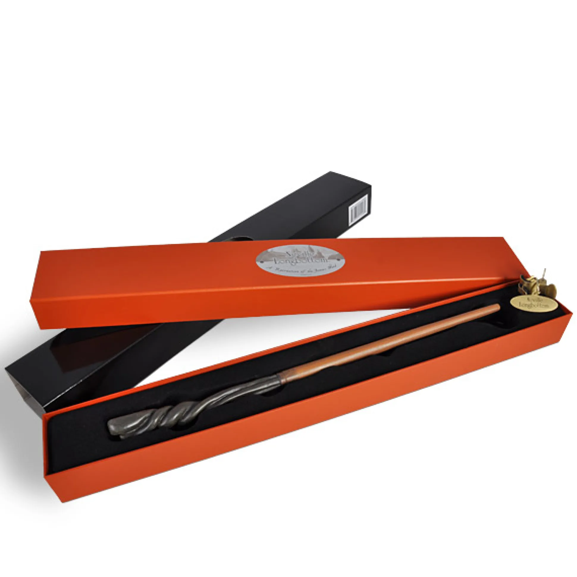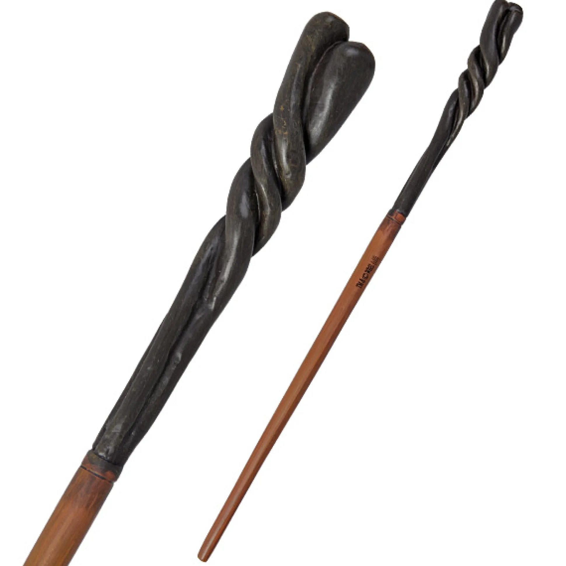 Het handvat van de toverstok is donkerbruin met een gevlochten look. Hij is licht gebogen zodat hij prettig in de hand ligt. De rest van de stok is eenvoudig houtbruin.