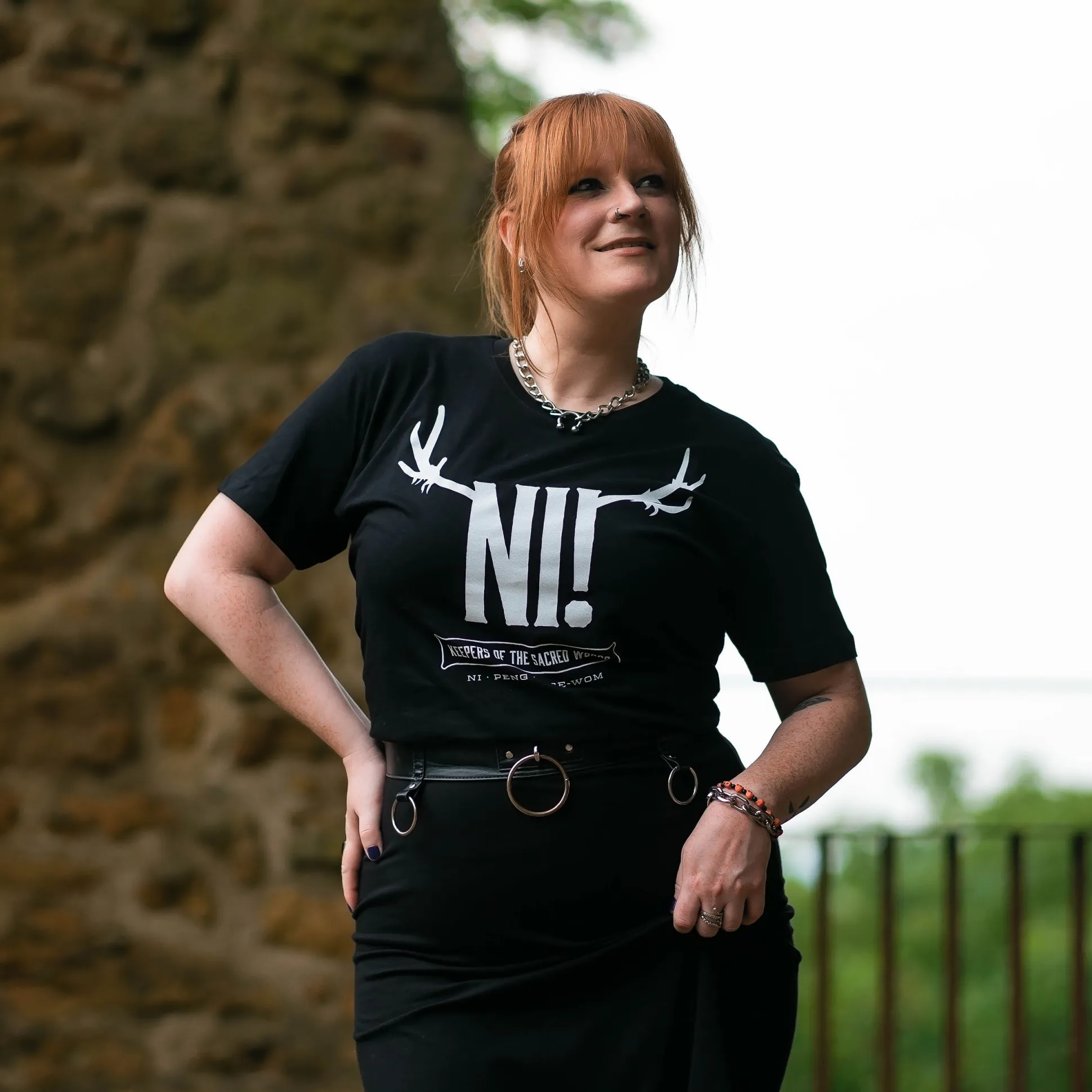 Ni! Als je nu spontaan een struikje wilt halen, is dit T-shirt jouw roeping. Met een grote Ni!-frontprint en de trotse tekst ‘Keepers of the Sacred Words’ eert het de Ridders die ‘Ni!’ zeggen uit Monty Python en de Heilige Graal — zonder struikje vereist. Zwart, comfy en recht gesneden met ronde hals: perfect voor queestes naar de bank, cons of spontane kokosnoot-klik-klak-acts. Draag het en laat zien dat je vloeiend Ni spreekt.