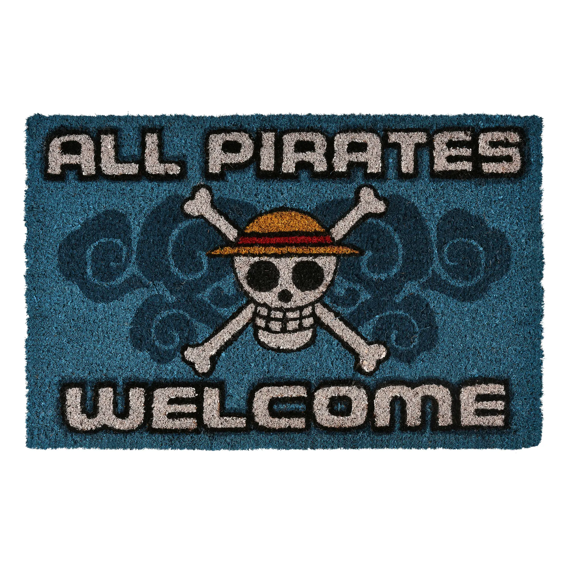 Alle piraten welkom — al bij de voordeur. Deze officieel gelicentieerde One Piece deurmat toont de tekst ‘All Pirates Welcome’ met schedellogo en laat meteen zien: hier woont een fan.