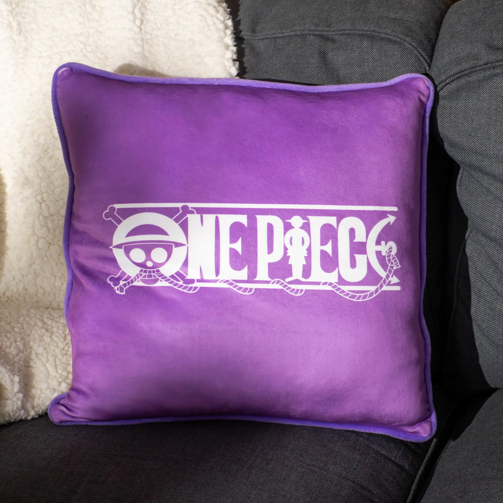 Ahoy, piratenmaatje! Met het officieel gelicenseerde One Piece: Gear 5 – Monkey D. Luffy Kussen haal je de Koning der Piraten rechtstreeks naar je bank! Dit kussen is niet alleen een comfortabel accessoire, maar ook een statement voor elke anime- en mangafan. Het grootformaat ontwerp van Monkey D. Luffy in zijn epische Gear 5-vorm maakt jouw bank het middelpunt van elk Grand Line-feest. En de achterkant? Versierd met het coole logo, zodat iedereen weet dat jij een echte One Piece-fan bent. Perfect om mee te knuffelen, te chillen of als steun tijdens je volgende One Piece-bingewatchmarathon. Met een formaat van 39 x 39 cm en stijlvolle kleuren in wit en paars is het een echte blikvanger. Waar wacht je nog op? Hijs de zeilen en grijp dit kussen – je woonkamer zal nooit meer hetzelfde zijn!