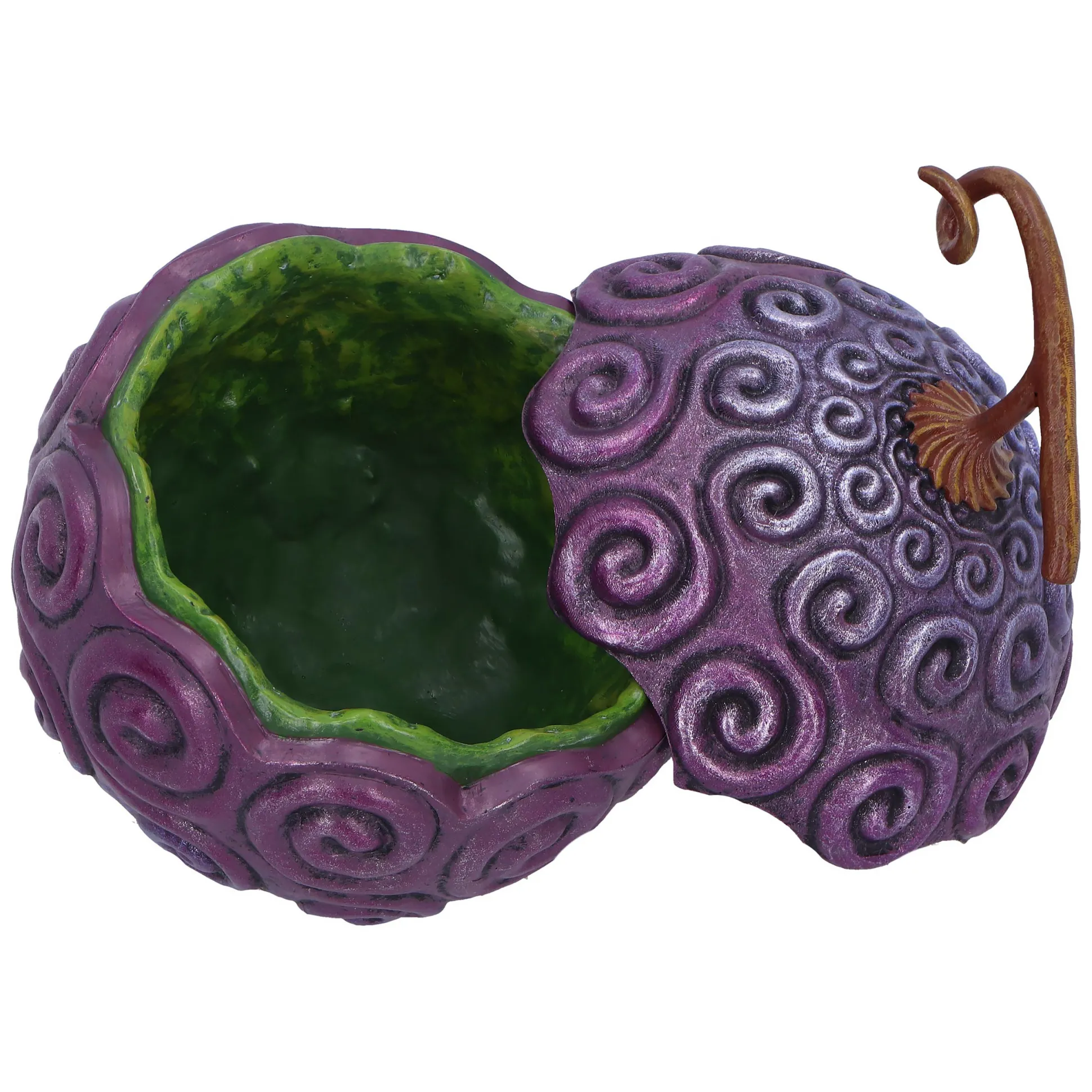 Als je altijd al een stukje van de Gomu Gomu no Mi in huis wilde halen zonder zelf in een rubbermens te veranderen, dan is deze officieel gelicentieerde One Piece opbergdoos precies de schat die je zoekt. Van buiten lijkt hij op de legendarische Gomu Gomu Devil Fruit, rijk gedetailleerd vormgegeven en met de hand beschilderd, zodat elke krul en elke welving van de vrucht mooi naar voren komt. Met zijn compacte afmetingen van 10 x 12,5 x 10 cm past hij makkelijk op je bureau, in de boekenkast of naast je One Piece-mangacollectie en staat hij klaar om je geheime buit te bewaken. Of het nu gaat om sieraden, muntjes, een foto van je favoriete piraat of gewoon de sleutel tot je eigen One Piece – til simpelweg de bovenkant van de vrucht op en je hebt je schatten meteen bij de hand. Perfect voor iedereen die zich even lid van de Straw Hat-crew wil voelen zonder de Grand Line over te hoeven steken, en een must-have voor elke One Piece-fankamer die een stijlvol piraten-upgrade kan gebruiken.