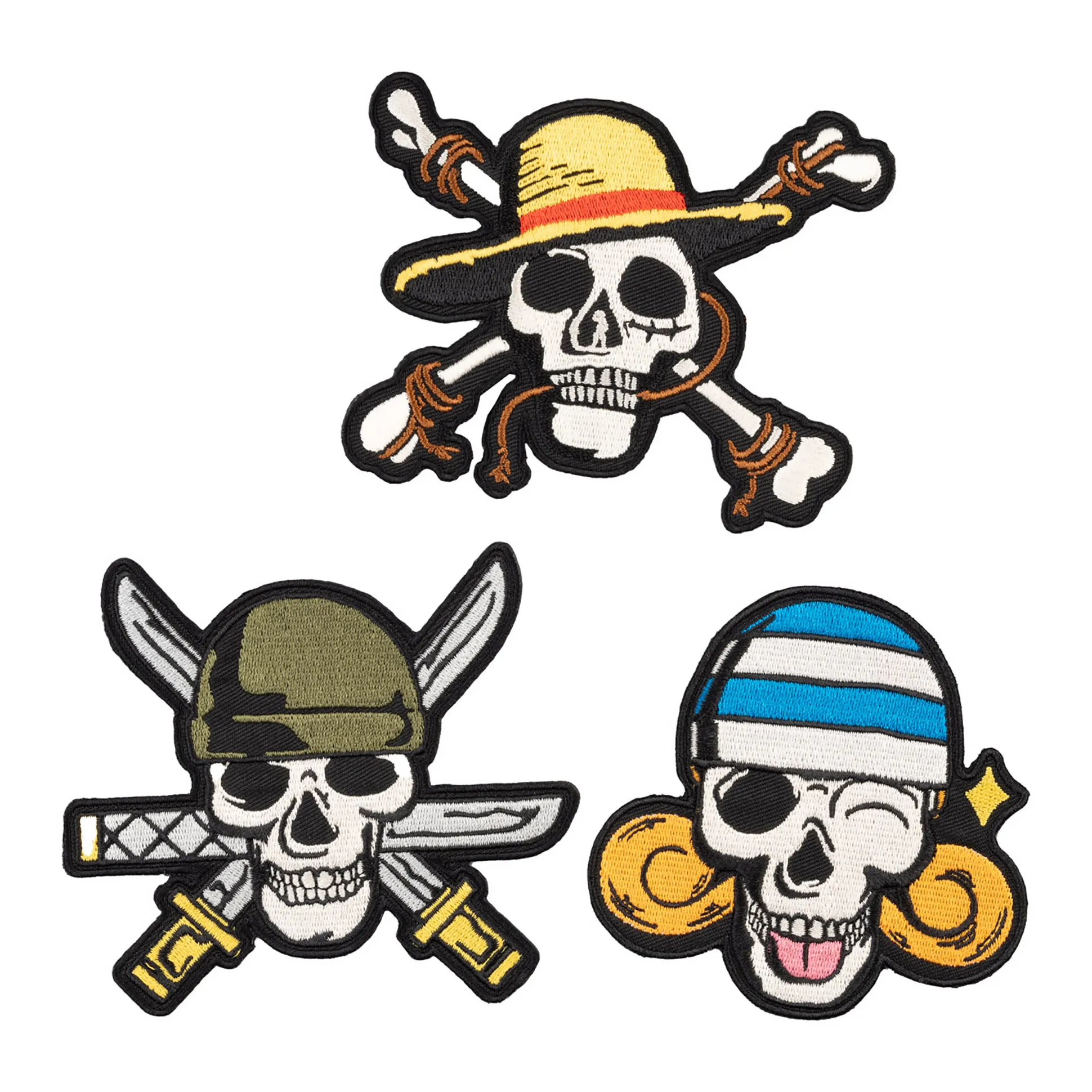 In de set: 3 geborduurde skull-designs – Monkey D. Luffy, Nami en Roronoa Zoro. Elk ca. 7–9 cm hoog. Opstrijkbaar of op te naaien: jij kiest.