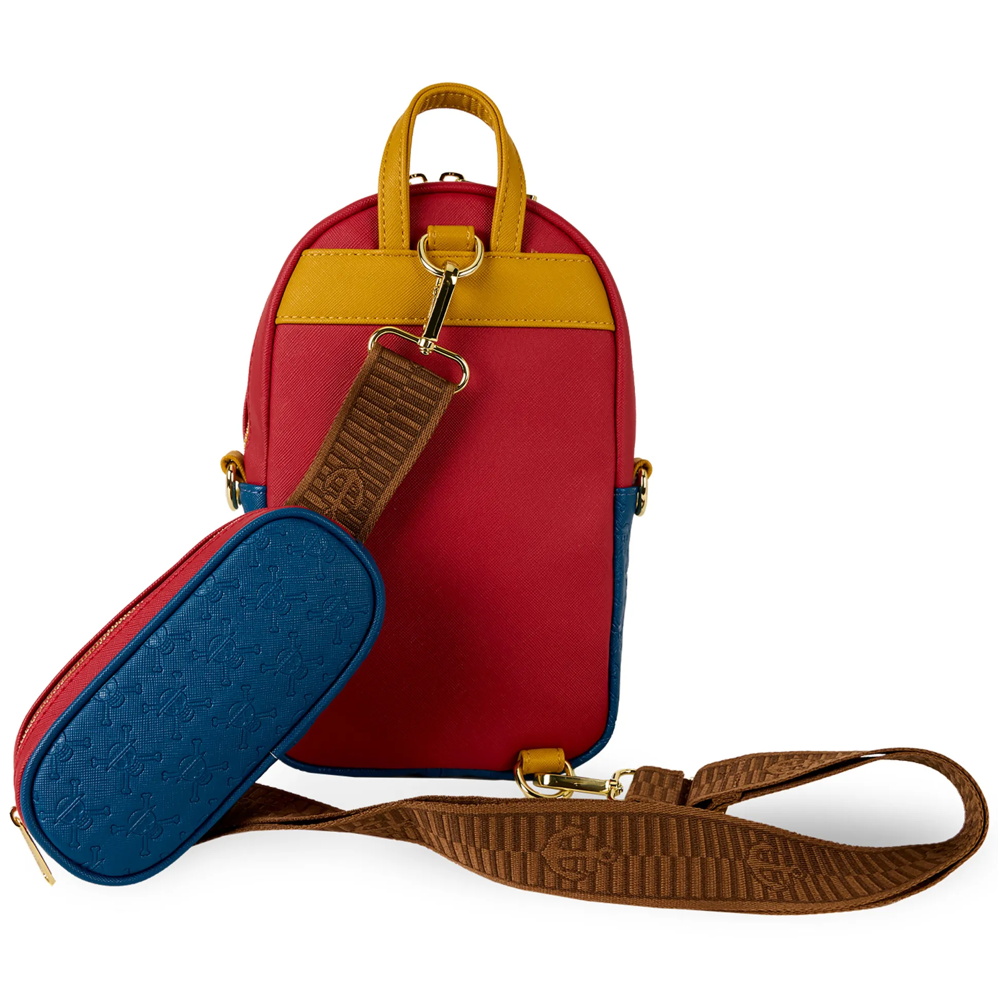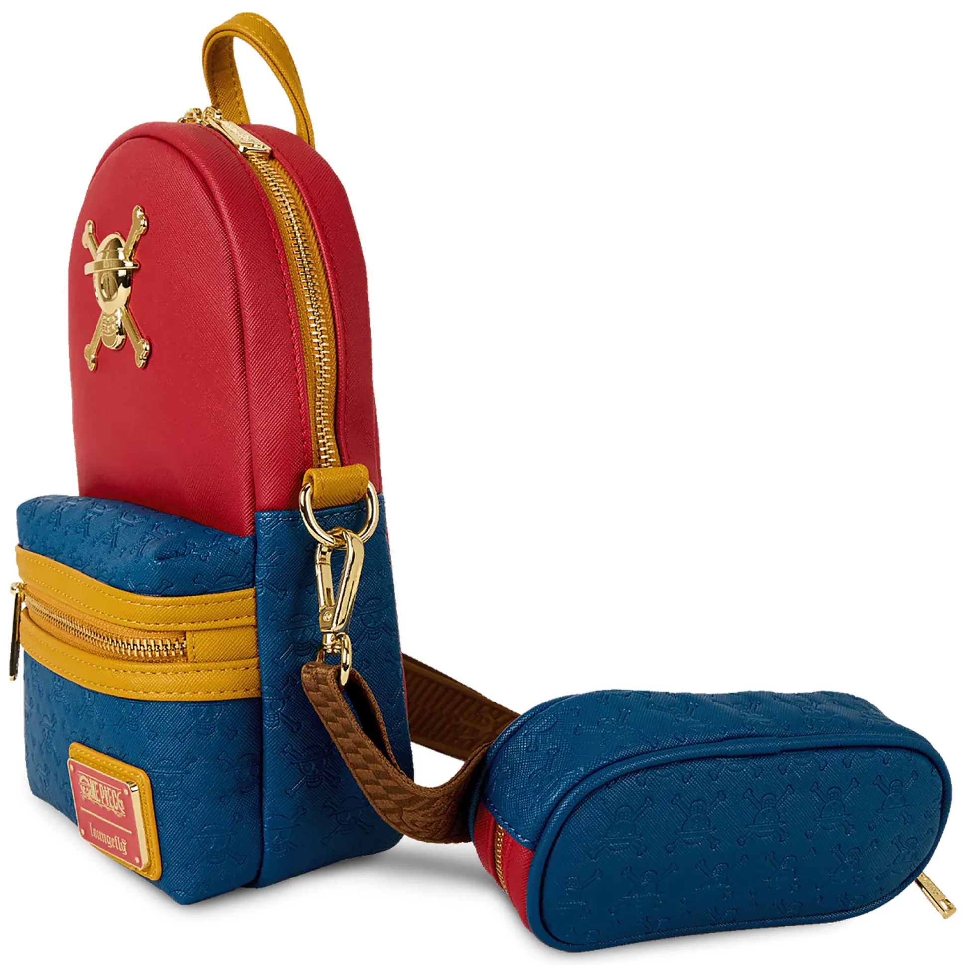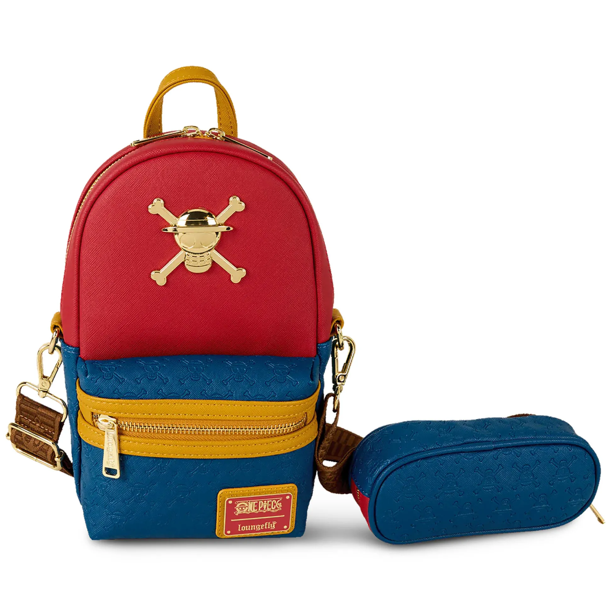 - piratencrew design met Straw Hat Crew metalen logo en Loungefly label aan de voorkant