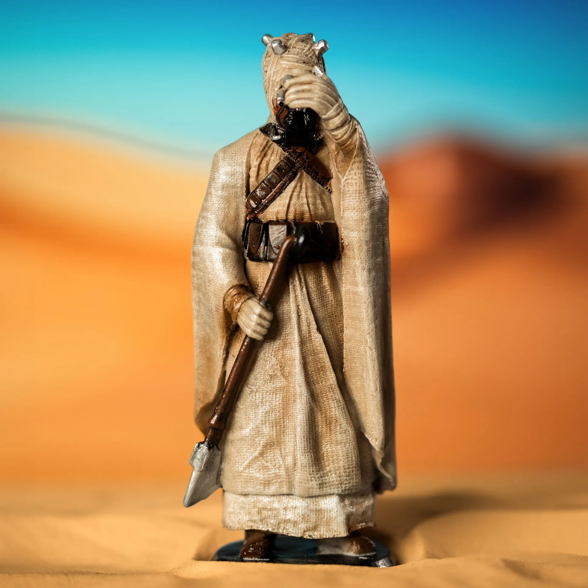 De figuren komen uit de legendarische Shepperton Design Studios, de bakermat van de originele Stormtrooper-look. Je ziet dezelfde liefde voor details terug in elke Tusken Raider: van de omwikkelde gewaden en ademapparatuur tot hun ruige woestijnuitrusting, alsof ze zo uit de Dune Sea zijn komen aanlopen. Elke figuur is ongeveer 14 cm hoog, staat stevig op een eigen base en is met de hand beschilderd, zodat iedere plooi, beschadiging en schaduw mooi uitkomt op je plank.