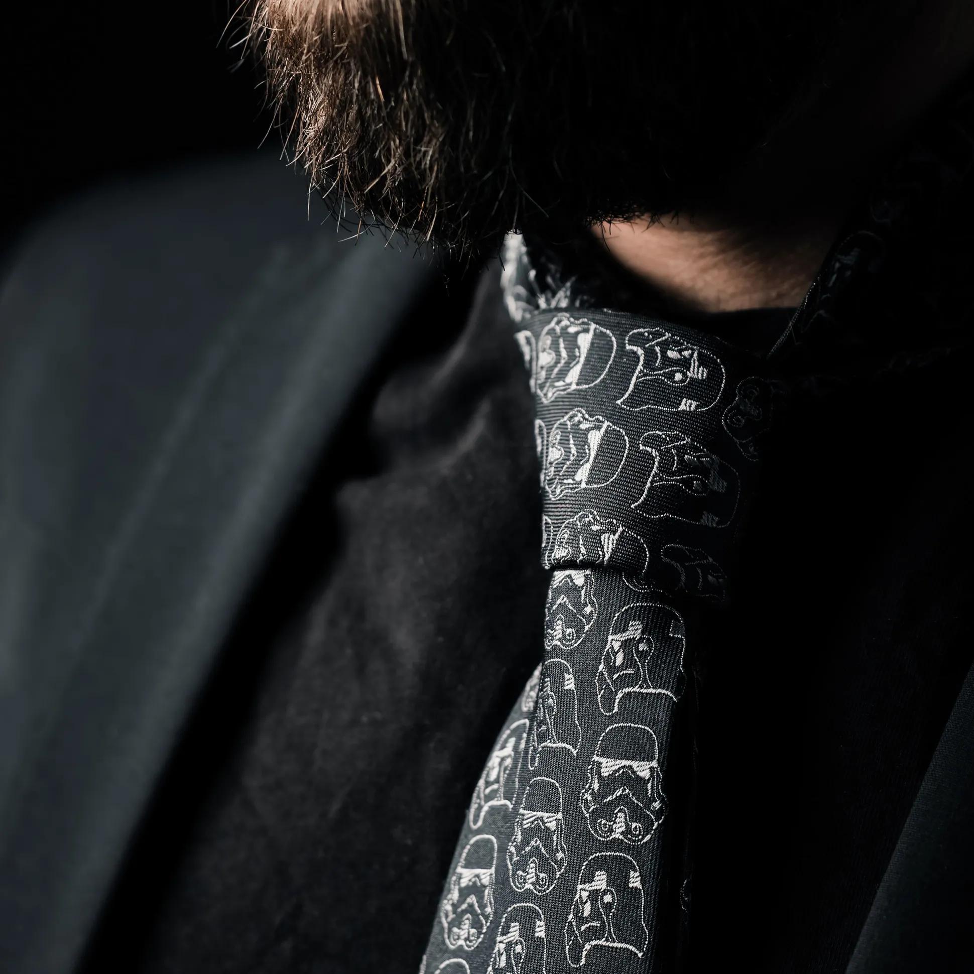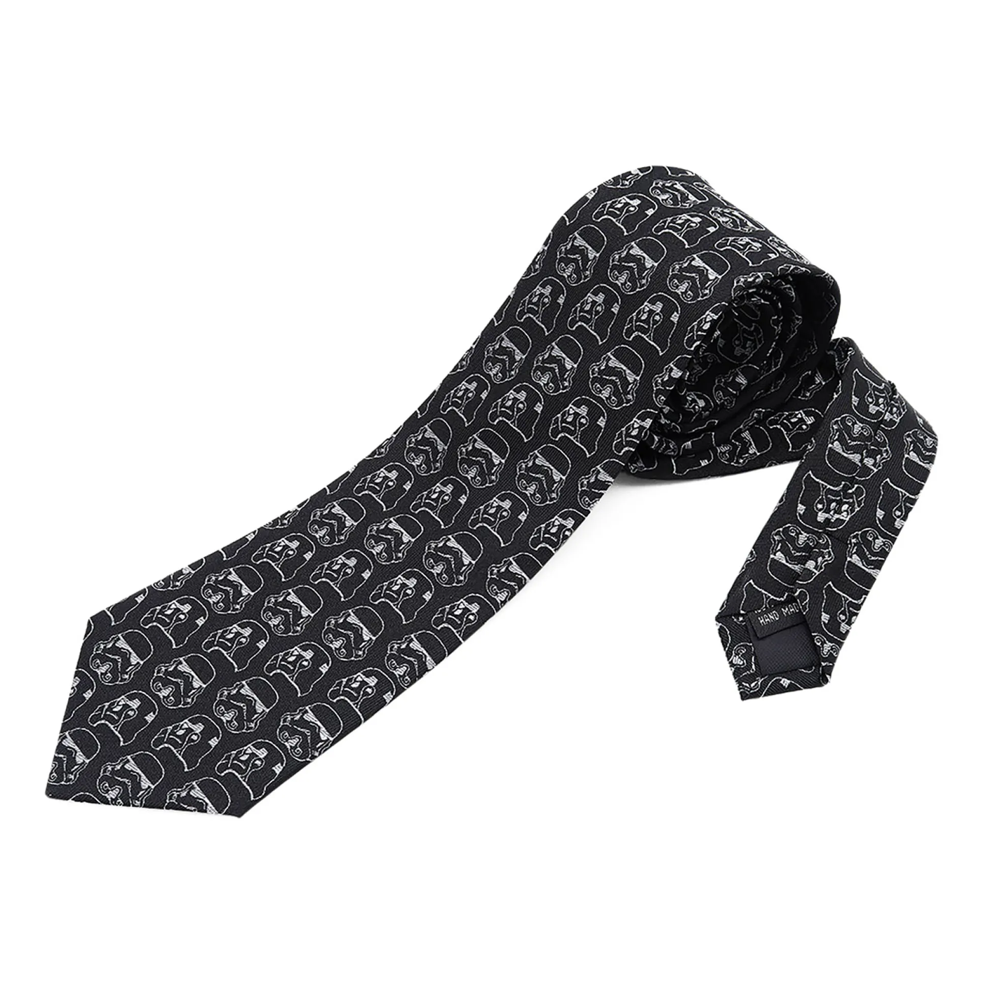 Over de hele stropdas loopt een subtiel all-over patroon van Stormtrooper-helmen – duidelijk genoeg dat elke fan het ziet, maar toch netjes genoeg voor vergaderingen, bruiloften of tentamens. Zwart, minimalistisch, stijlvol – en onmiskenbaar Star Wars.