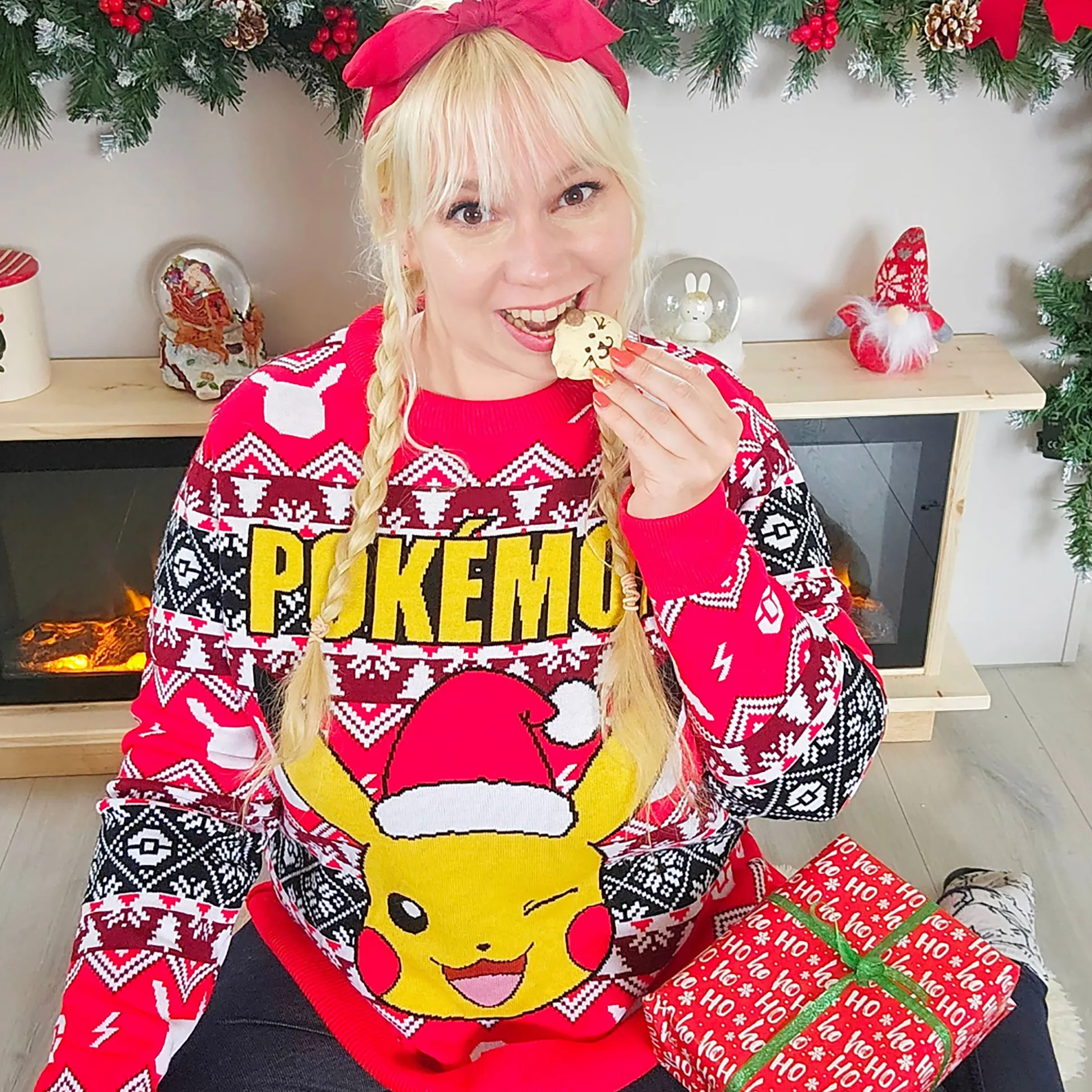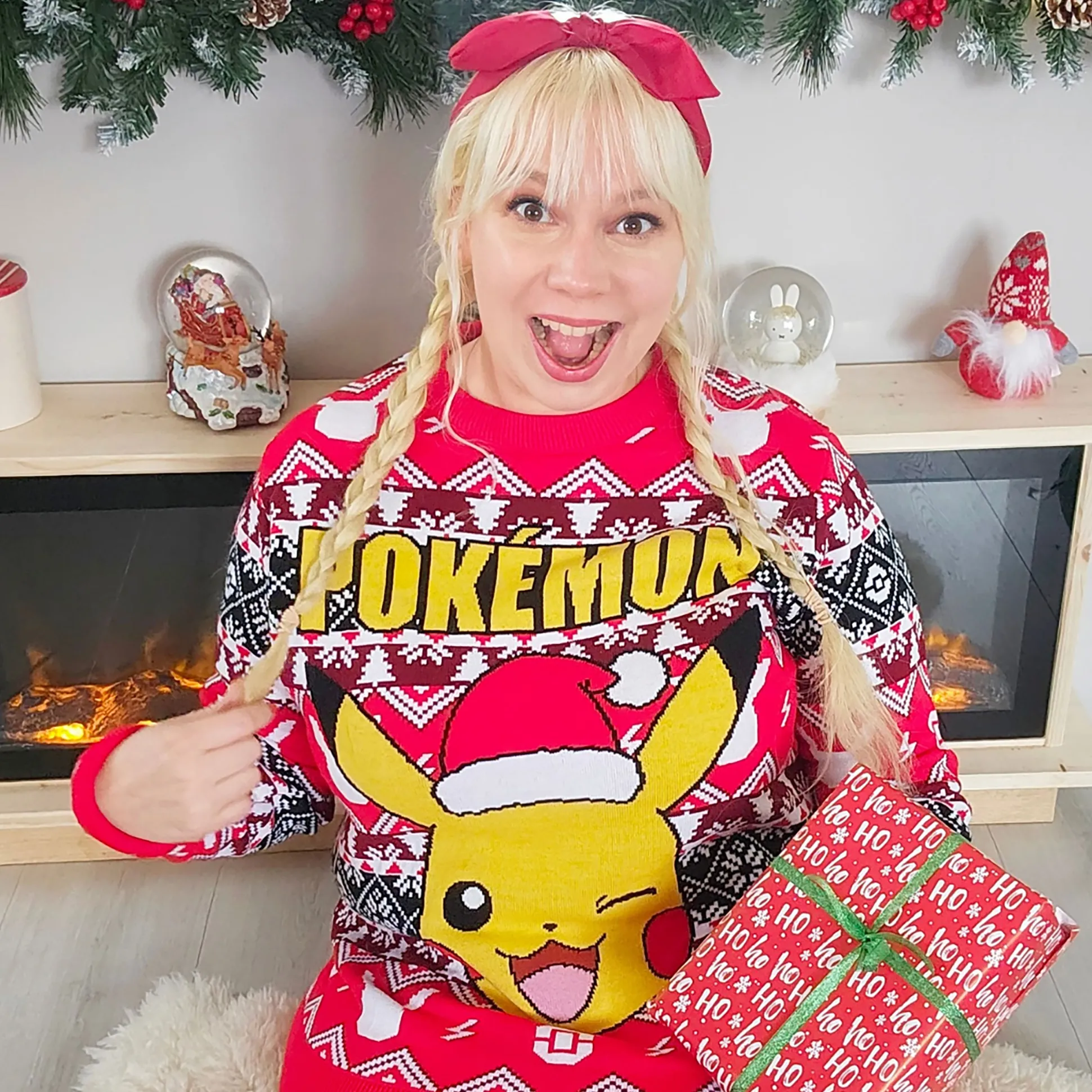 - in een winters Pikachu design met een kerstmuts