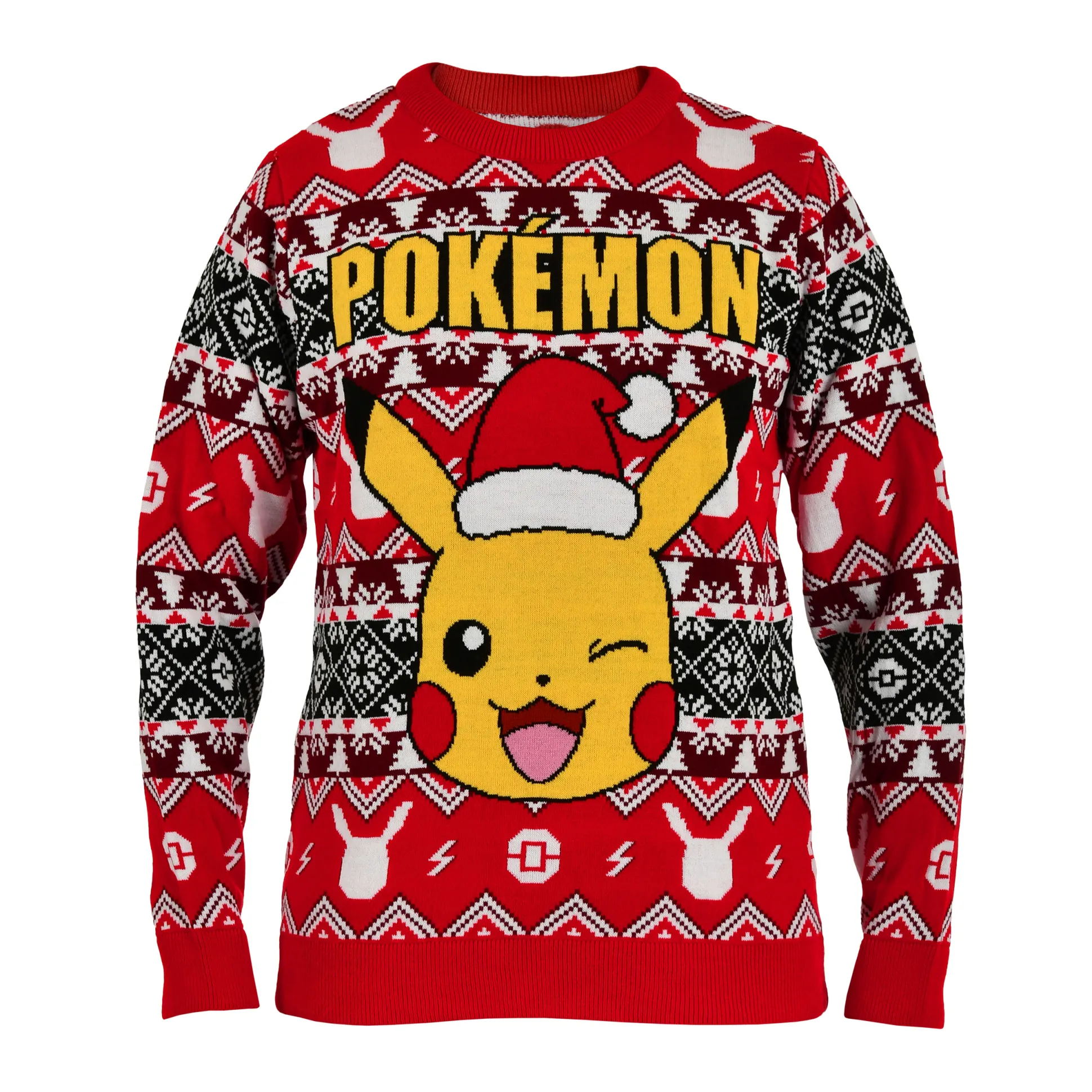 Tijd om de feestdagen op te laden! Deze officieel door Nintendo gelicenseerde foute kersttrui laat Pikachu zien in winterlook met kerstmanmuts — feestelijk, brutaal en meteen herkenbaar. Het Noorse patroon voor én achter mixt Poké Balls en bliksemschichten tot een design waar zelfs Charmander van zou blozen. Comfortabel voor elke dag: ronde hals, rechte pasvorm en brede, stevige boorden. Zacht breisel dat je warm houdt — tijdens het cadeaushoppen of een bingesessie. Pak je nieuwe favoriete kersttrui en breng Pokémon-sfeer onder de boom.