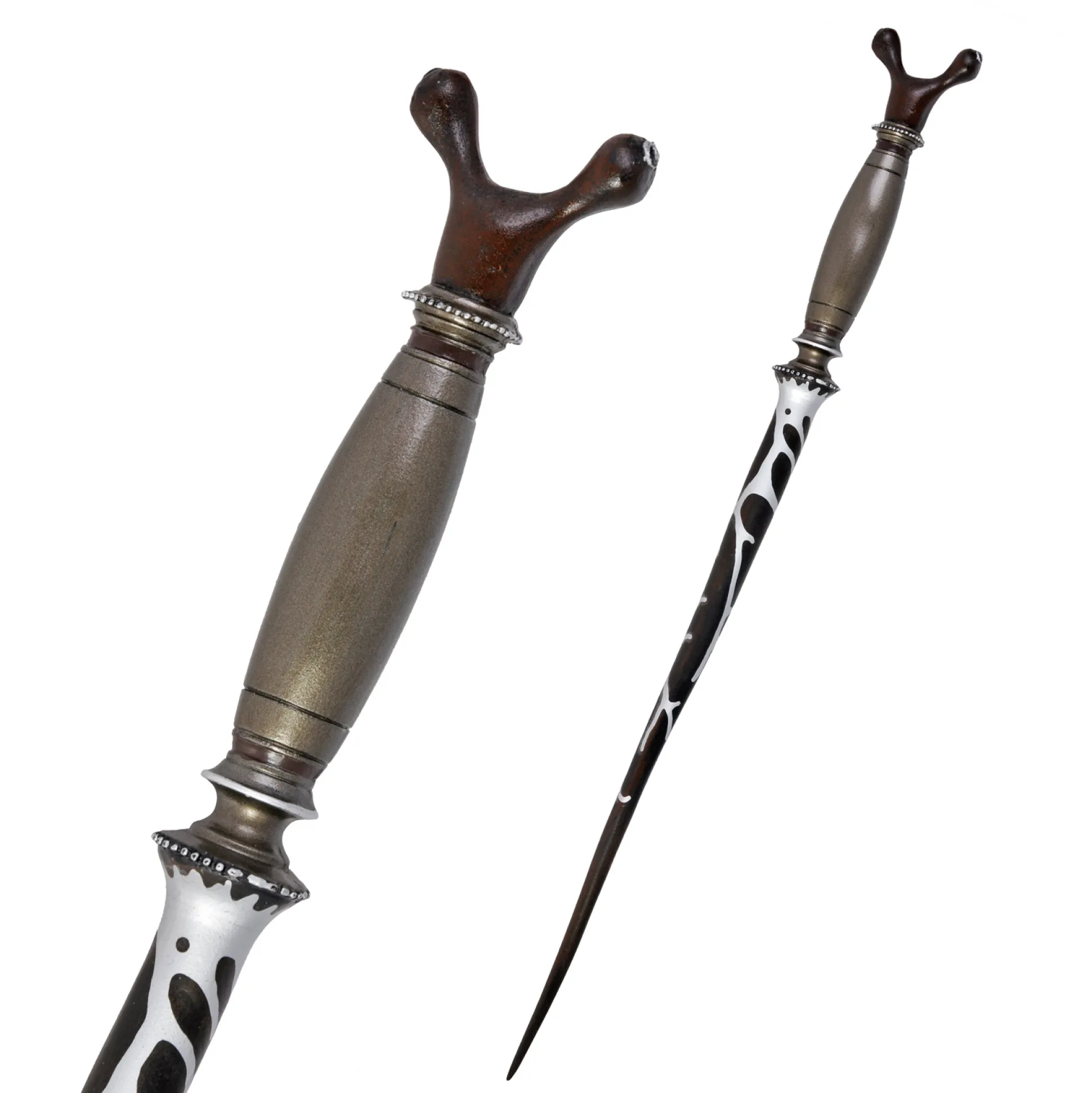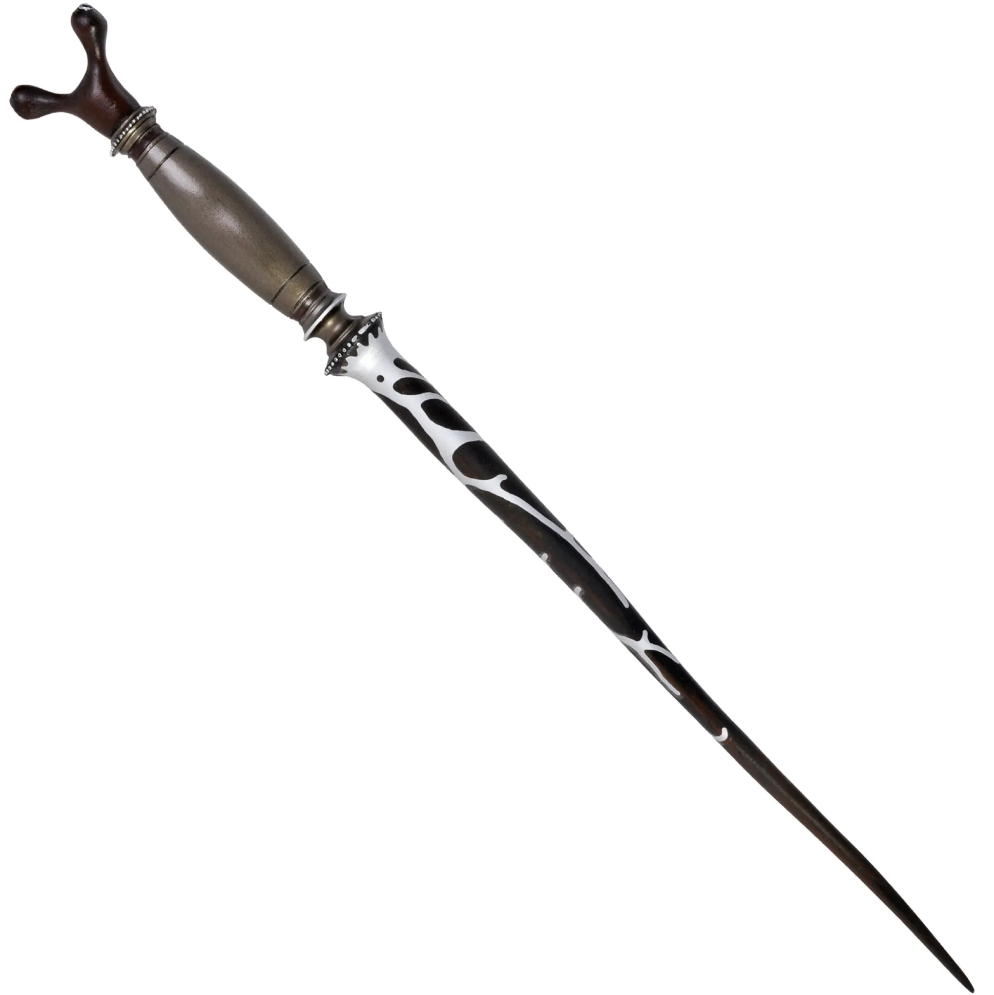 Zijn toverstok is donkerbruin en glad, en versierd met een spiraalvormig patroon in zilverkleur. De punt van de stok is gebogen. Boven en onder het handvat bevinden zich twee sierranden met zilverkleurige details. Het handvat is iets lichter van kleur en eindigt in twee hoornvormige punten, die eveneens met zilverkleurige applicaties zijn afgewerkt.