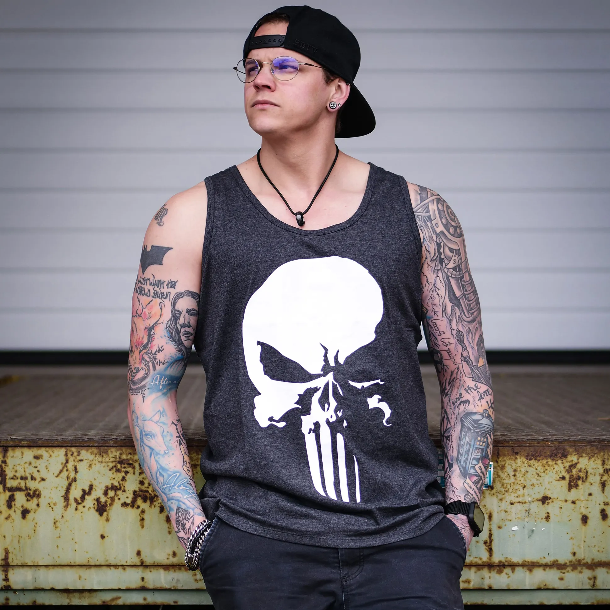 Grijs tanktop, schedel, nul compromissen: dit officieel gelicentieerde Marvel heren‑tanktop zet de iconische Punisher Skull pontificaal op je borst — groot, opvallend, niet te missen. Perfect voor de sportschool, festivals of wanneer je T‑shirt een dag vrij heeft.