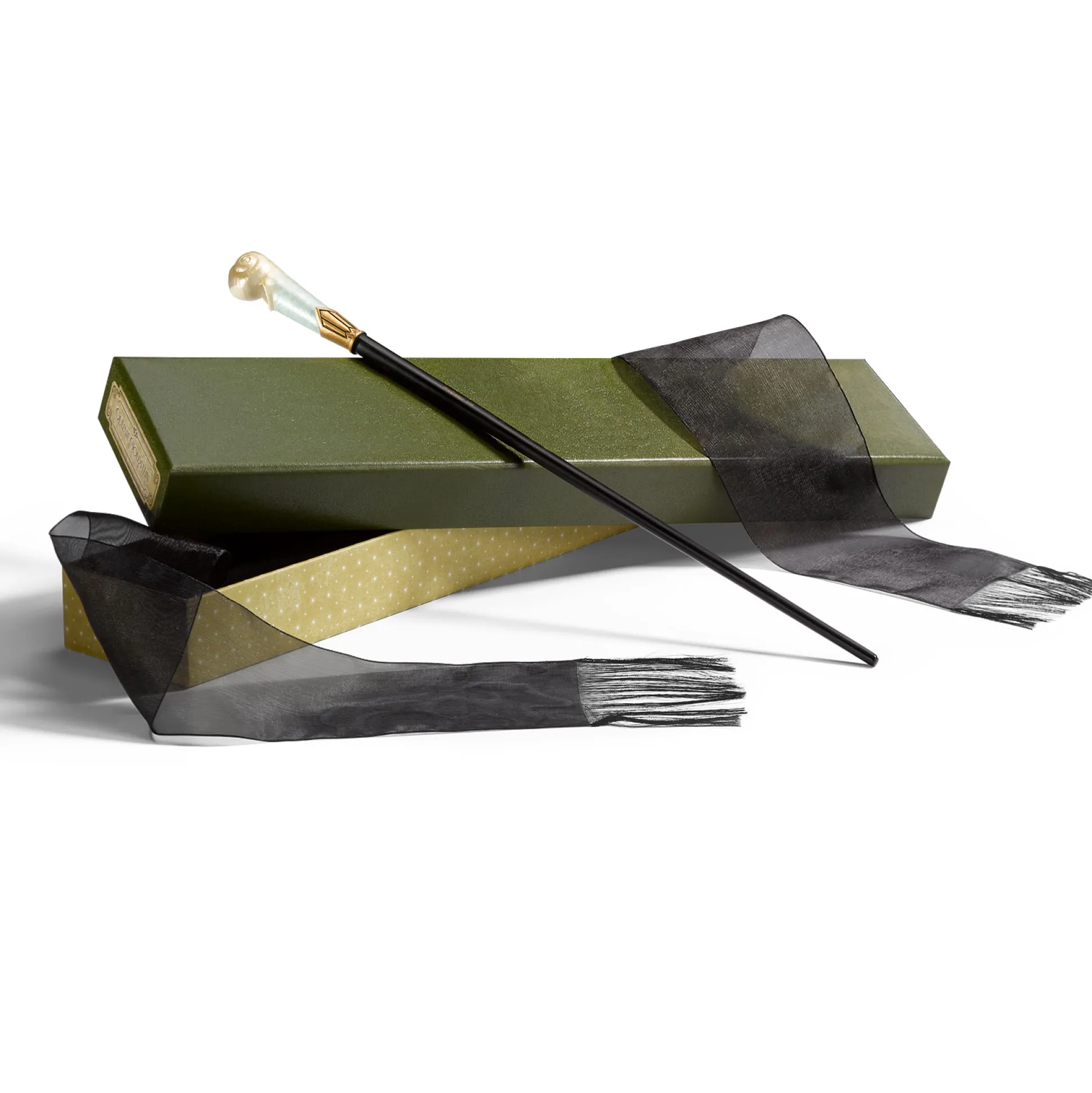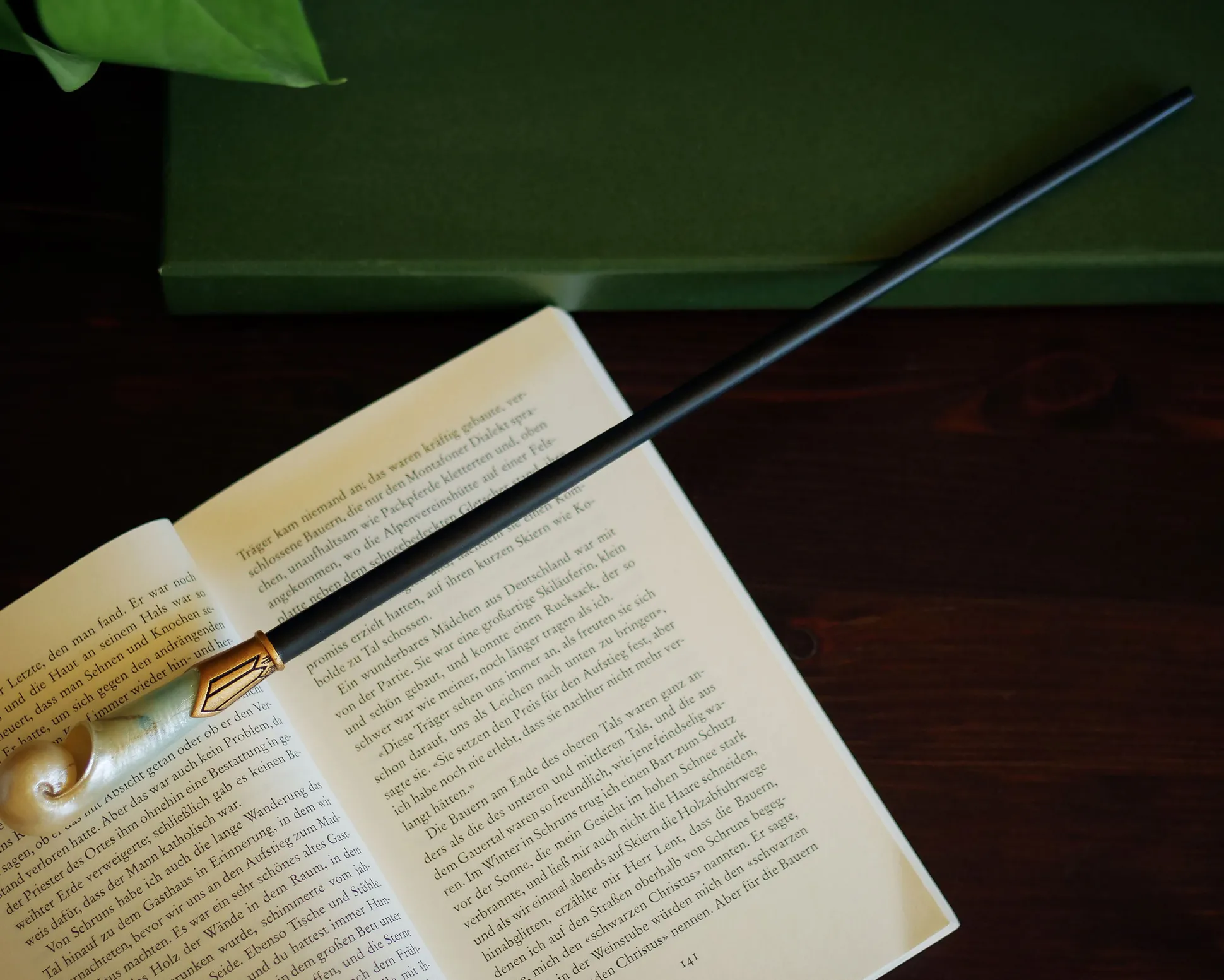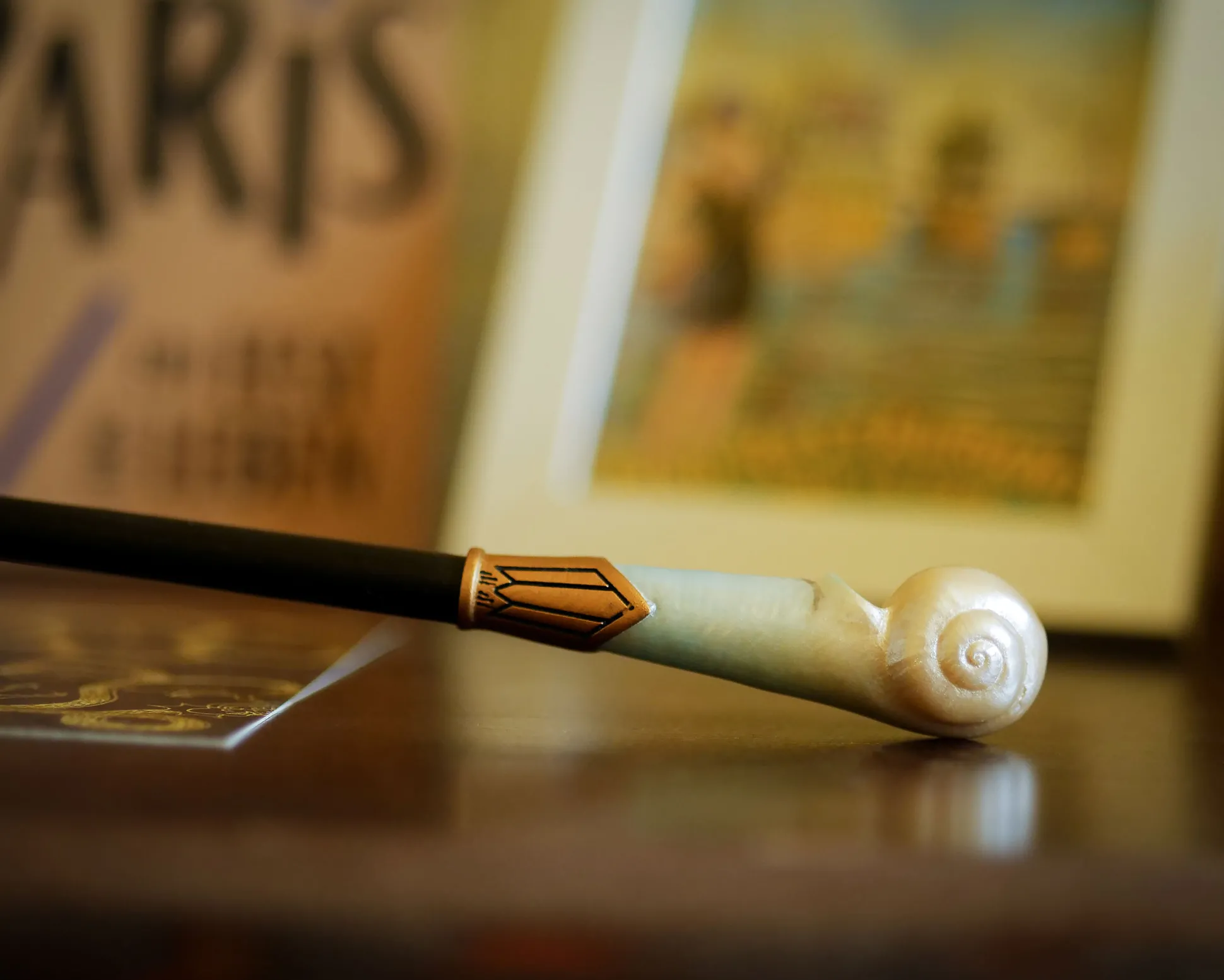 De toverstaf in art deco-stijl is slank en elegant zwart. Afgezet met een koperkleurige versiering, is het parelmoerachtige handvat van de toverstaf gevormd als een schelp, wat het een uniek verzamelobject maakt dat geen fan van Fantastische Beesten mag missen.