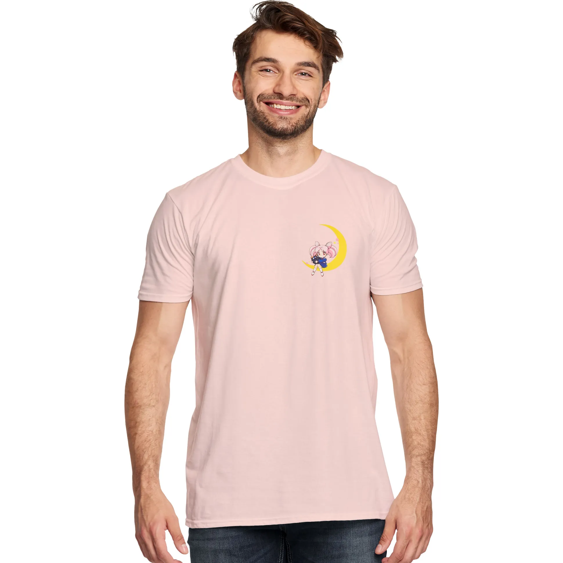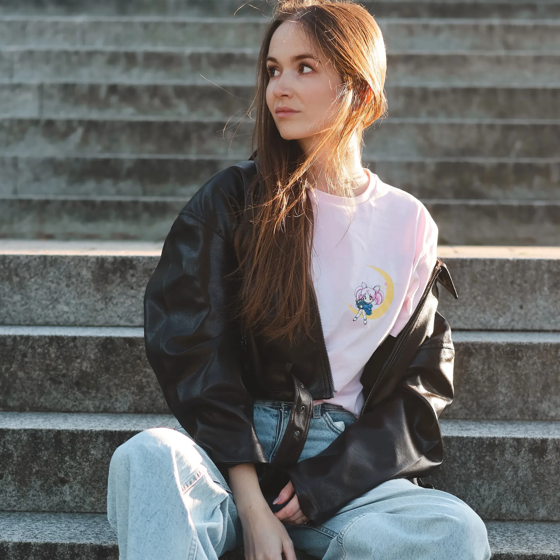 Voor iedereen die het Maanrijk in de kledingkast wil: het officieel gelicentieerde Sailor Moon T-shirt komt in roze en heeft voorop een kleine Chibiusa Tsukino-print — subtiel cute, dus overal draagbaar. Draai je om en je laat een groot Sailor Moon-logo op de rug zien — statement: check. Rechte pasvorm en ronde hals zorgen voor dagelijks draagcomfort. Perfect voor cons, koffie of Crystal Tokyo.