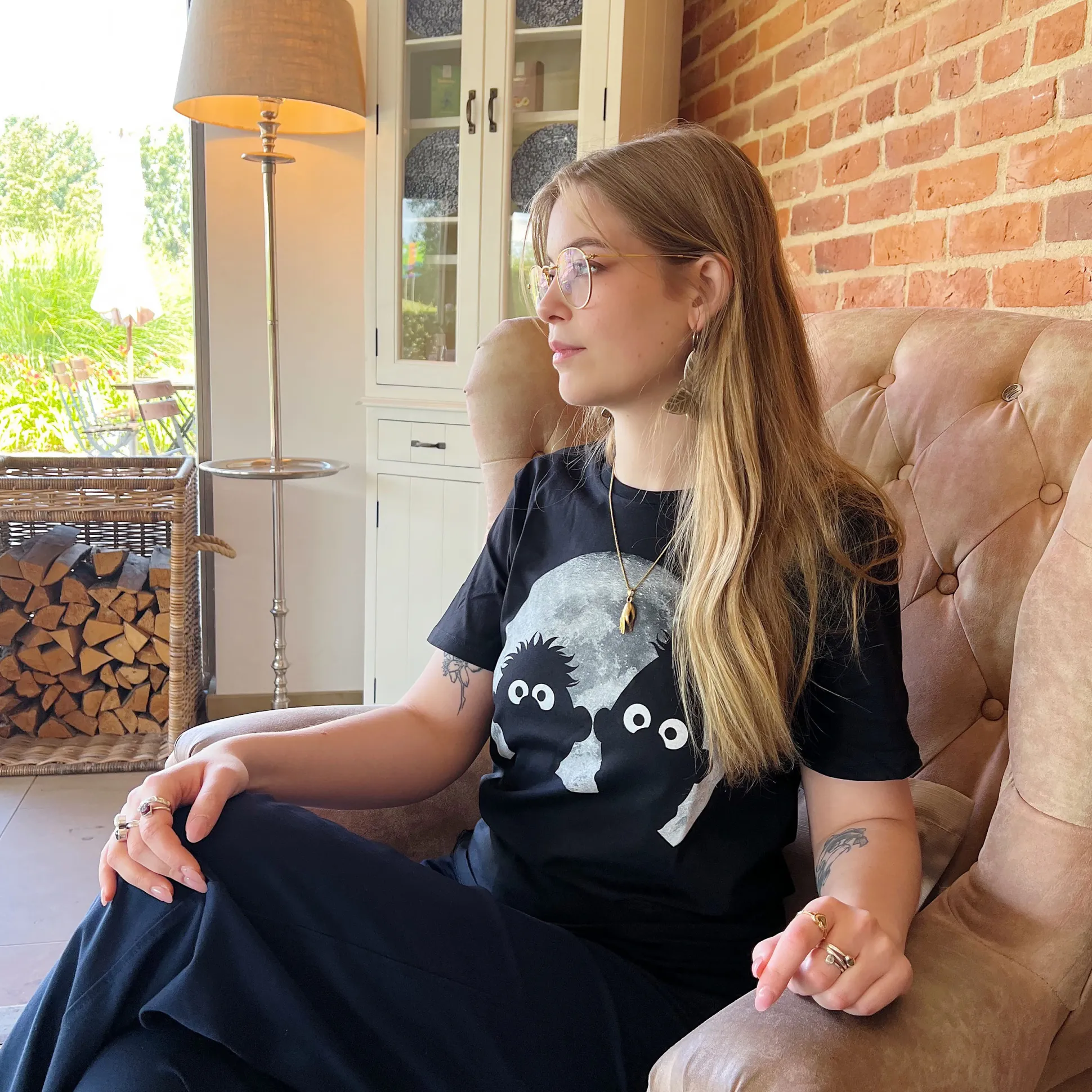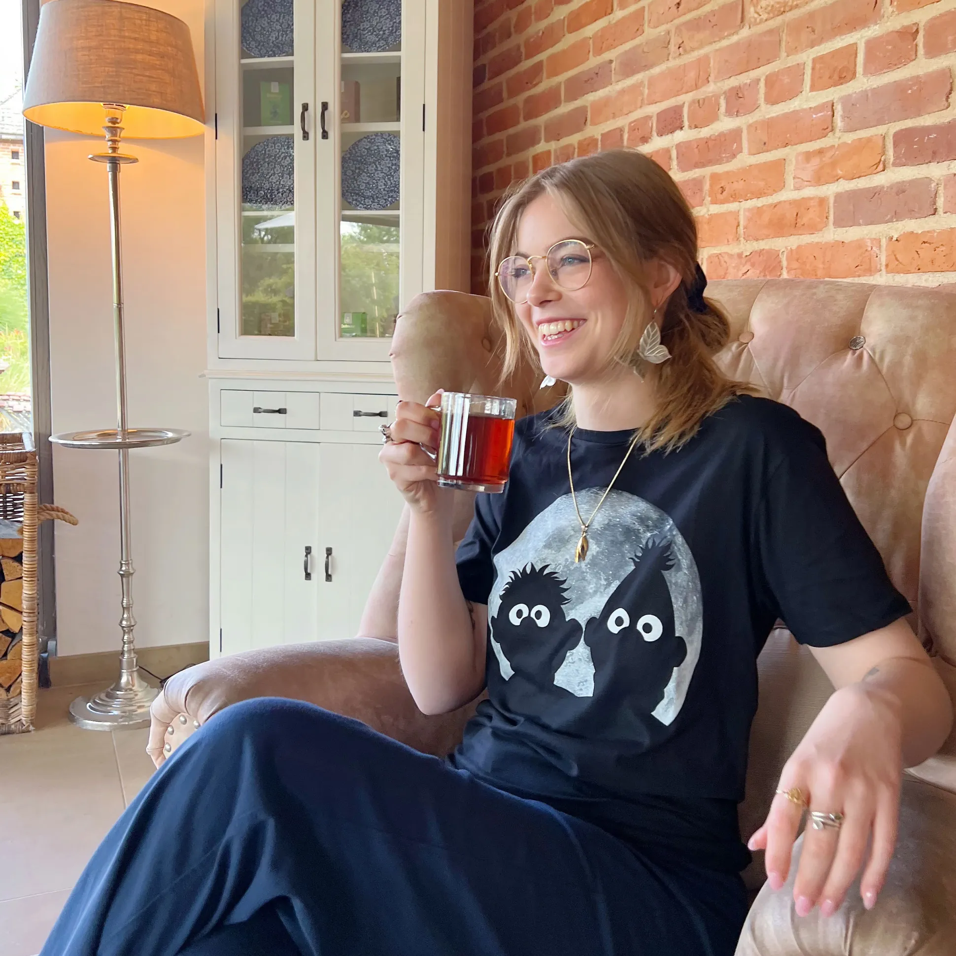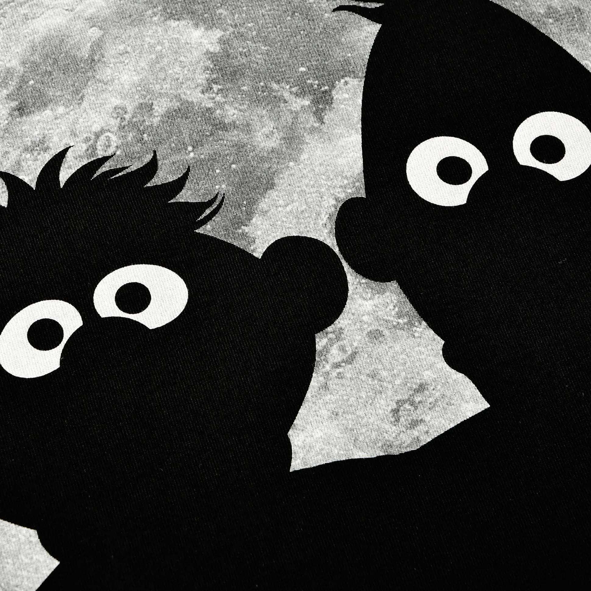 Ernie en Bert draaien de nachtdienst! Op dit officieel gelicentieerd Sesamstraat T-shirt schitteren de twee legendarische huisgenoten in het “Moonnight”-motief tegen zwart – perfect voor iedereen die bij maanlicht nog even rubberen eendjes telt. Comfortabel met rechte pasvorm en ronde hals matcht ’ie met jeans, joggers of die 2‑uur‑’s‑nachts tocht naar de koelkast. Zwarte kleur, sterk silhouet, discussie klaar: jouw statement voor bromance, huisgenotenfilosofie en iconische jeugdsentimenten. Pak de nachteditie van Ernie en Bert en draag ’m overal – Comic‑Con, bankmarathons of koekjesraids.