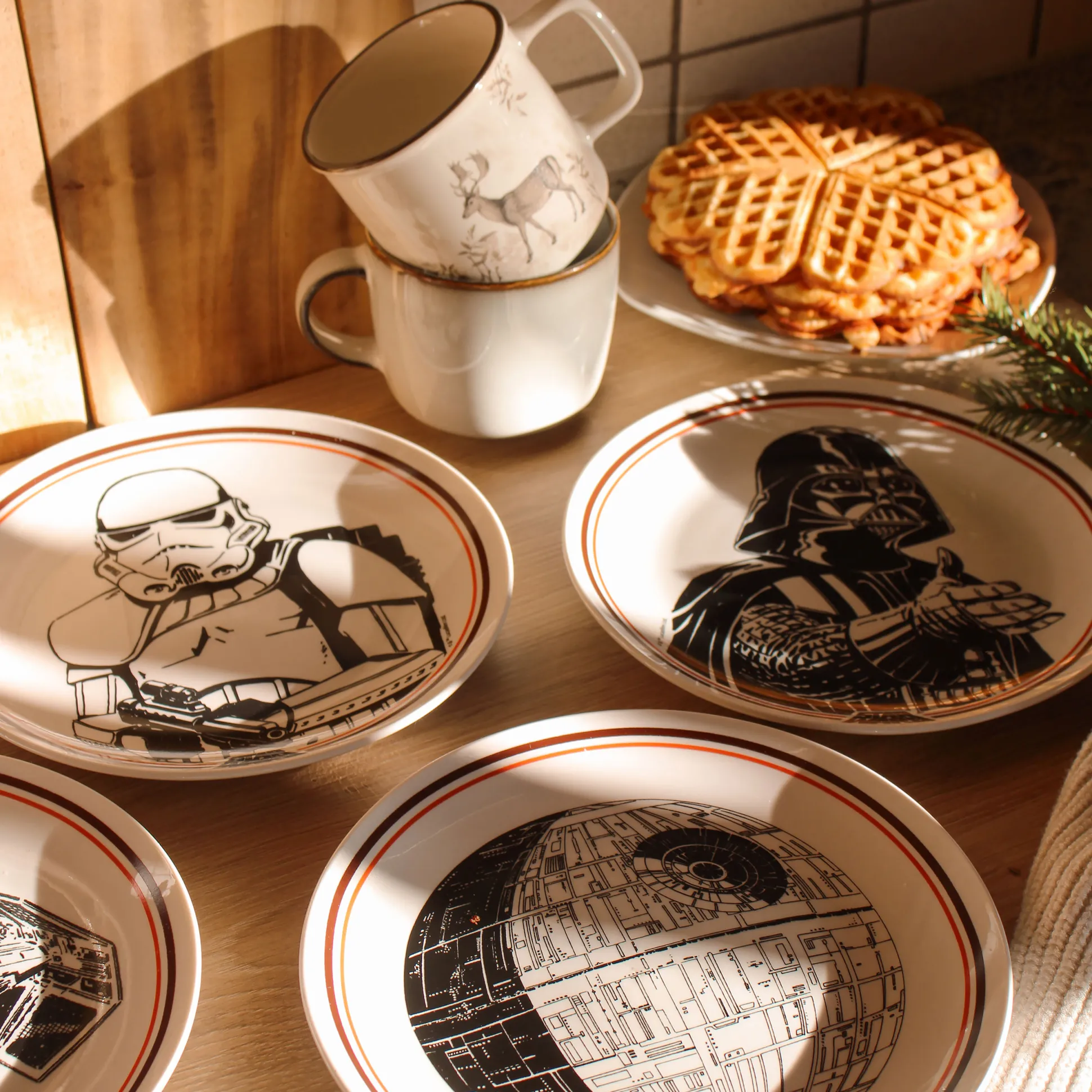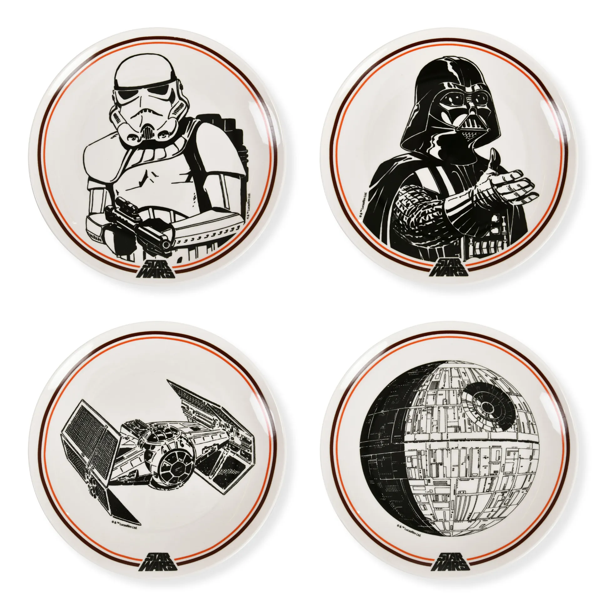 De trek slaat toe – en de Dark Side dekt de tafel. Deze officieel gelicentieerde Star Wars bordenset brengt vier iconische designs naar je keuken: Darth Vader, een Stormtrooper, de Death Star en Vaders TIE Advanced x1. Elk bord is 20 cm in diameter – perfect voor snacks, taart of pizzapunten tijdens je volgende saga-marathon. Vaatwasser- en magnetronbestendig, zodat jij kunt bingewatchen in plaats van boenen. Het perfecte cadeau voor iedereen die de Force niet kan weerstaan.
