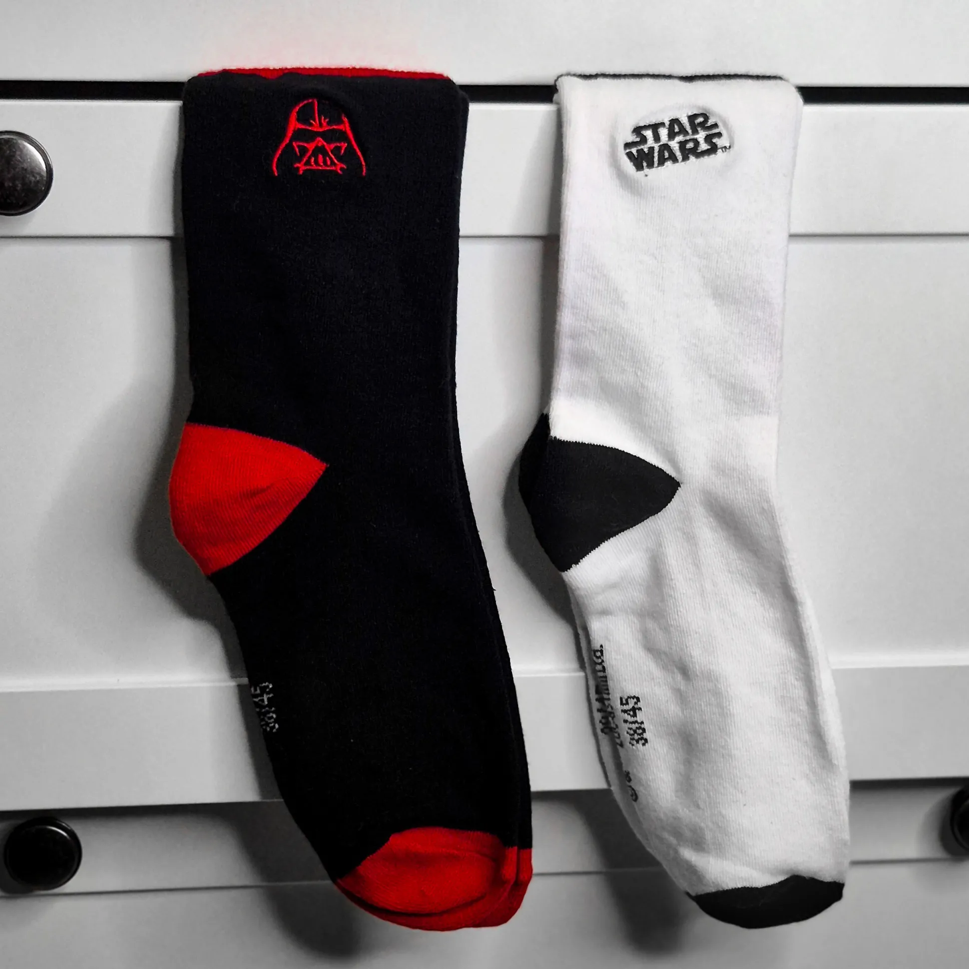 Met deze Star Wars sokken set van 2 haal je de donkere kant rechtstreeks in je lade – inclusief Star Wars-logo en Darth Vader. Twee paar sokken, één duidelijke boodschap: wie deze sokken draagt, loopt niet, maar schrijdt als een Sith Lord door de woonkamer.