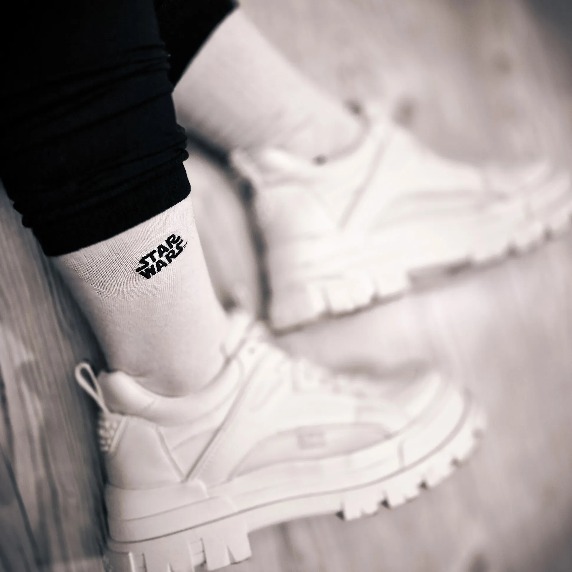 De geborduurde motieven zijn strak en niet zomaar erop gedrukt, de stevige boorden zorgen dat alles goed blijft zitten (ook tijdens die epische tochten naar de koelkast) en de contrasterende hiel en teen geven je voeten een flinke dosis galactische stijl in plaats van standaard-sokken-saaierij.