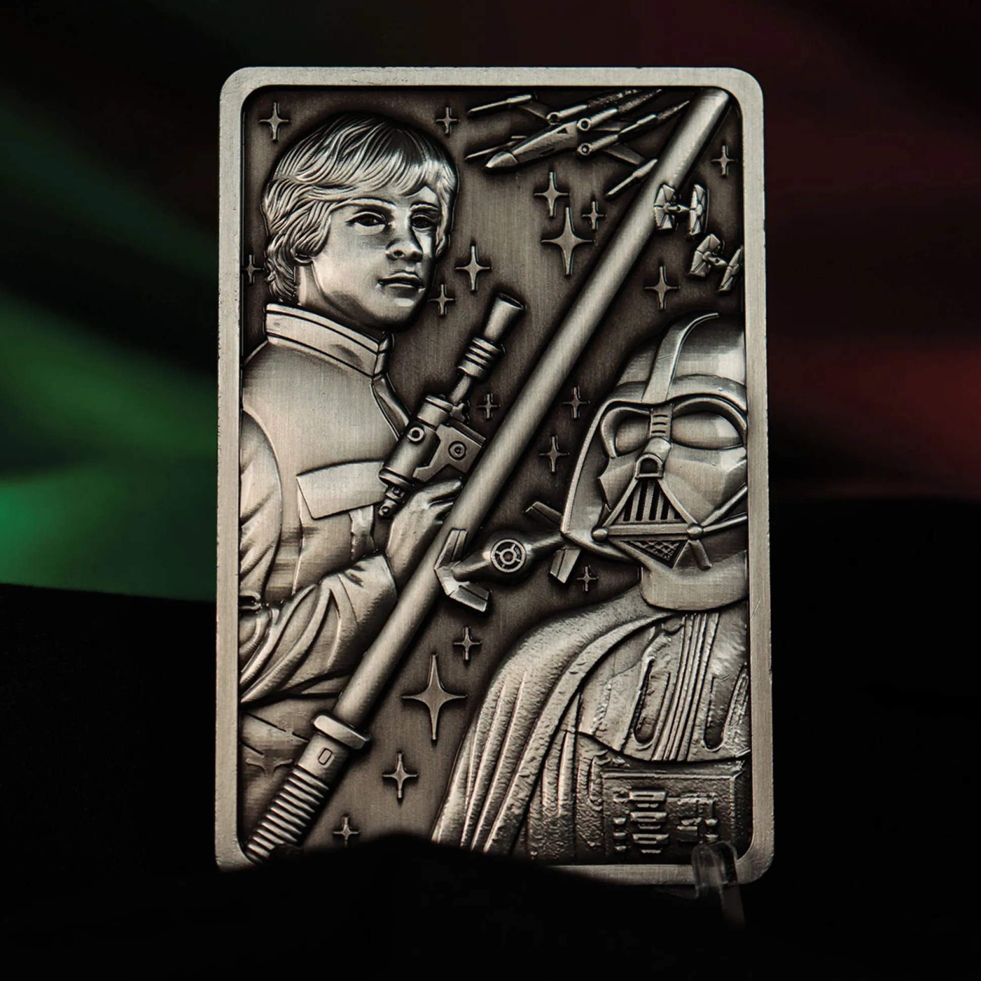 Moge de Kracht met je zijn – en je plank stralen! Met de beperkte Star Wars Metal Bar Replica haal je een echt stukje galactische geschiedenis in huis. Met het epische ontwerp van Luke Skywalker en Darth Vader verenigt deze bar de lichte en donkere kant van de Kracht – perfect voor degenen die niet kunnen kiezen. De achterkant toont een gegraveerd Star Wars-logo, zodat iedereen weet dat je een echte fan bent.