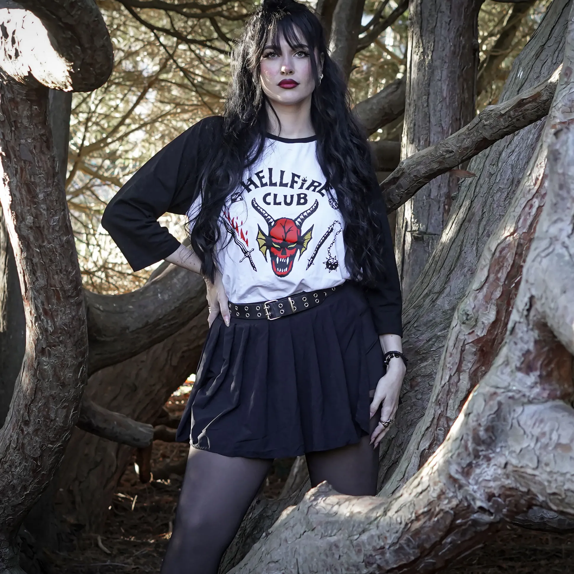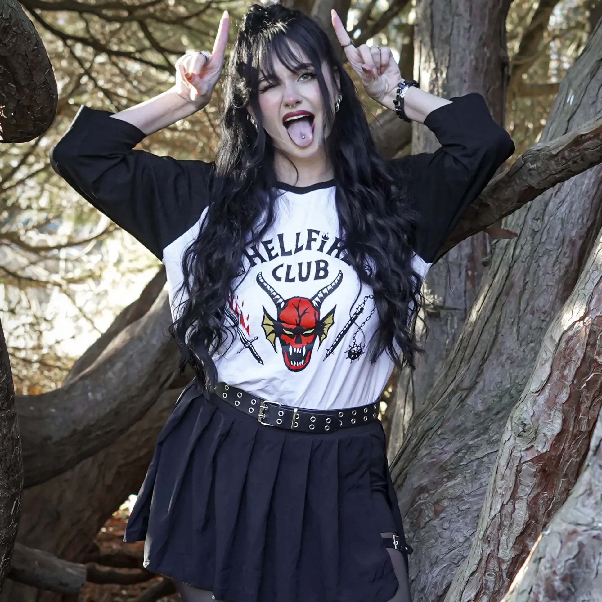 Details: officieel gelicentieerd, groot Hellfire Club-logo met inscriptie, contrasterende 3/4-mouwen, rechte pasvorm, ronde hals, kleuren wit/zwart.