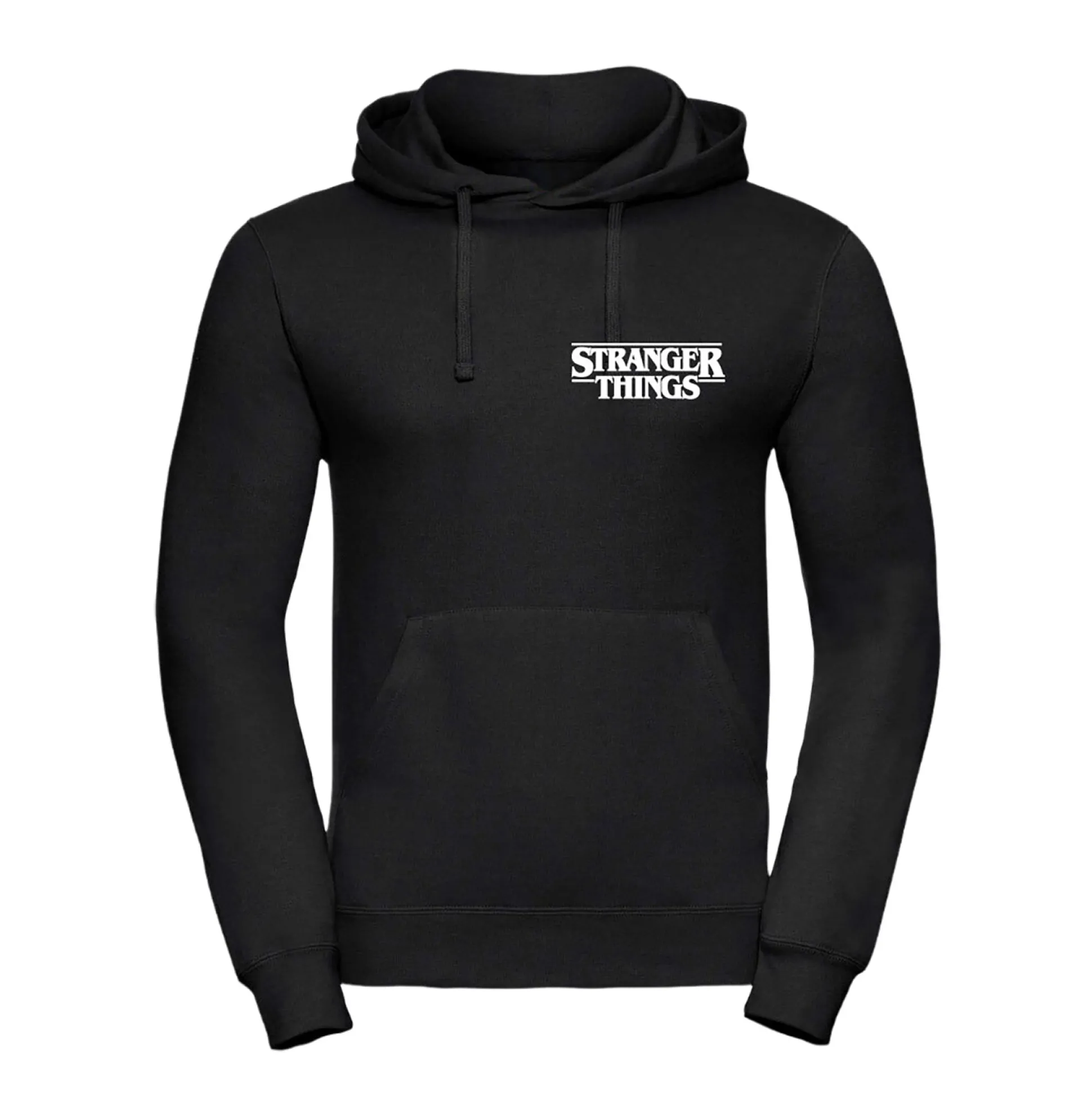 De hoodie komt in klassiek zwart, zodat de print extra opvalt en je ’m met alles kunt combineren – of je nu op Demogorgon-jacht gaat of een bingesessie op de bank plant. De capuchon met trekkoord beschermt je tegen plotselinge temperatuurschommelingen (of onverklaarbare rillingen), terwijl de buidelzak voorop alles bewaart wat je nodig hebt: telefoon, snacks, walkman, Dungeons & Dragons-dobbelstenen.