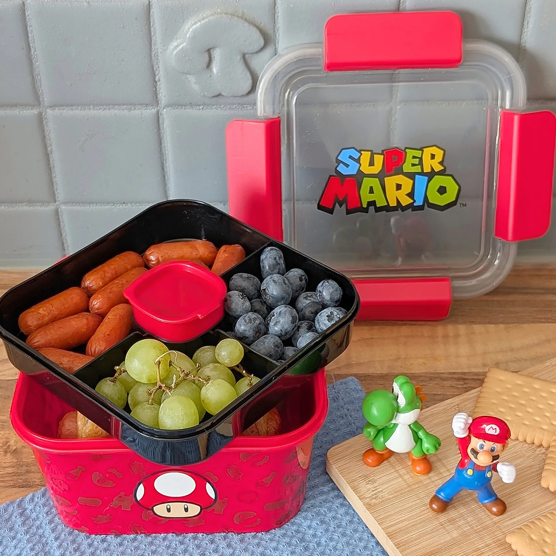 Mamma Mia! Met de officieel gelicentieerde Super Mario – Symbols Bento Lunchbox ben jij de ster van de lunchpauze! Deze dubbeldeks lunchbox is niet alleen een lust voor het oog met zijn iconische Super Mario-symbolen en logo, maar ook een organisatorisch wonder. Dankzij het uitneembare inzetstuk met 3 vakken en een extra sausbakje blijft jouw eten precies waar het hoort – geen rommel, geen gedoe, alleen maar puur plezier! Met een inhoud van 1810 ml biedt het genoeg ruimte voor jouw power-ups, of het nu salades, snacks of lekkere traktaties zijn. De compacte afmetingen van 17 x 10 x 17 cm maken het perfect voor onderweg – naar kantoor, school of het Paddenstoelenrijk. Pak deze lunchbox en breng een stukje Super Mario-avontuur in je dagelijks leven. Level up je lunchpauze – Let’s-a-go!