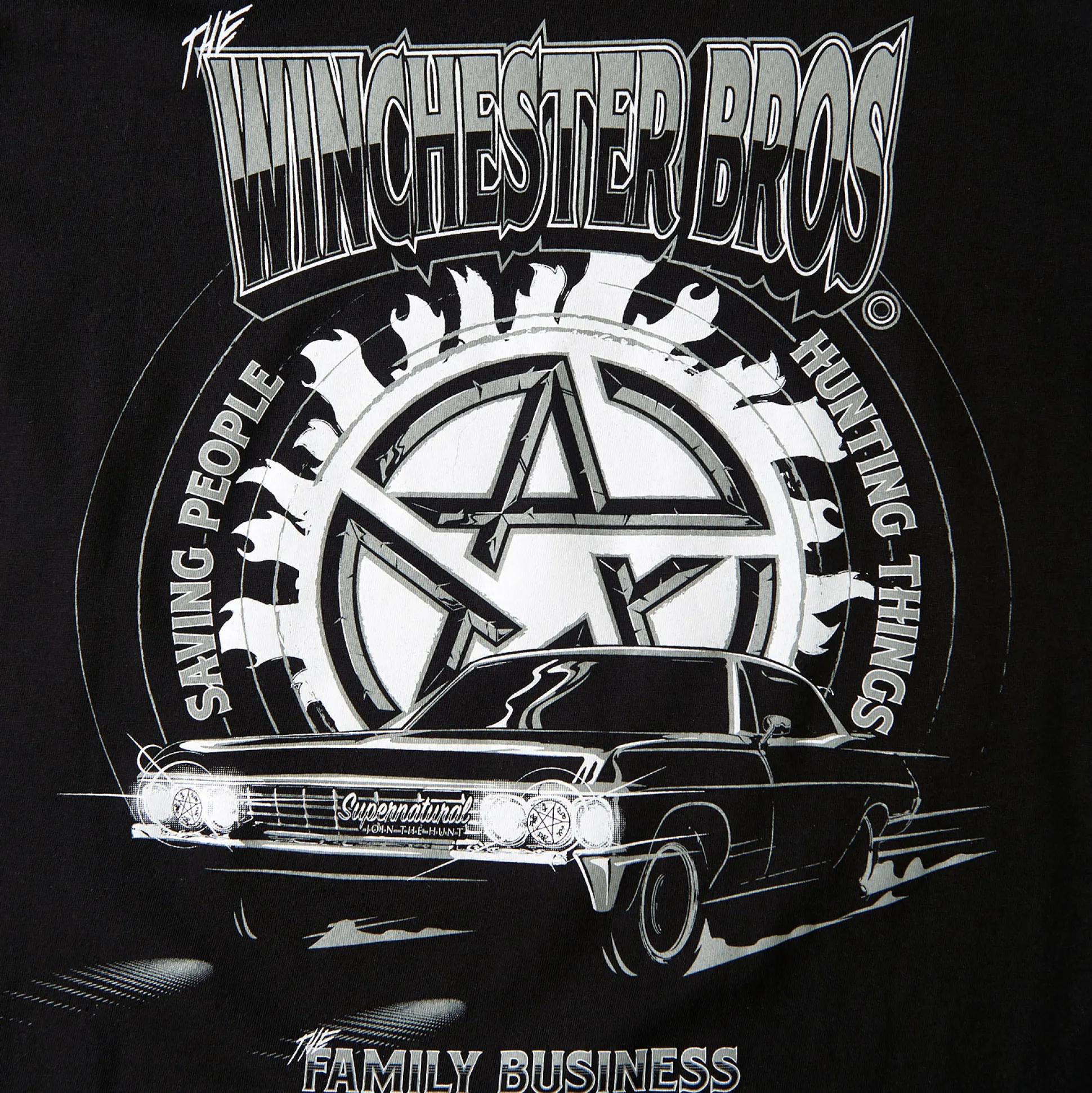 Zout en ijzer houden demonen op afstand, maar alleen het legendarische Winchester Bros T-shirt verjaagt saaie kledingstukken uit je kast! Dit officiële Supernatural shirt met opvallende frontprint laat iedereen zien: jij hoort bij Team Sam & Dean—of je nu jacht maakt op geesten of op zoek bent naar een flinke punt taart. Klassiek zwart, relaxte rechte pasvorm en coole ronde hals: hier ontmoeten fanhart en streetstyle elkaar. Voor een bovennatuurlijk gave look heb je geen pentagram nodig, alleen een Winchester-shirt!