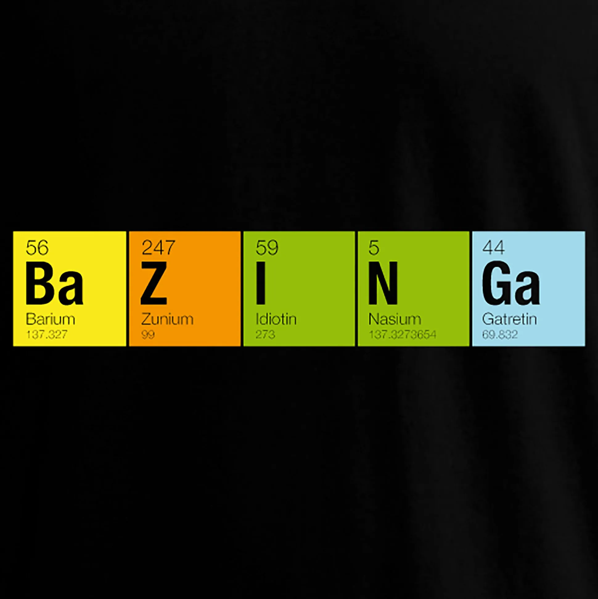 Dit fan T-shirt beeldt Bazinga uit in period system; Dr. Dr. Sheldon Lee Cooper zou er een velddag mee hebben – en jij hopelijk ook!